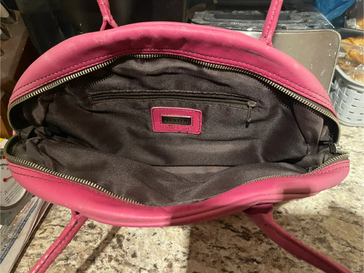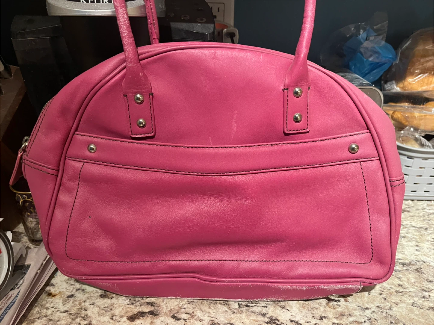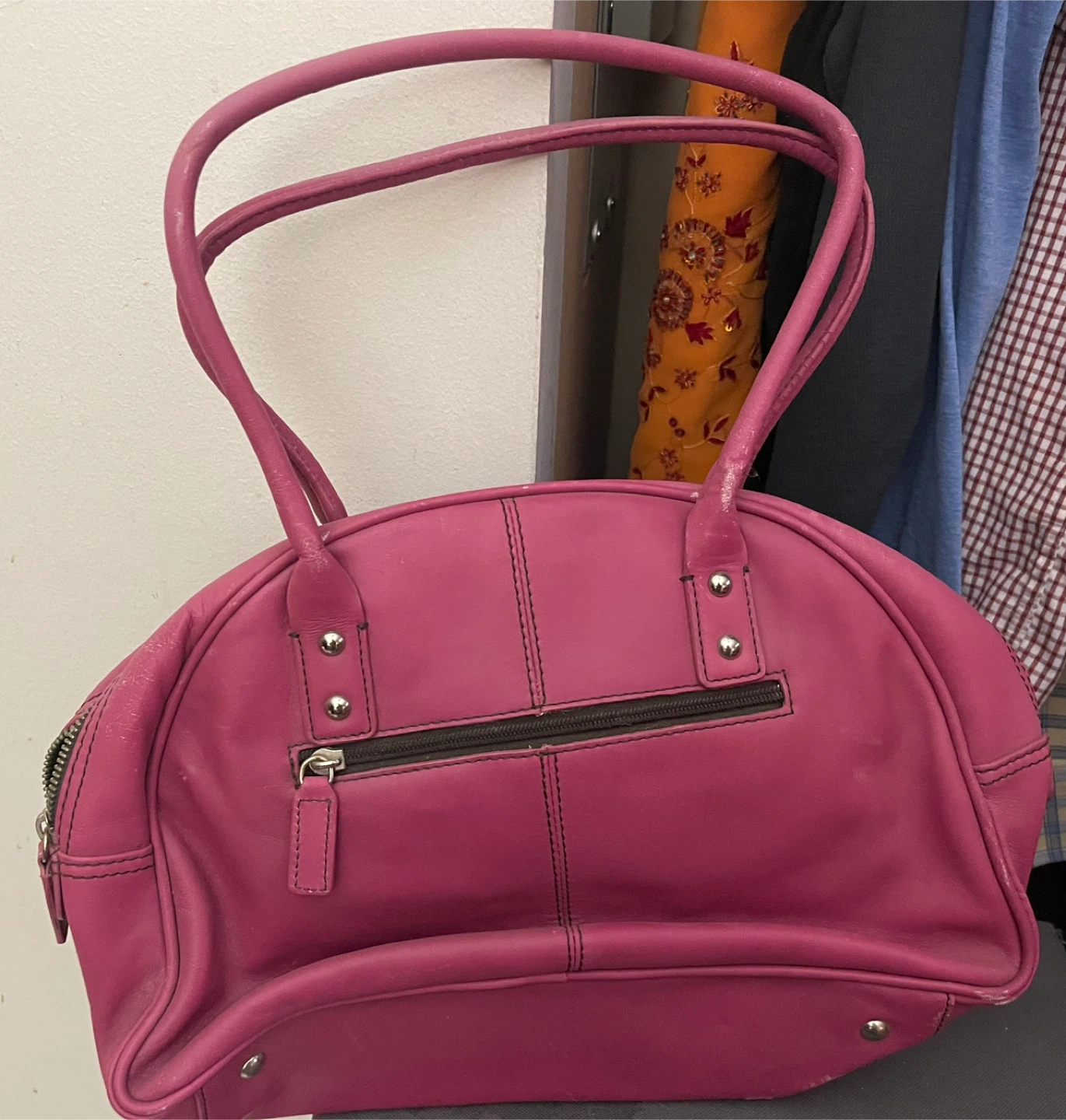 Selling a Danier handbag made of genuine leather! It's a lovely pink colour. There are some signs of wear, but it's still a great bag or purse to use. Side pockets on front and back.