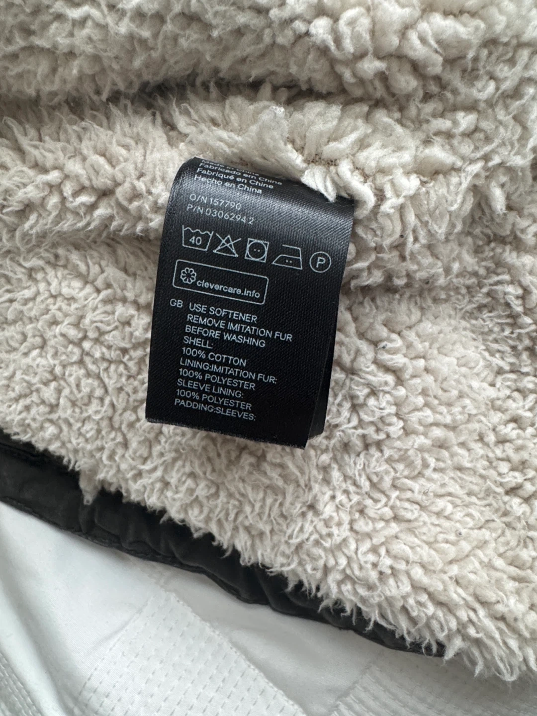This is a cozy H&M winter parka in olive green. It has a faux fur-lined hood and a sherpa lining to keep you warm during the colder months. It's in great condition and ready for a new owner!