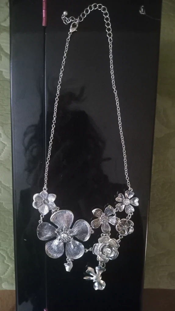 This is a lovely silver-tone statement necklace featuring a floral design. It's perfect for adding a touch of elegance to any outfit. The necklace has a chain with an adjustable clasp for a comfortable fit.