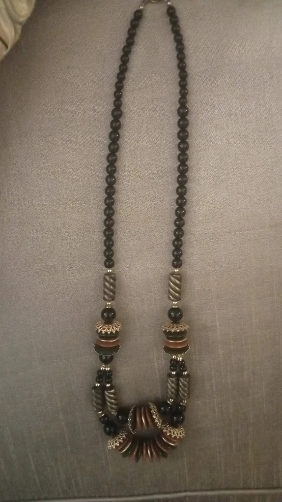 This is a unique statement necklace with black beads and decorative silver and brown accents. It's in great condition and ready to add some flair to your wardrobe!