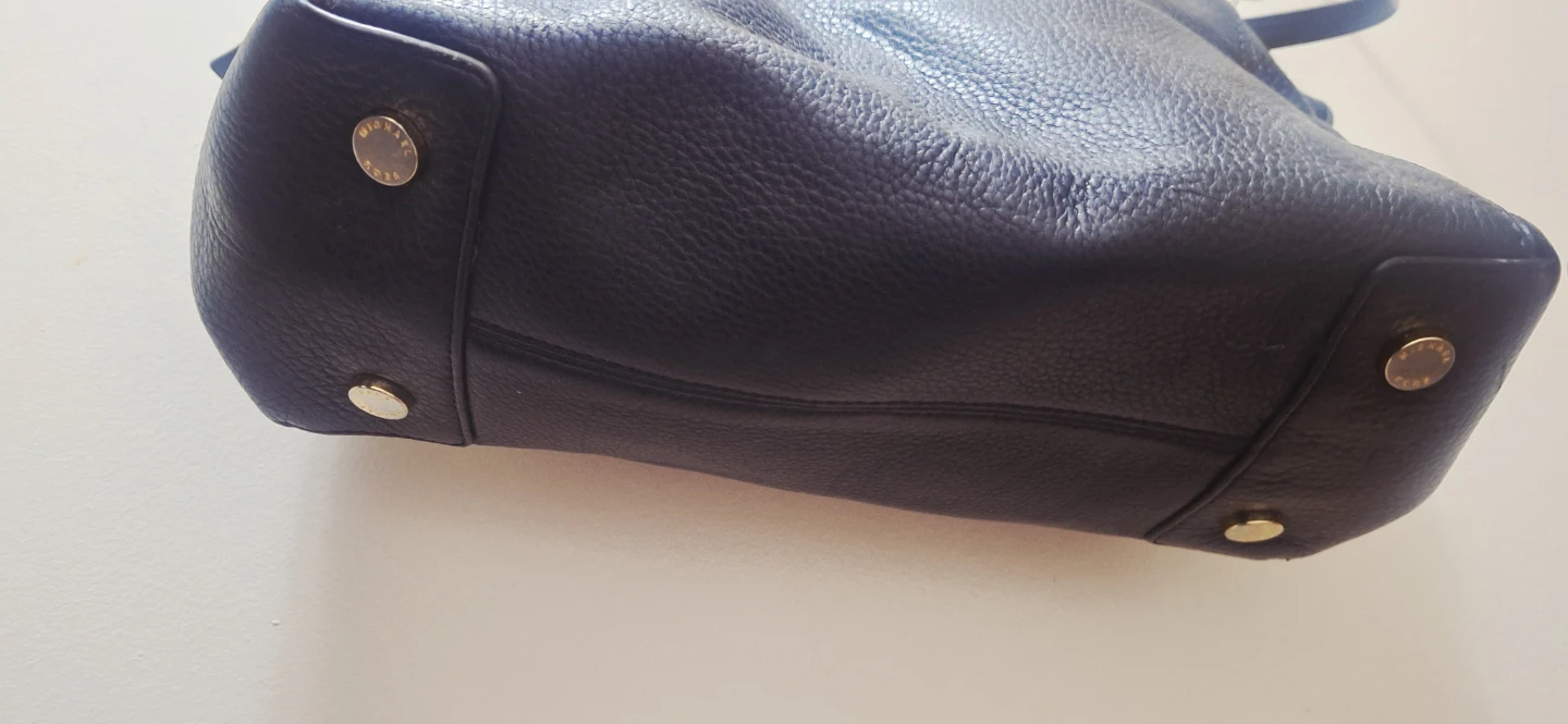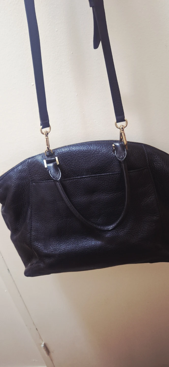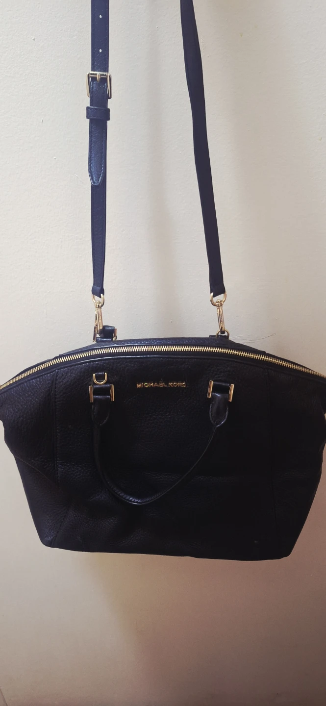 This is a gently used Michael Kors satchel in black leather. It's a stylish and versatile bag, perfect for everyday use. It has a classic design with gold-tone hardware and a detachable shoulder strap.
