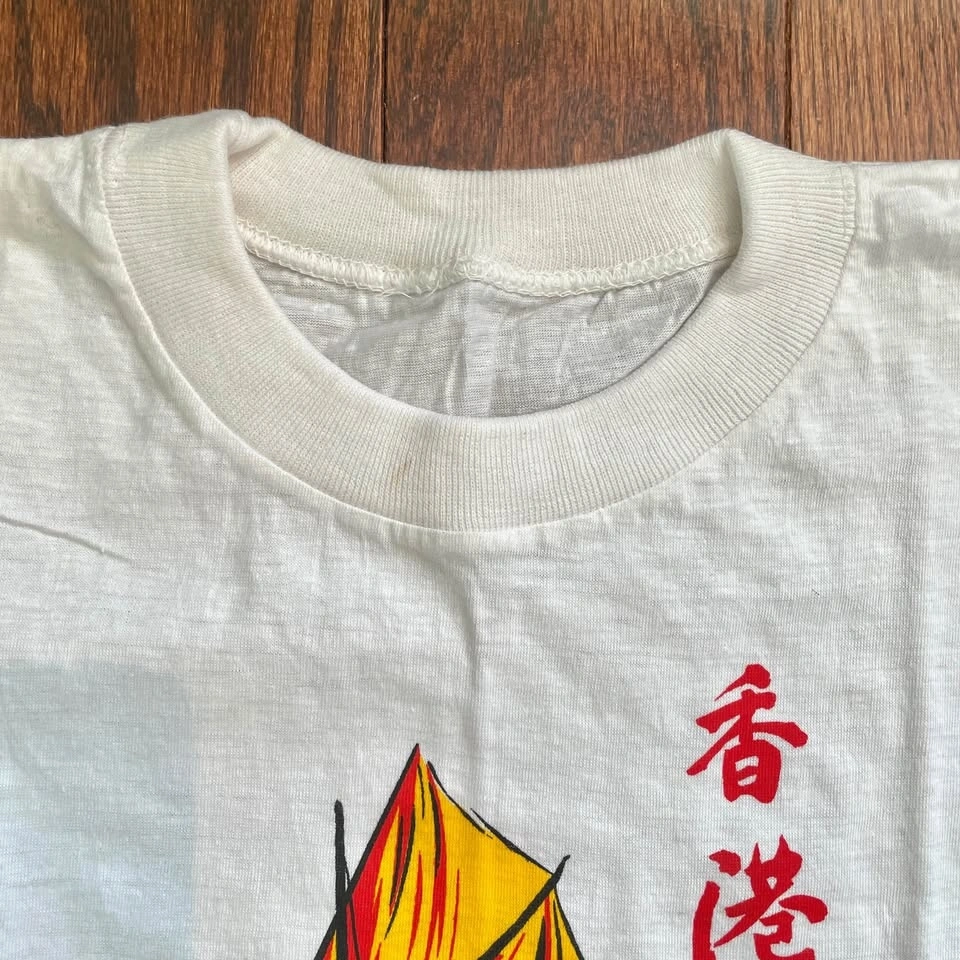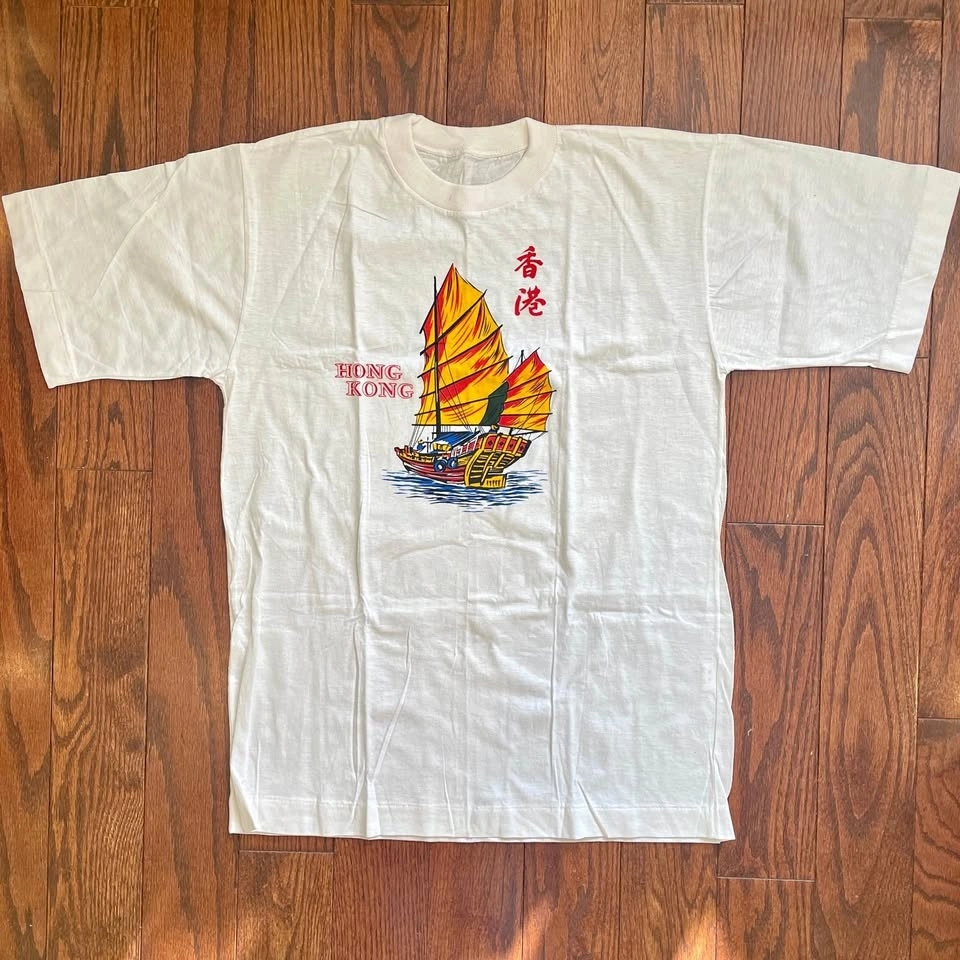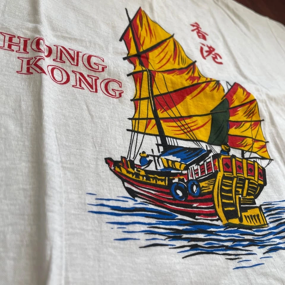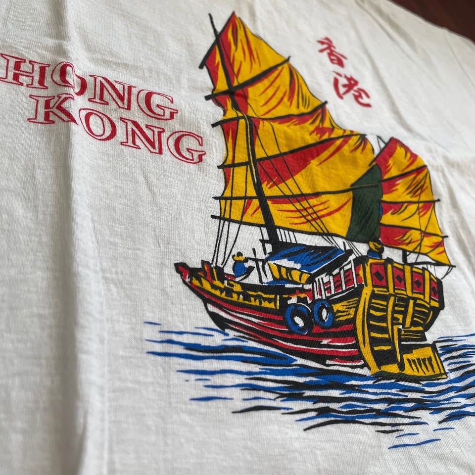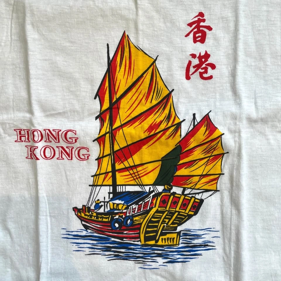Classic 1980s–1990s Hong Kong T-shirt featuring the iconic red-sail Chinese junk boat in Victoria Harbour.