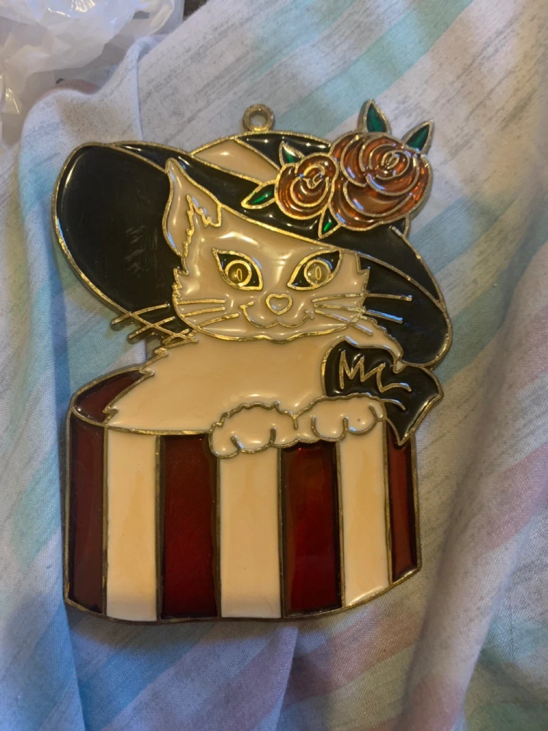 Selling a vintage cat ornament. It features a charming cat wearing a stylish hat adorned with roses, sitting in a striped box. This unique piece would be a lovely addition to any collection or as a decorative accent in your home