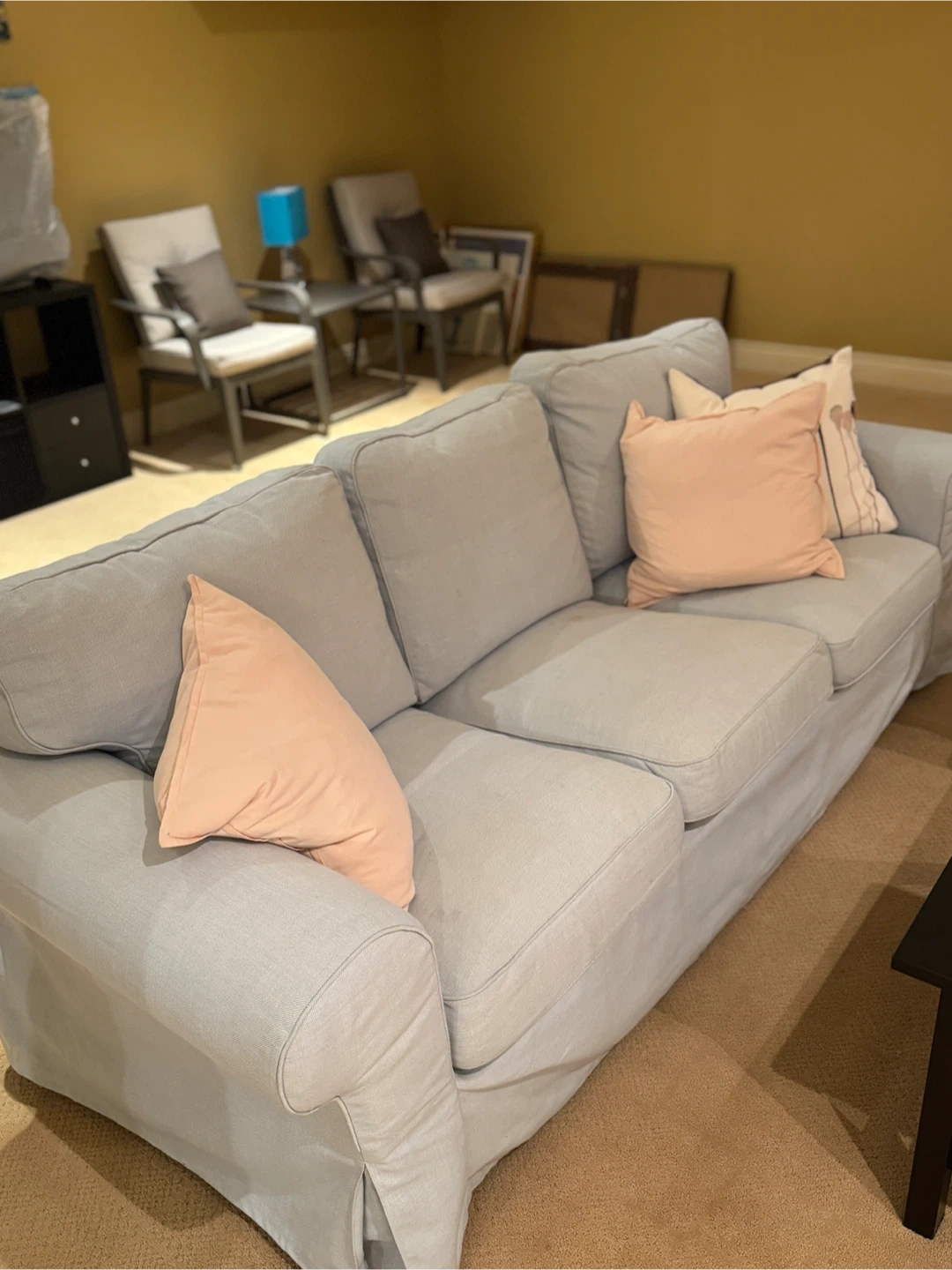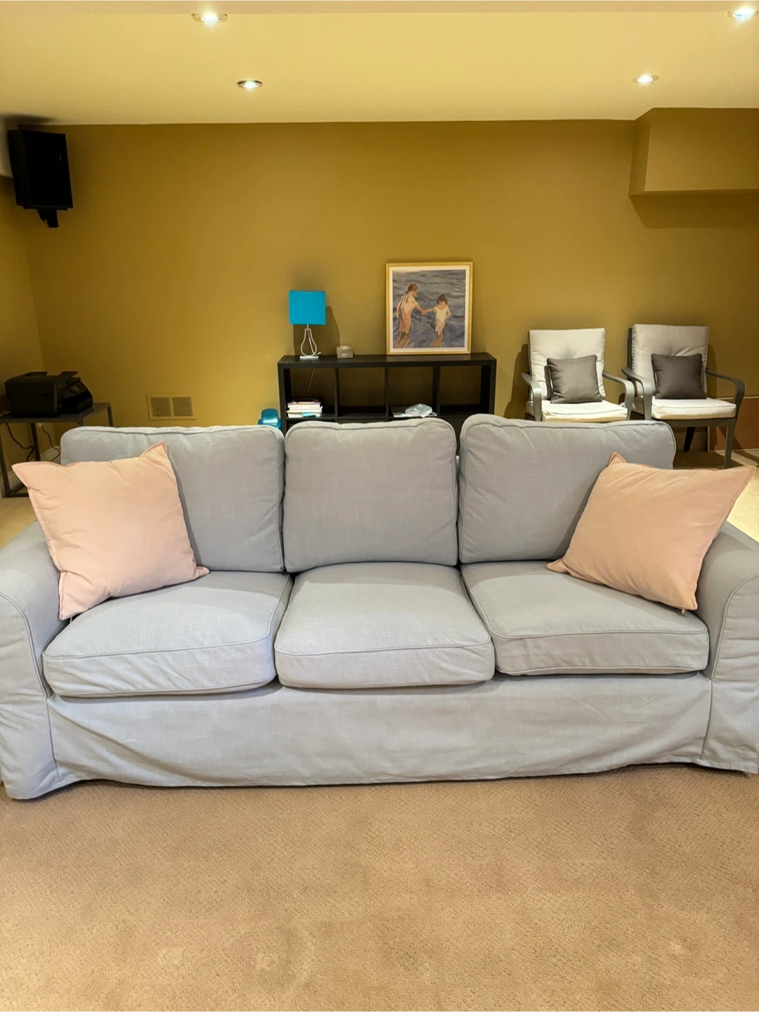 Selling a gently used IKEA Ektorp 3-seat sofa in a light blue colour. It's in great shape and super comfy! The dimensions are approximately 85 7/8" (218 cm) in width, 34 5/8" (88 cm) in depth, and 34 5/8" (88 cm) in height. Perfect for a living room or den!