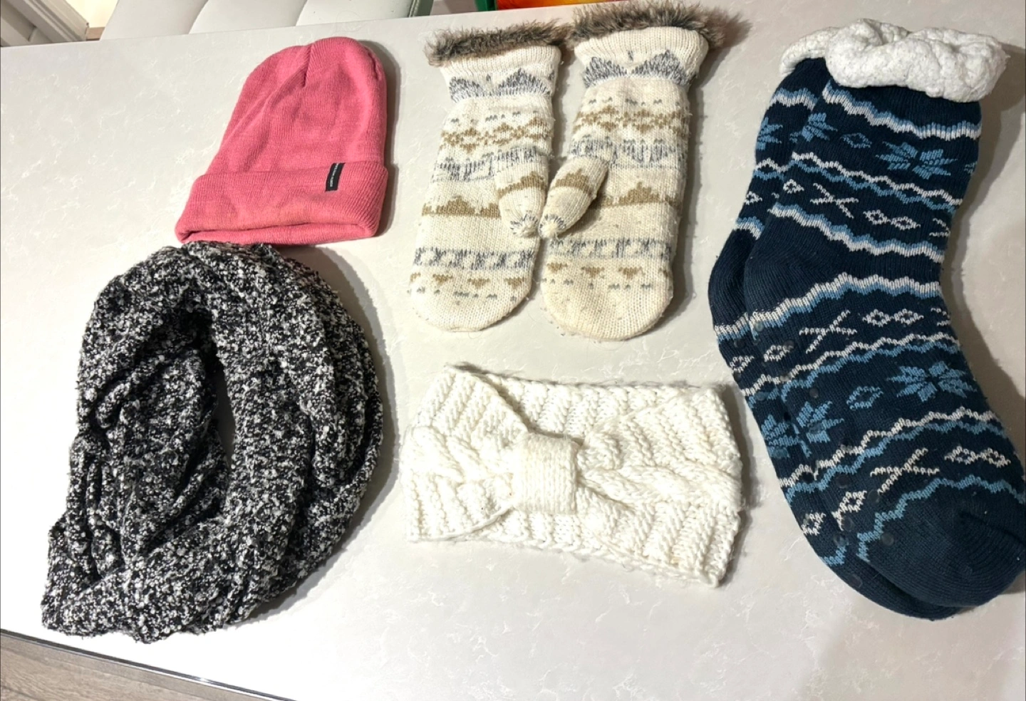 Gently used. Includes hat, scarf, mittens, headband and fuzzy socks. Giving away all together, not individually. Please only message if you need these items. Not for resale.