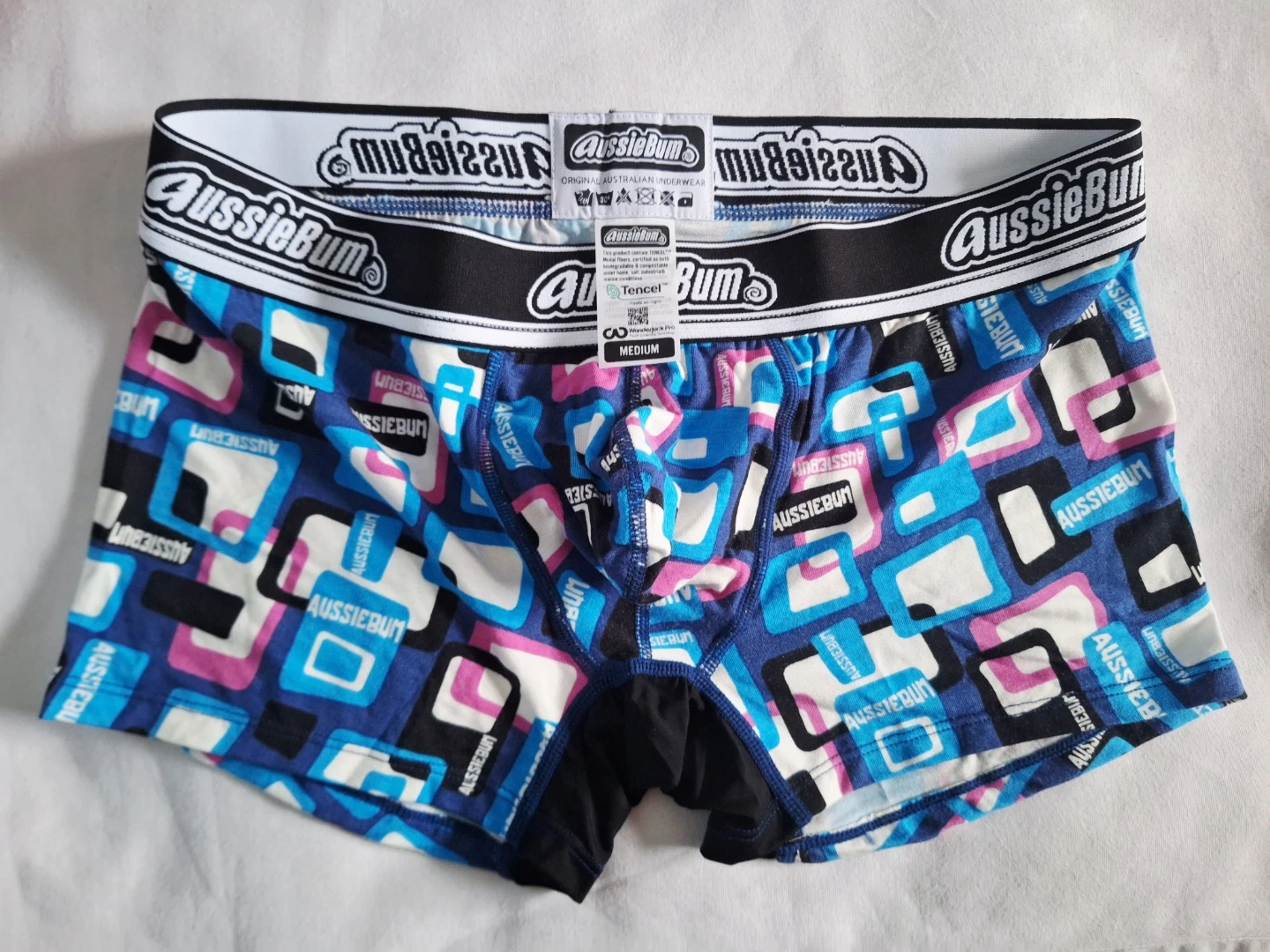 π§‘ Selling a new AussieBum underwear with a fun, geometric pattern in shades of blue, pink, and white. The waistband features the AussieBum logo. Size is Medium.