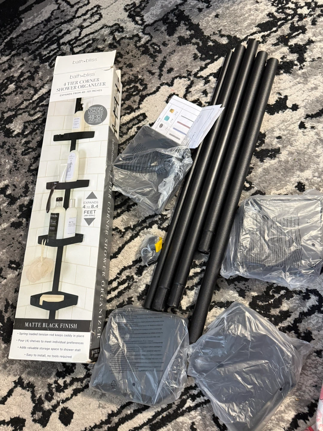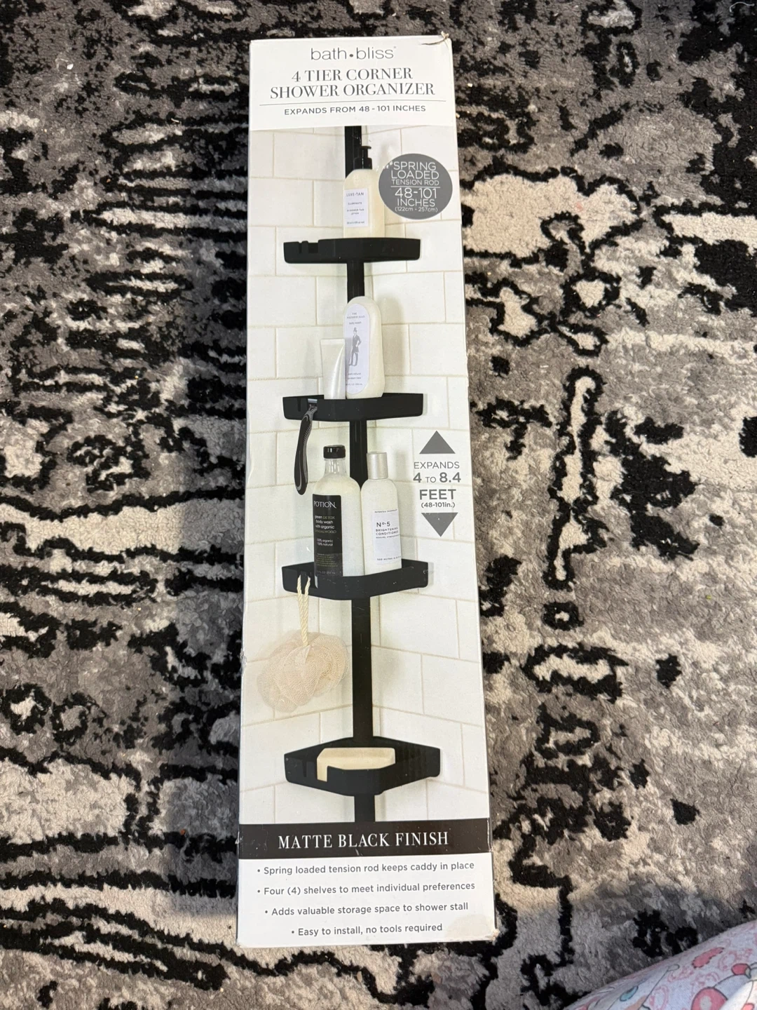 I'm selling a Bath Bliss 4-Tier Corner Shower Organizer in matte black finish. It expands from 48 to 101 inches (4 to 8.4 feet). This organizer features a spring-loaded tension rod to keep the caddy in place, four shelves to meet individual preferences, and adds valuable storage space to your shower stall. It's easy to install, with no tools required!