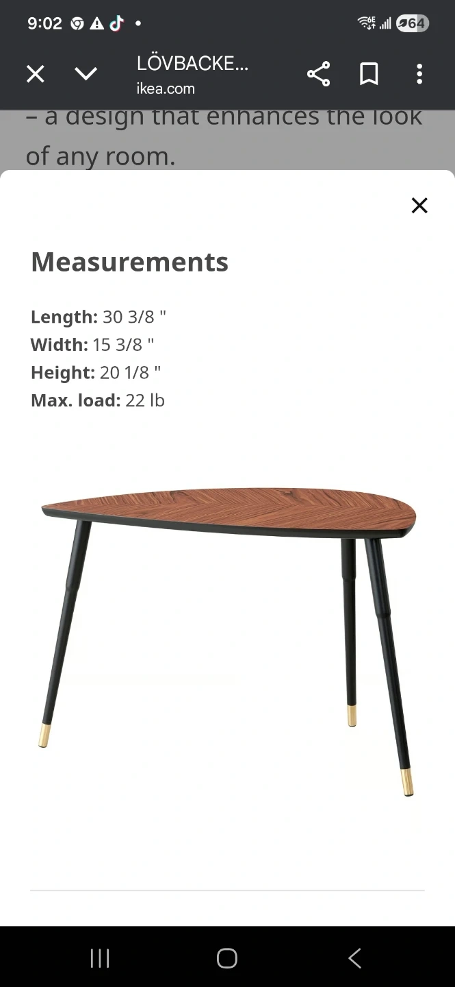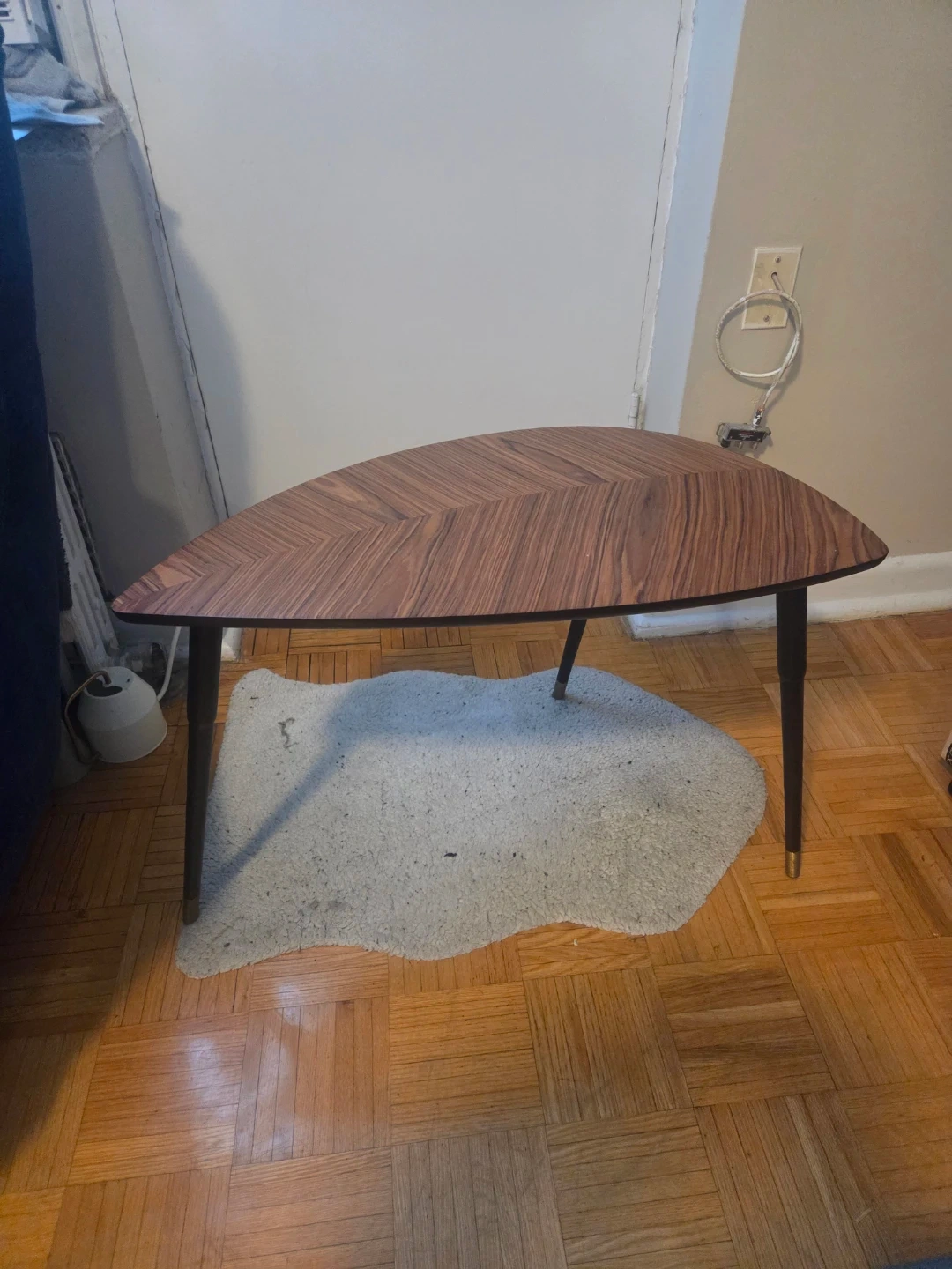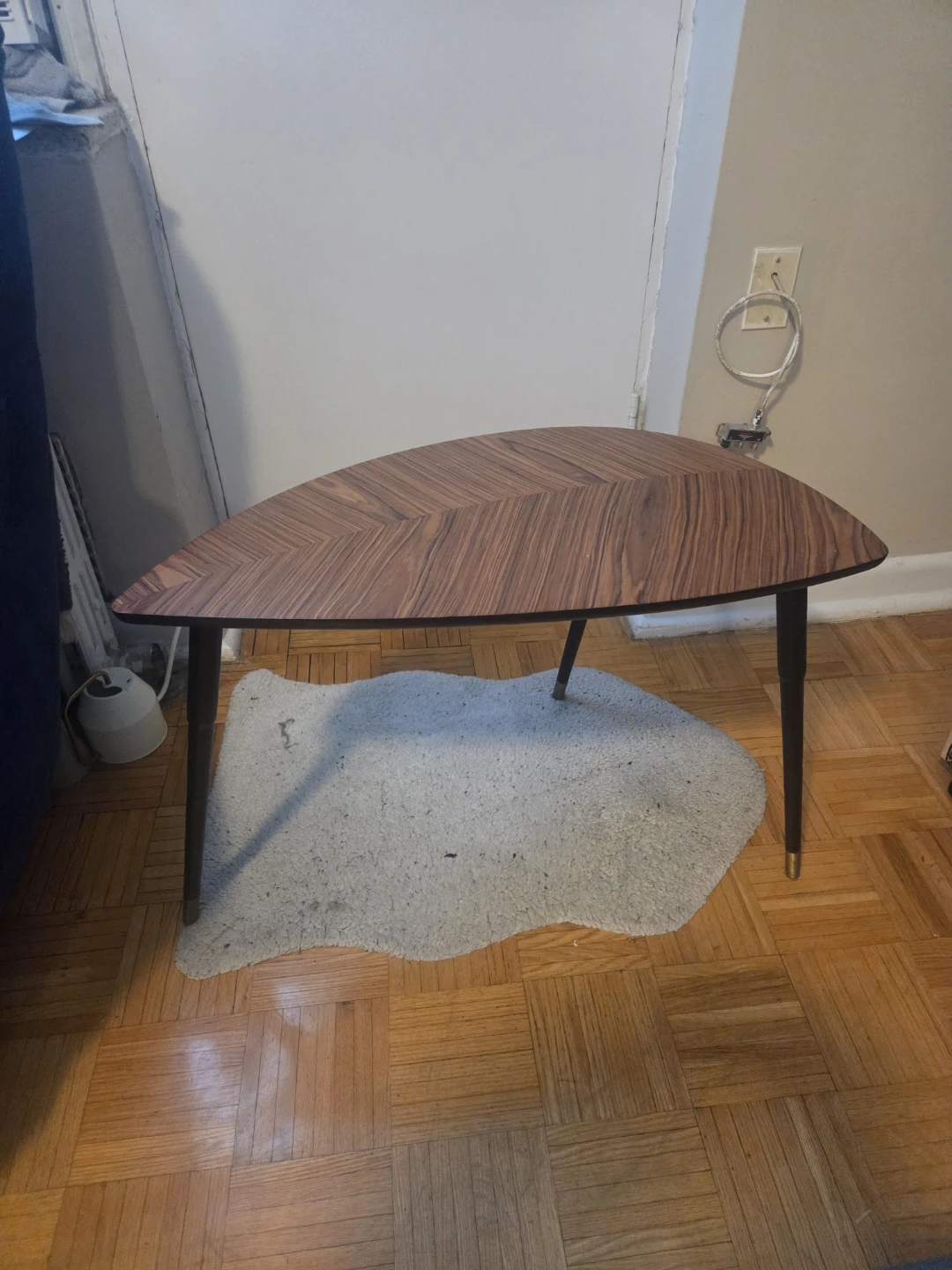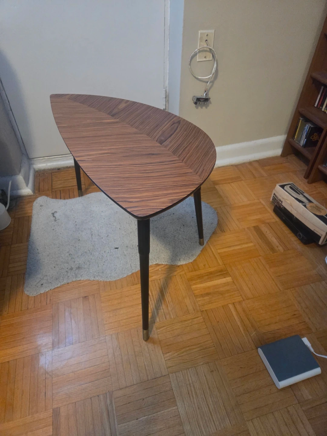 Selling a LÖVBACKEN side table from IKEA in excellent condition! This stylish table features a distinctive leaf-shaped top with a beautiful wood grain pattern and sleek black legs. It's perfect for adding a touch of mid-century modern charm to any room.