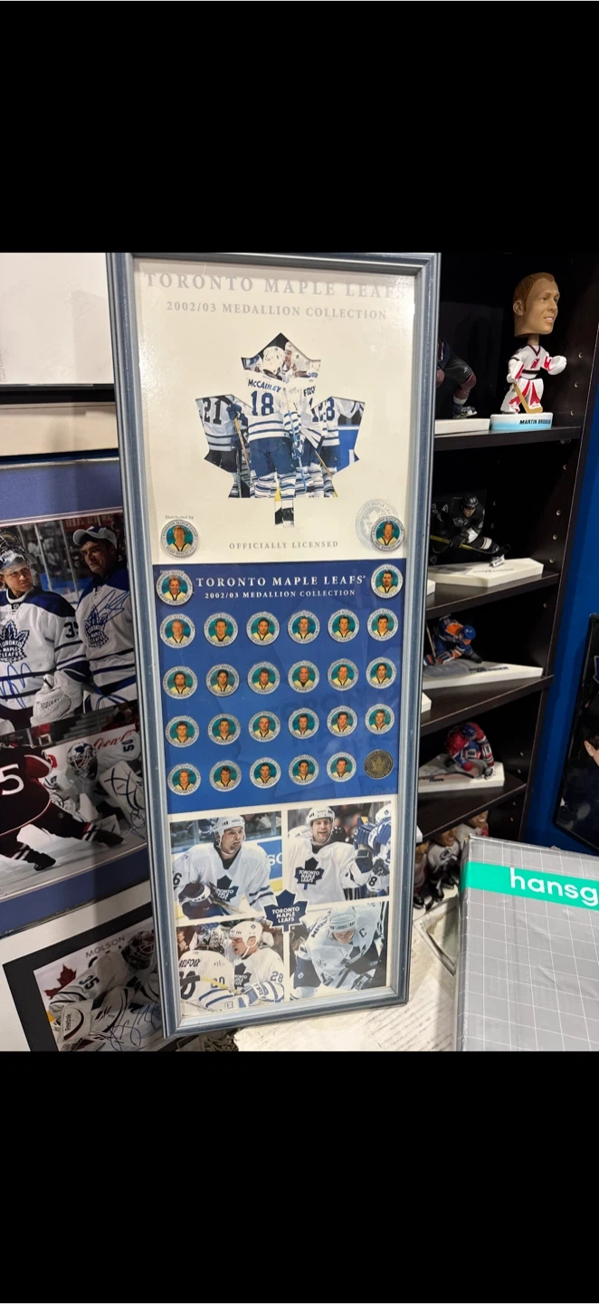 Selling a framed Toronto Maple Leafs 2002/03 Medallion Collection. It features player images and coins. A great piece for any Leafs fan!