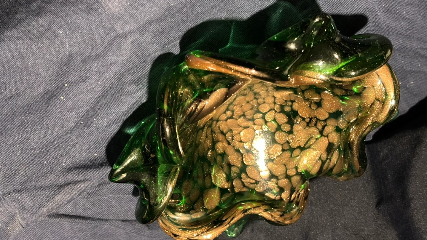 Selling a beautiful Murano art glass bowl. It features a unique green and gold design that would look great in any home. The bowl is in excellent condition and ready to be displayed!