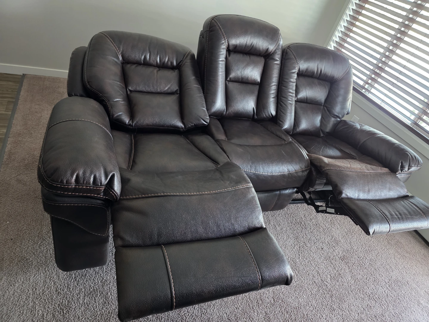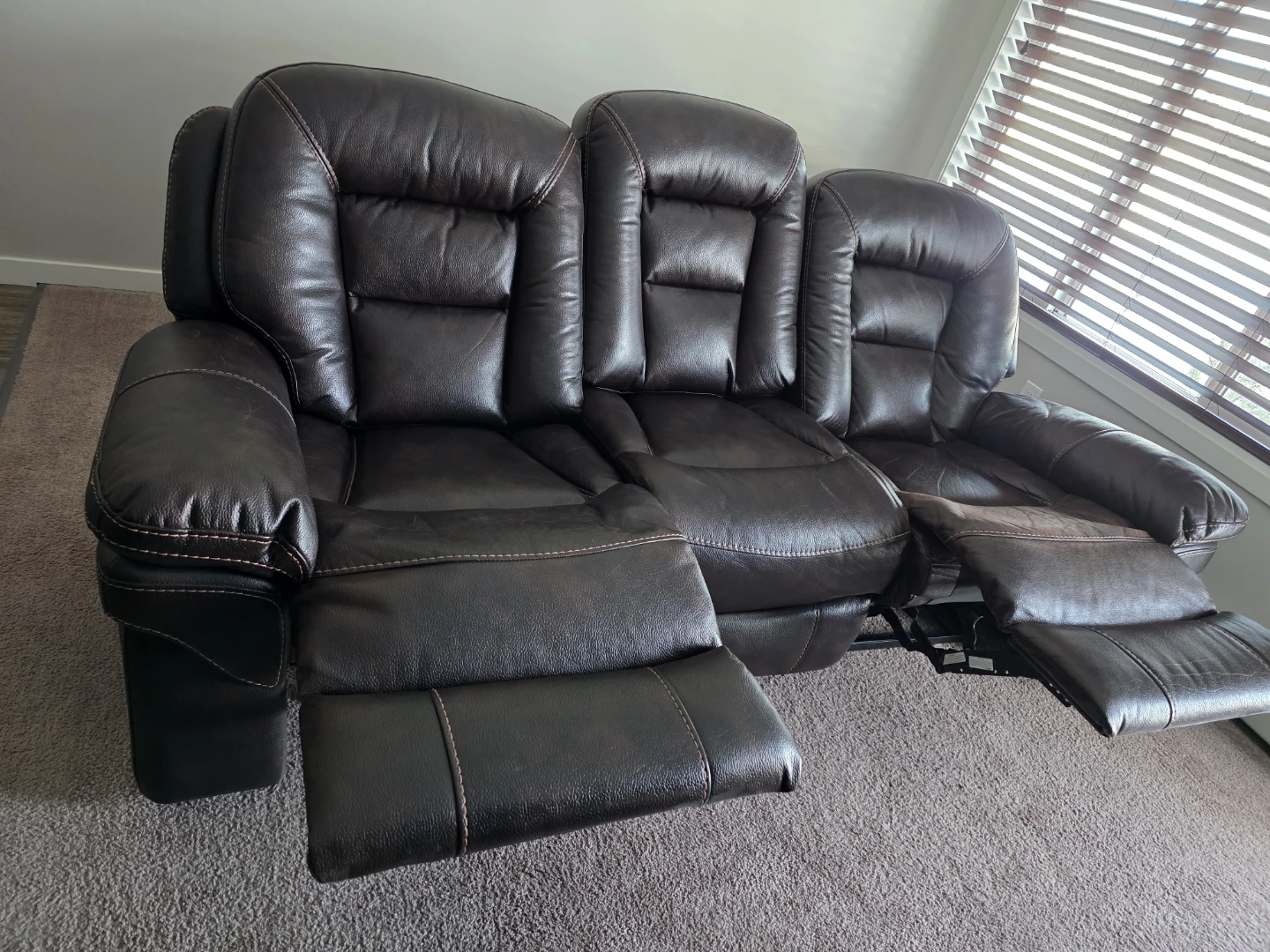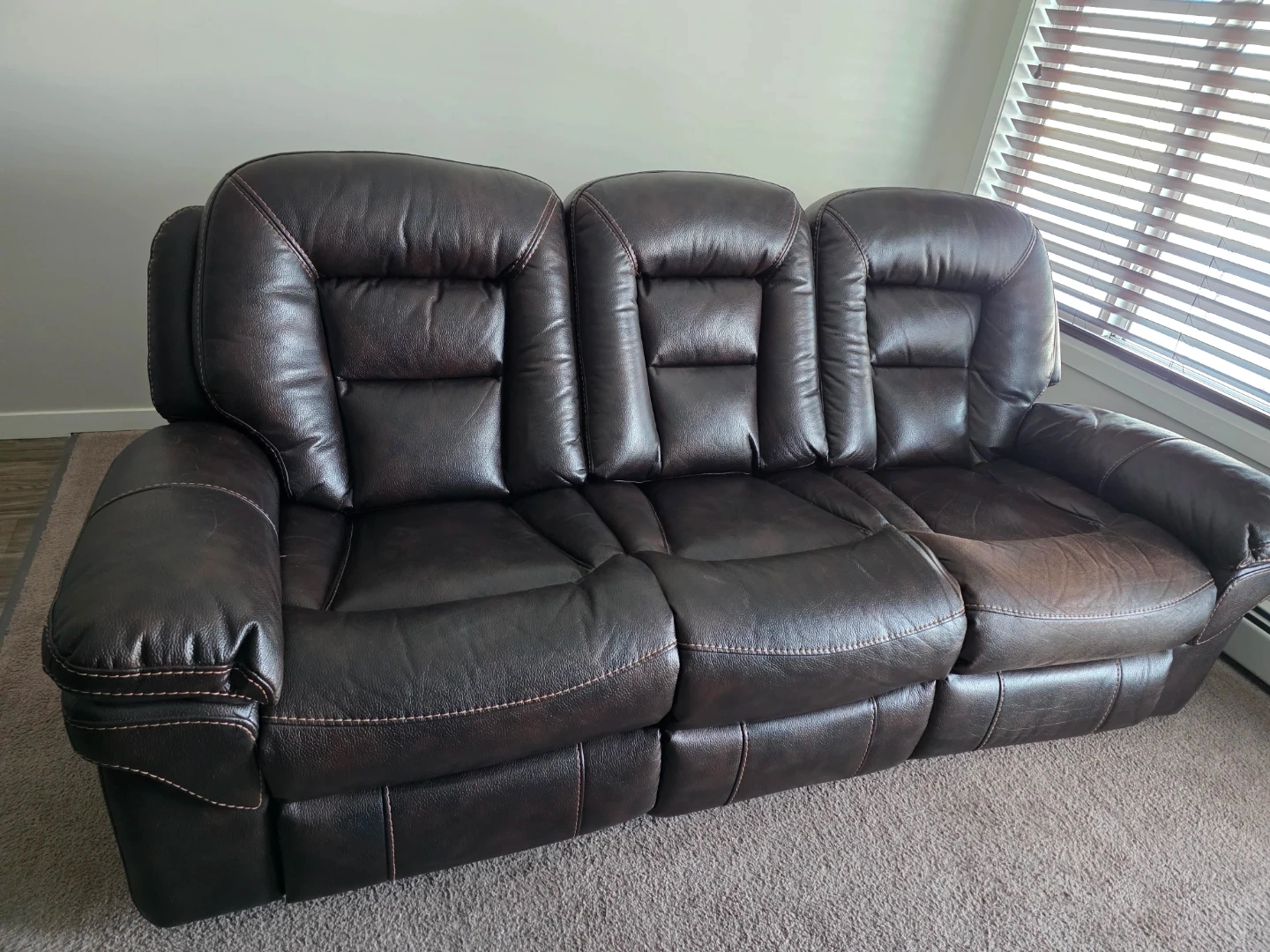 Selling my 3 seat recliner! 2 ends recline. Leather couch! Looking too get something else. In great condition. Comes with Leather cleaner and polish too keep the leather in good condition! Need a truck and extra hands too load! Make me an offer!