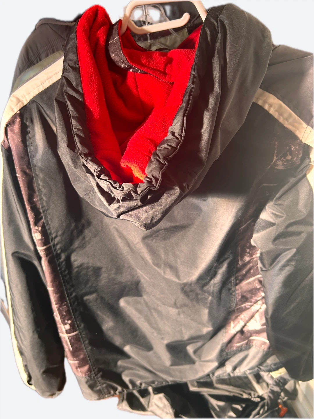 Selling a gently used boys' winter jacket, perfect for keeping warm during the colder months! It's a size 10/12 and features a stylish black and red colour scheme. The jacket is in great condition and ready for a new owner. It has a hood and zipper.