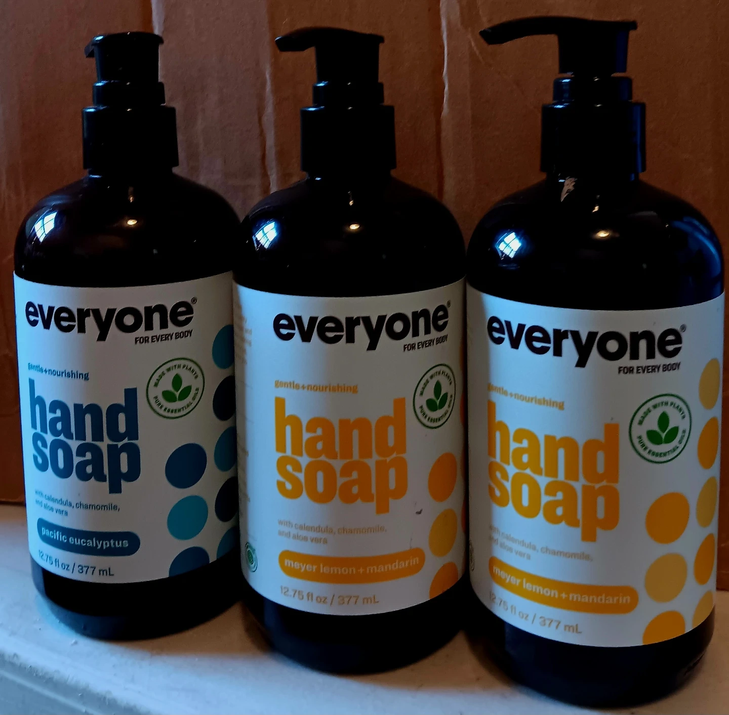 I have two bottles of Everyone Hand Soap available! One is Pacific Eucalyptus, and the other is Meyer Lemon + Mandarin. Each bottle contains 12.75 fl oz / 377 mL of gentle and nourishing hand soap. They're made with calendula, chamomile, and aloe vera for a soothing and refreshing cleanse