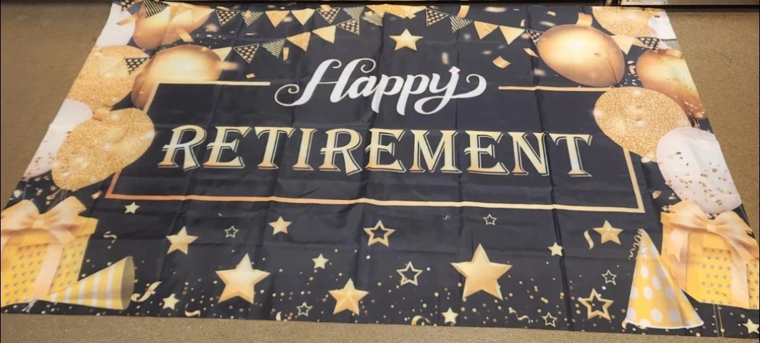 I'm selling a Happy Retirement banner. It's perfect for a retirement party or celebration! The banner features a black background with gold and white accents, including balloons, stars, and confetti. It's in great condition and ready to make someone's retirement even more special