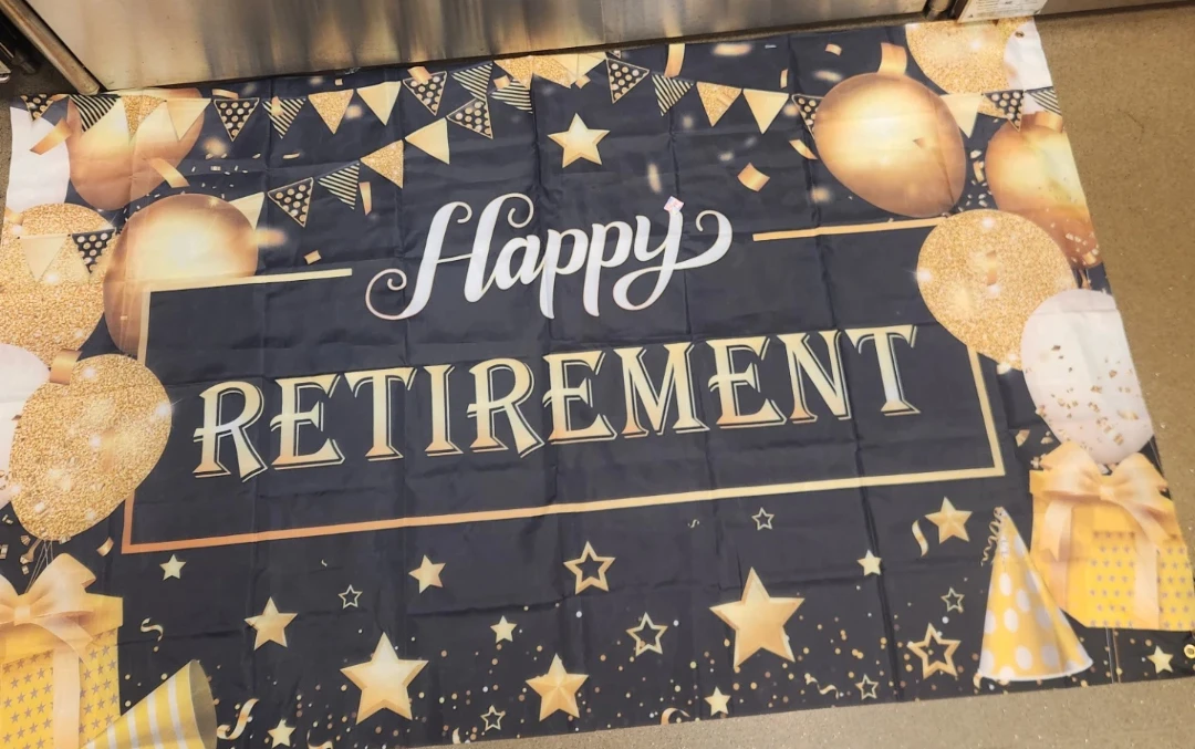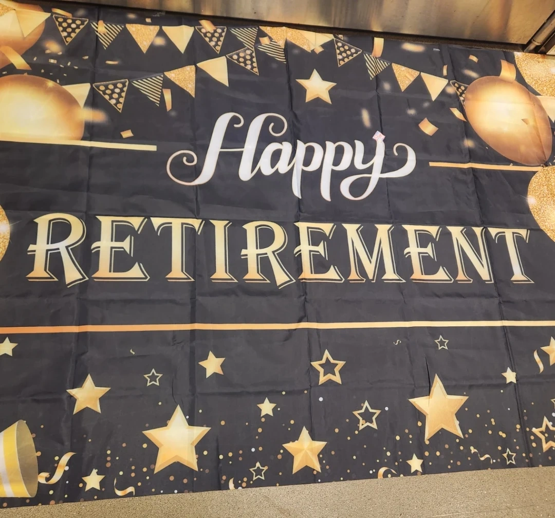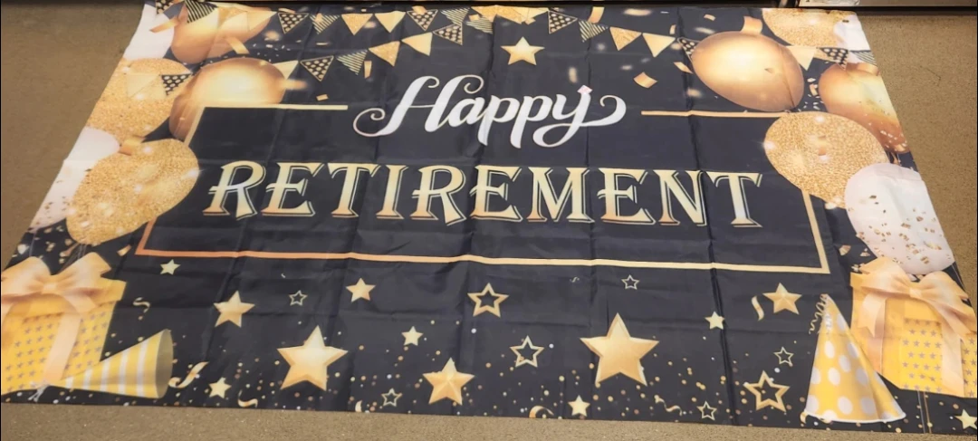 I'm selling a Happy Retirement banner. It's perfect for a retirement party or celebration! The banner features a black background with gold and white accents, including balloons, stars, and confetti. It's in great condition and ready to make someone's retirement even more special