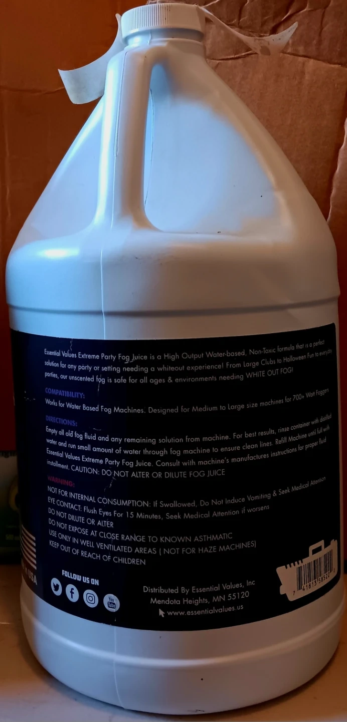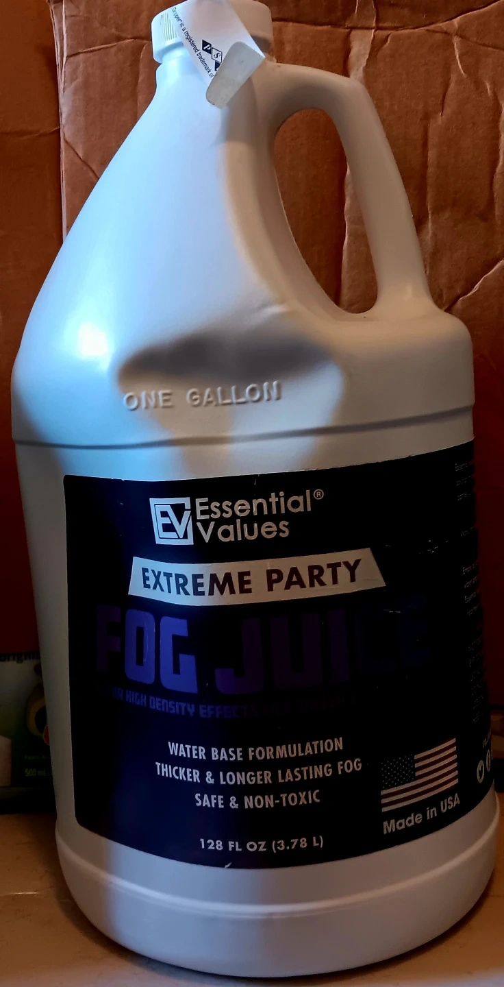 Selling a one-gallon jug of Essential Values Extreme Party Fog Juice. It's a high-output, water-based formula that is non-toxic and safe for all ages. Designed for medium to large-size fog machines.