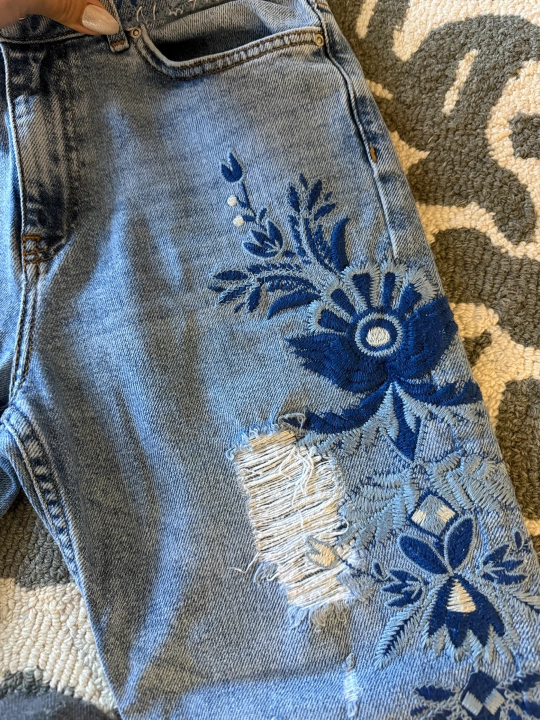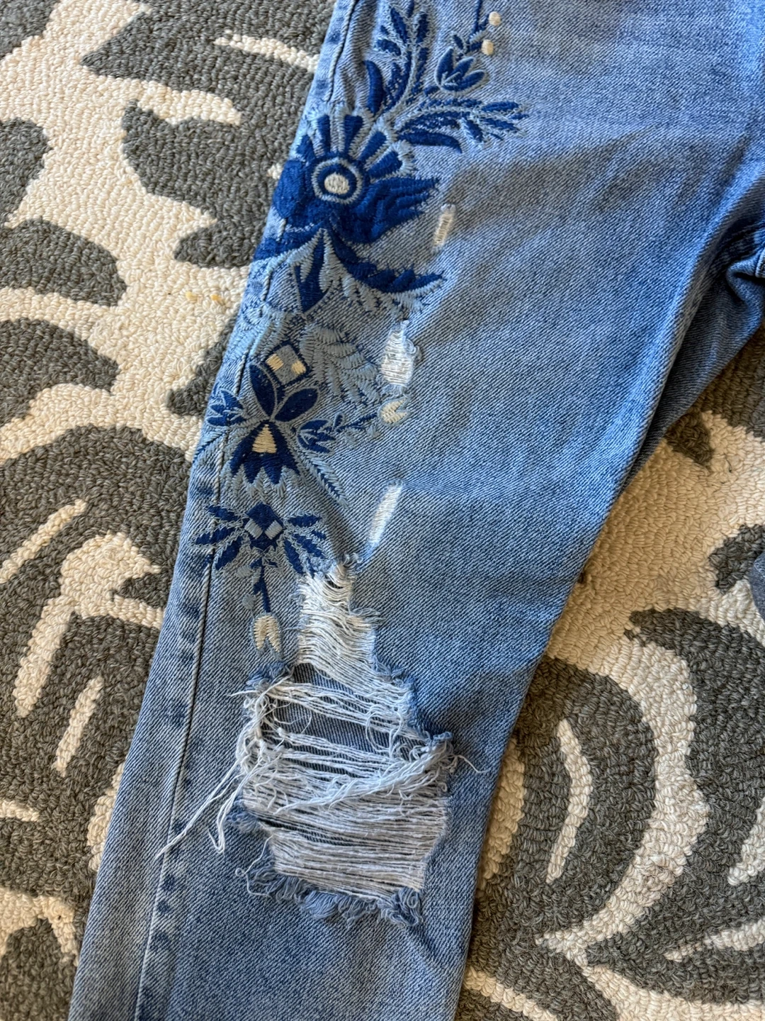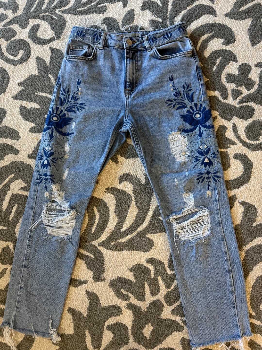 Selling a pair of Topshop Moto jeans in size W28 L30. These jeans feature a beautiful blue floral embroidery design and a stylish ripped detail. They are in great condition and ready for a new owner!