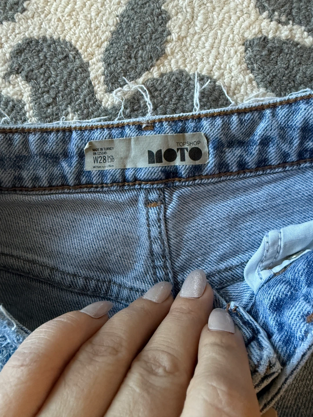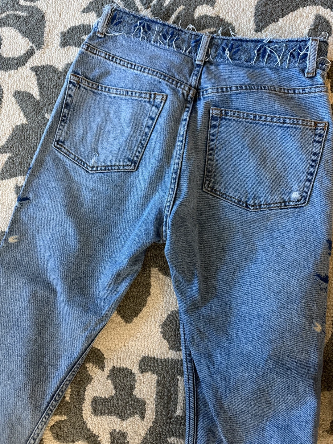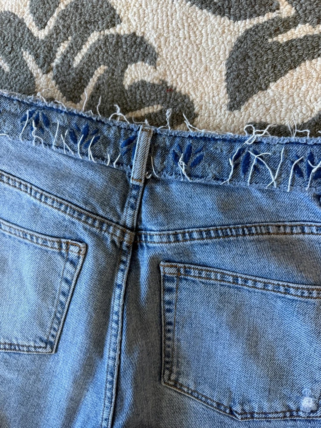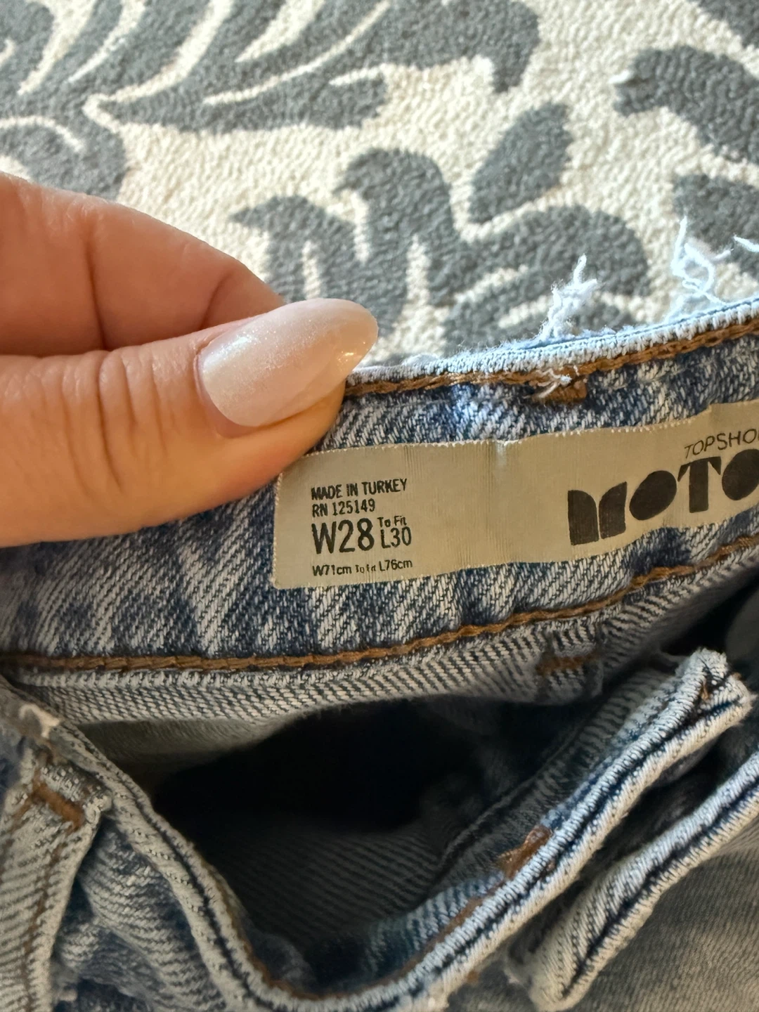 Selling a pair of Topshop Moto jeans in size W28 L30. These jeans feature a beautiful blue floral embroidery design and a stylish ripped detail. They are in great condition and ready for a new owner!