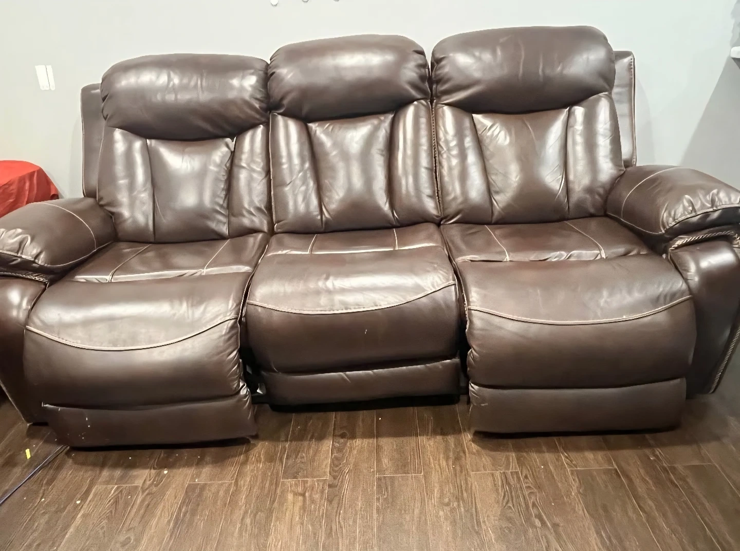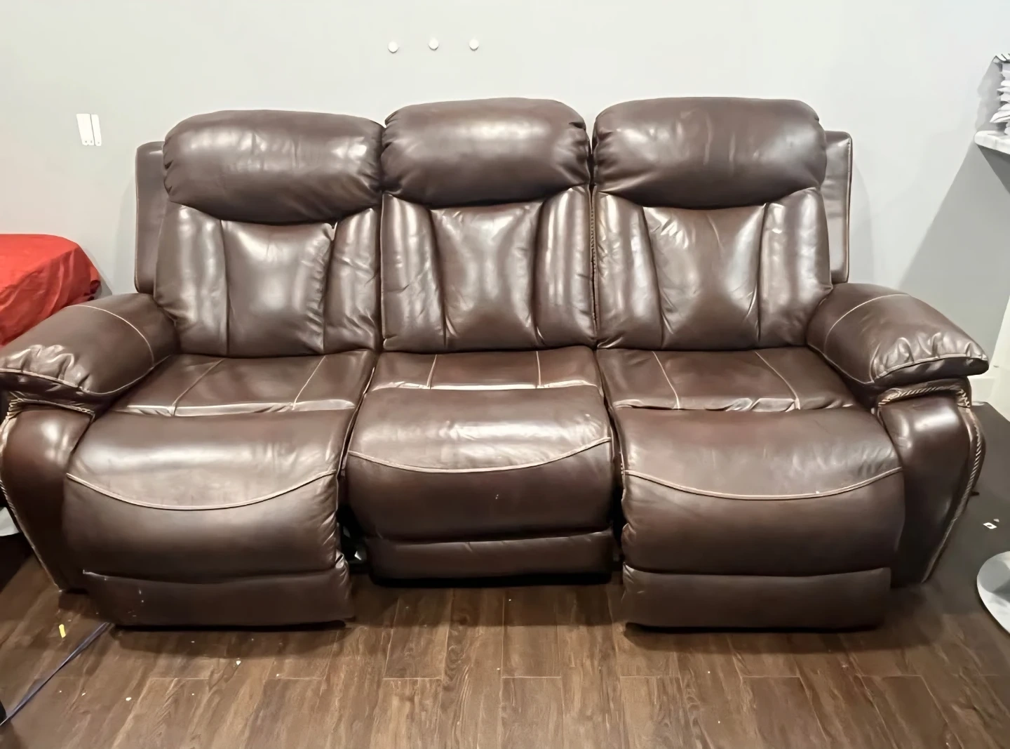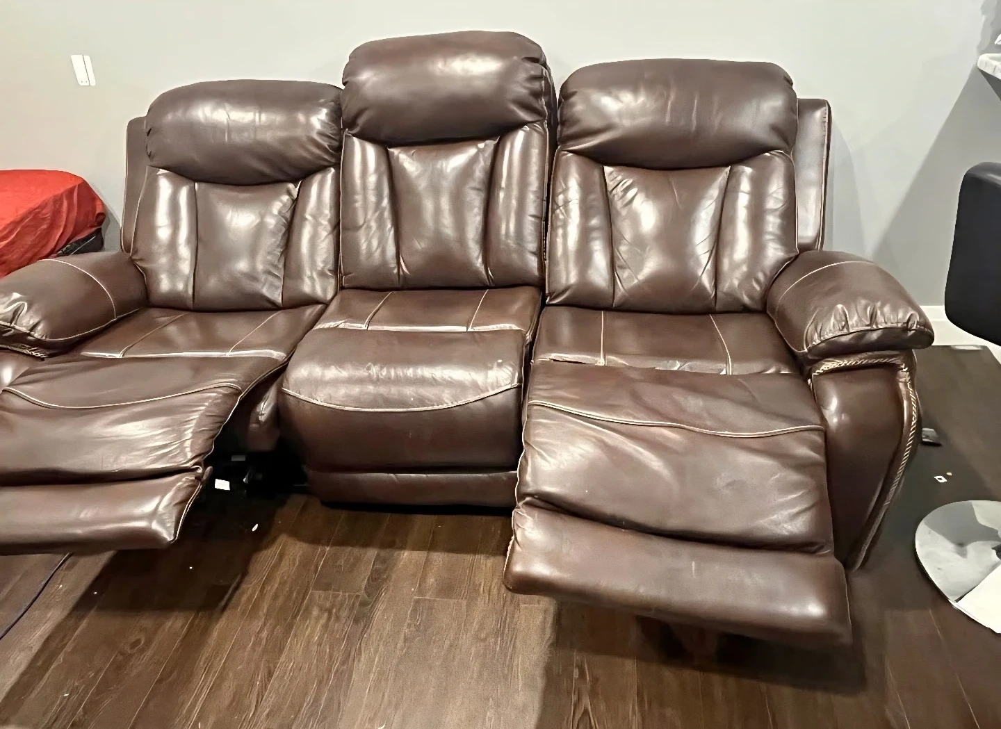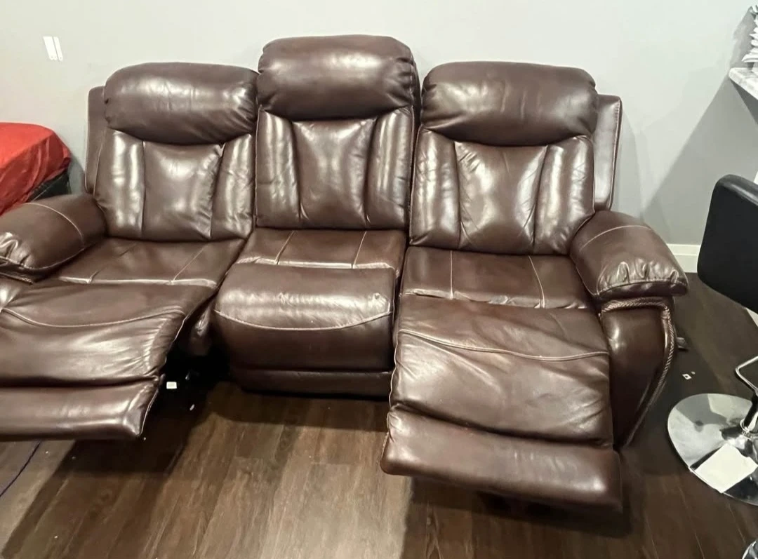 Purchased for 3k originally. Selling a comfortable brown leather reclining sofa. It's a great piece for any living room or entertainment area. The sofa features three reclining seats, perfect for relaxing and enjoying your favourite shows or movies. It's in good condition and ready to provide years of comfort and relaxation