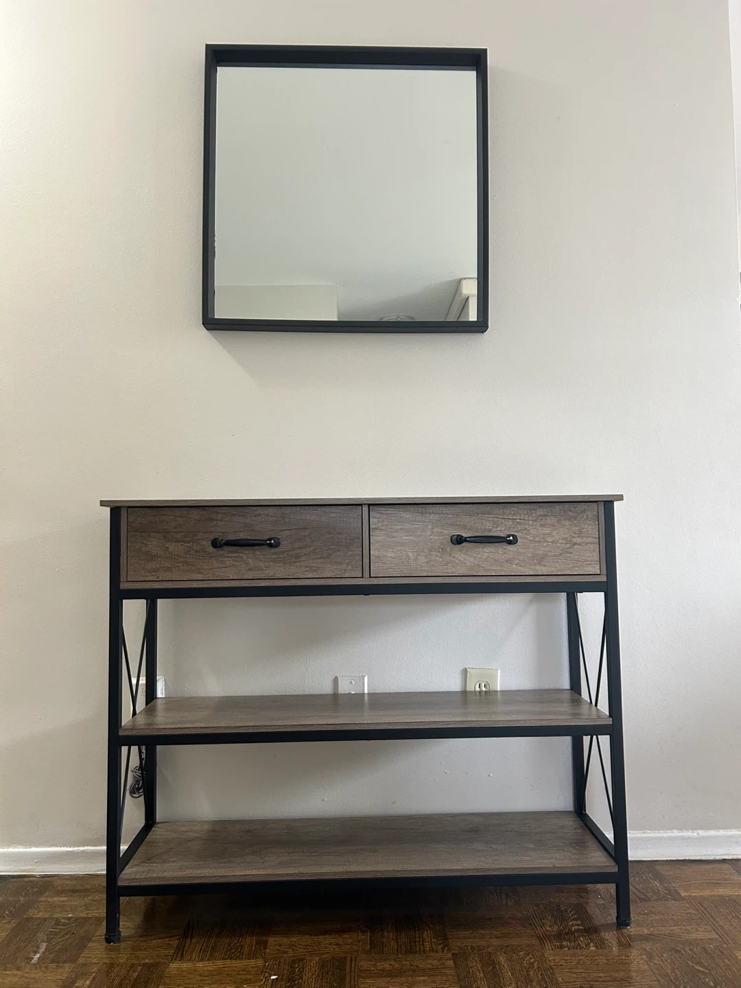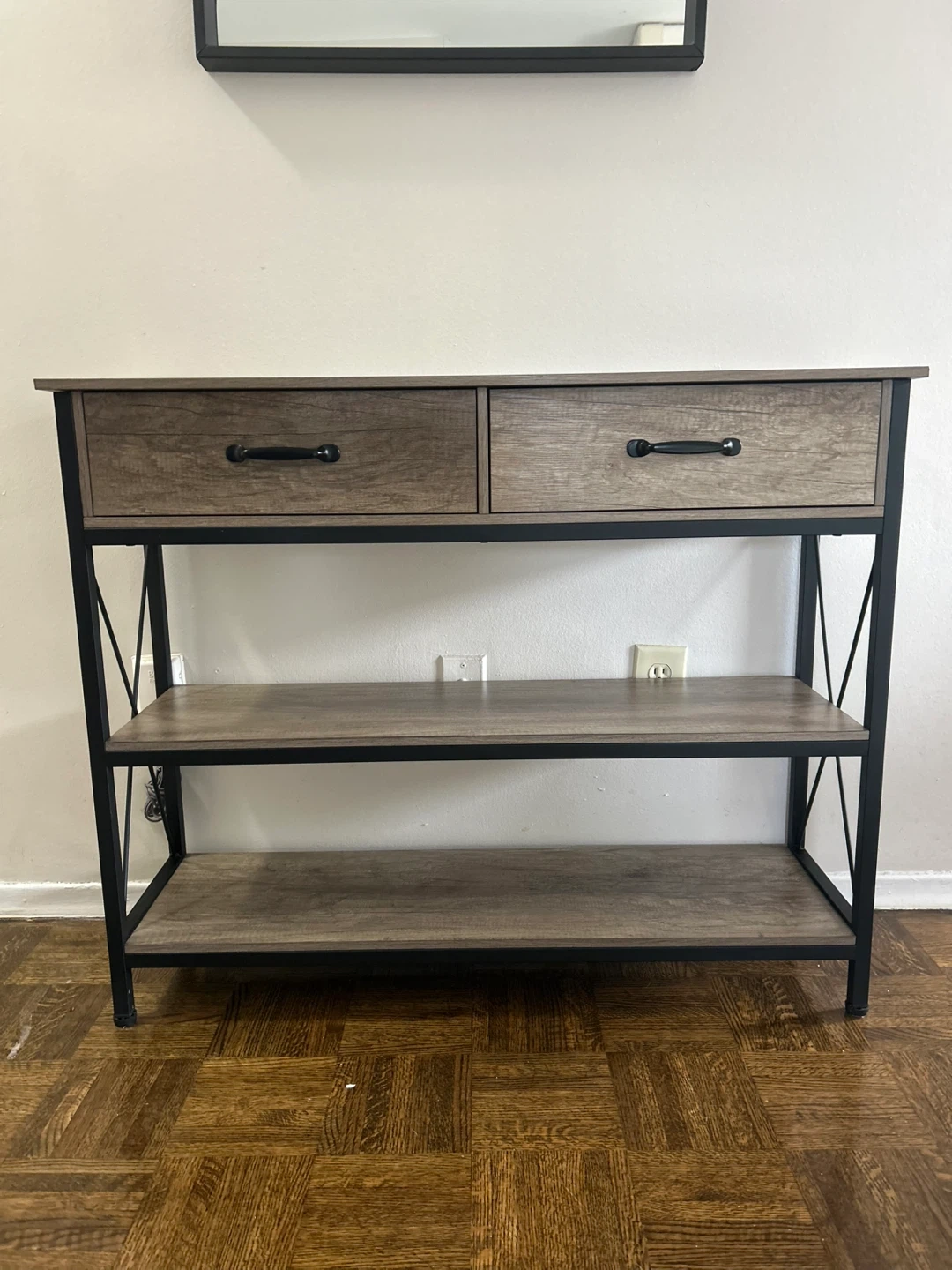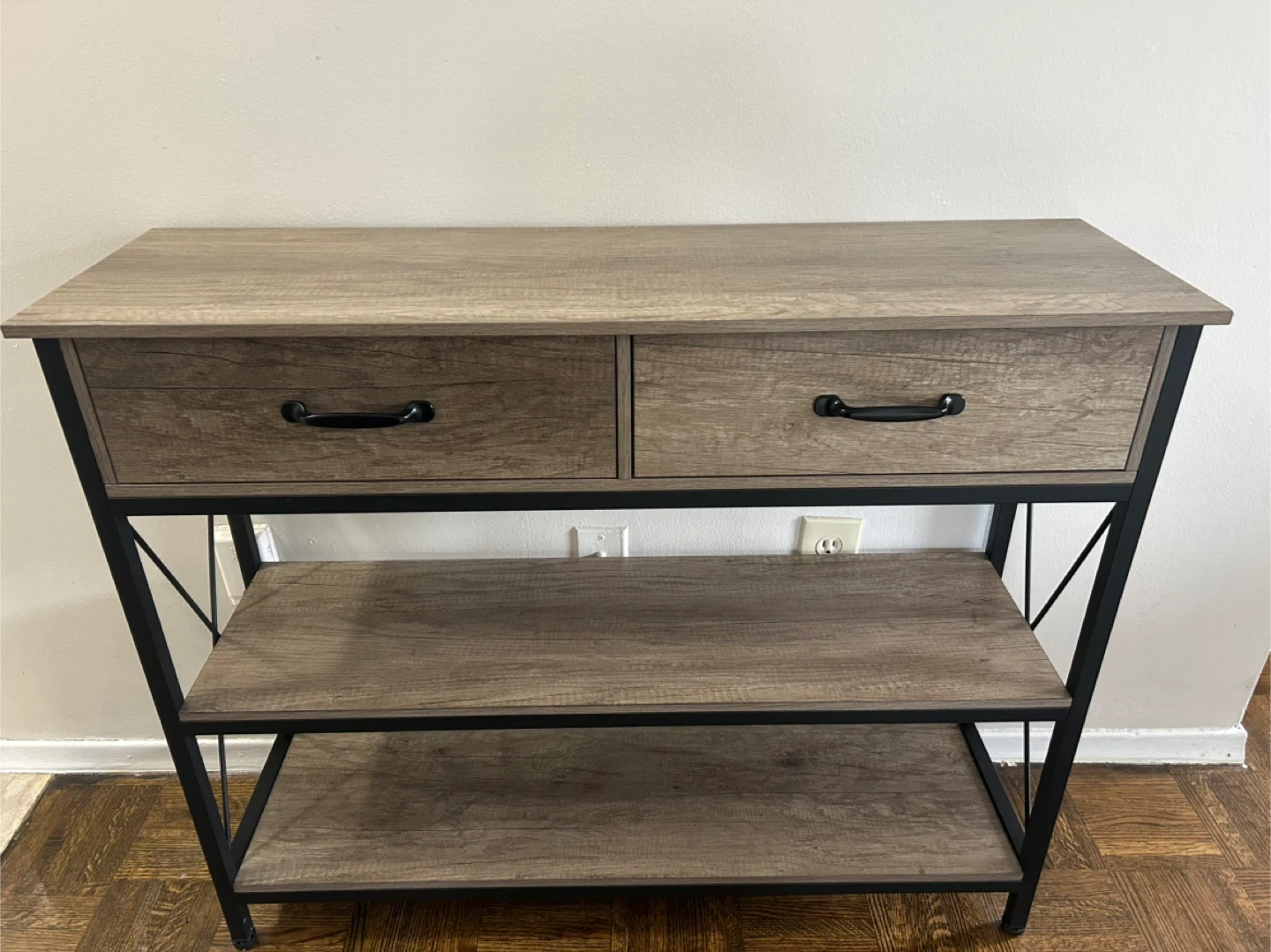 Here's a console table that would be perfect for an entryway or living room! It features two drawers and two shelves for storage or display. The table has a wood-look top and shelves with a black metal frame. It's in great condition and ready for a new home!