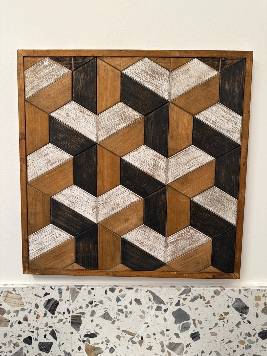 Looking to add a unique piece to your home decor? This geometric wood wall art is perfect! It features a cool, dimensional design with a mix of natural wood tones, white, and black. It's sure to catch the eye and add some character to any room