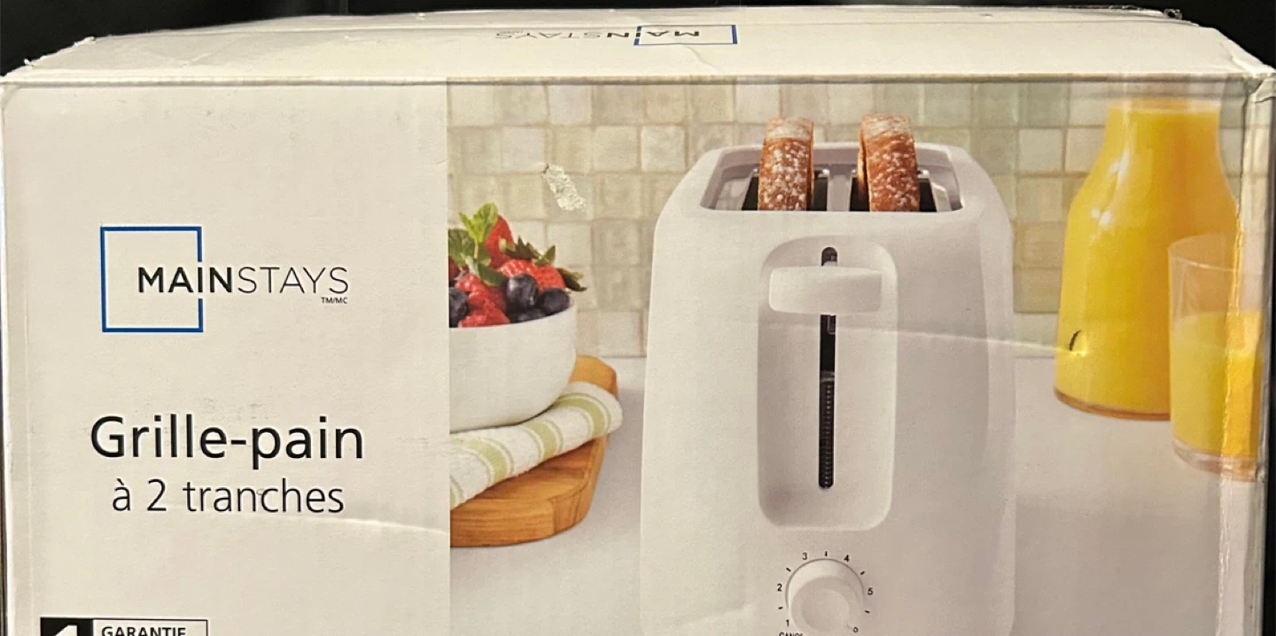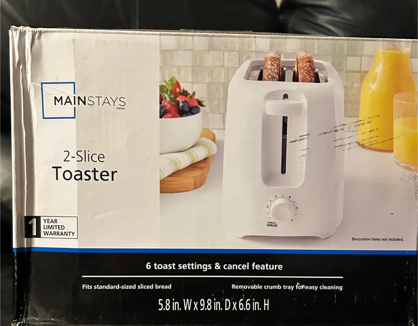 New Mainstays 2-Slice Toaster! It fits standard-sized sliced bread and has 6 toast settings with a cancel feature. It also has a removable crumb tray for easy cleaning and a cord storage feature. The toaster operates at 700 Watts. Dimensions are 5.8 in. W x 9.8 in. D x 6.6 in. H