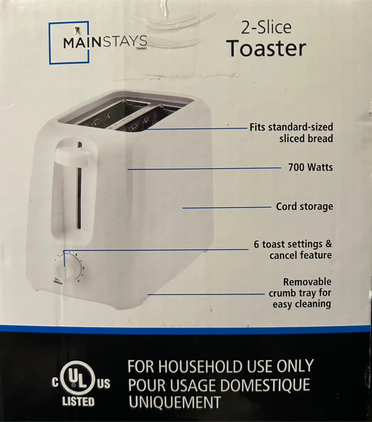 New Mainstays 2-Slice Toaster! It fits standard-sized sliced bread and has 6 toast settings with a cancel feature. It also has a removable crumb tray for easy cleaning and a cord storage feature. The toaster operates at 700 Watts. Dimensions are 5.8 in. W x 9.8 in. D x 6.6 in. H