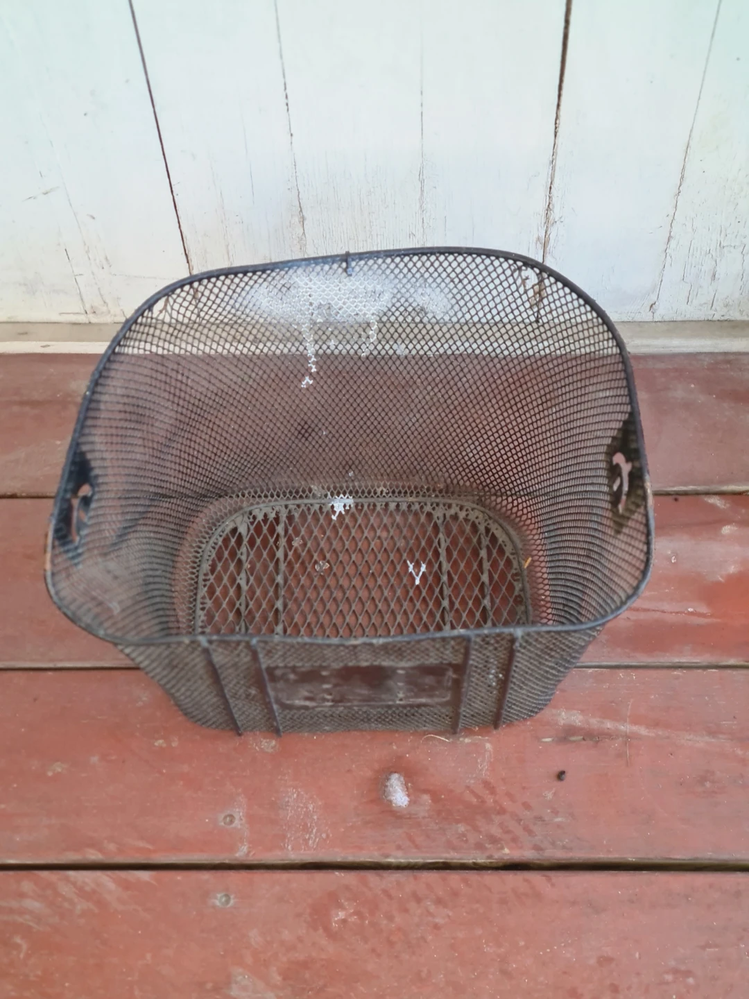Selling a used metal mesh bicycle basket. It has a bit of wear, but is still in good condition for carrying your groceries or other items while cycling around town