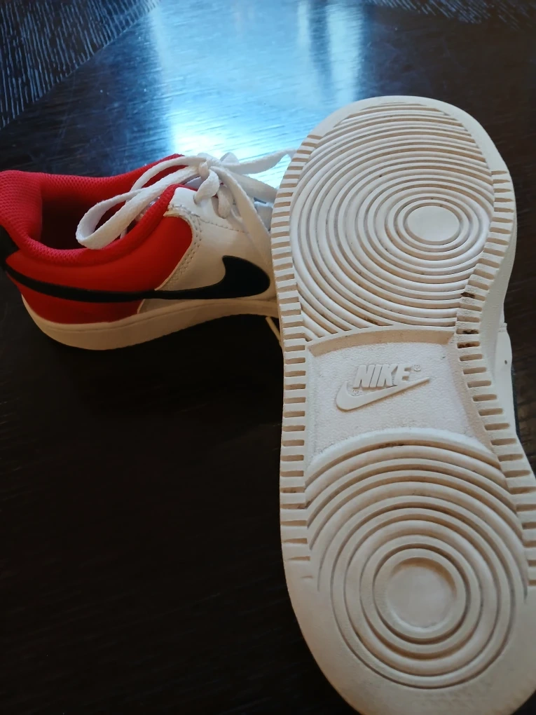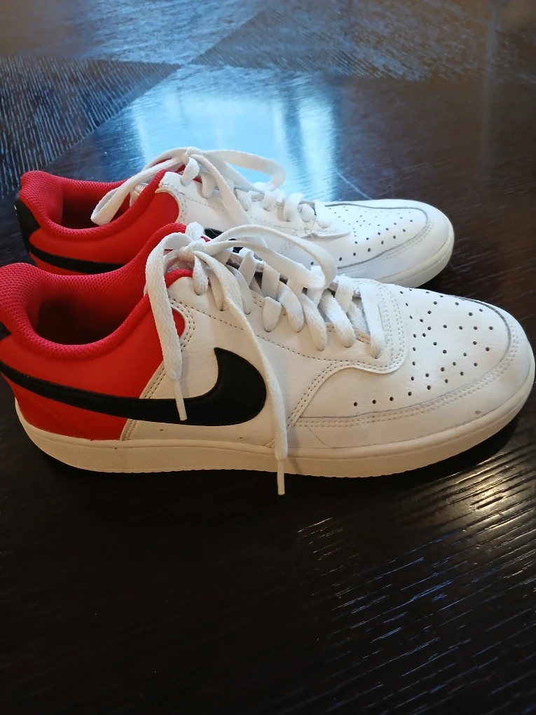 Selling a pair of Nike Court Vision Low sneakers in white and red. These shoes are in good condition and ready for a new owner. They feature the classic Nike swoosh and a comfortable low-top design. Perfect for everyday wear!