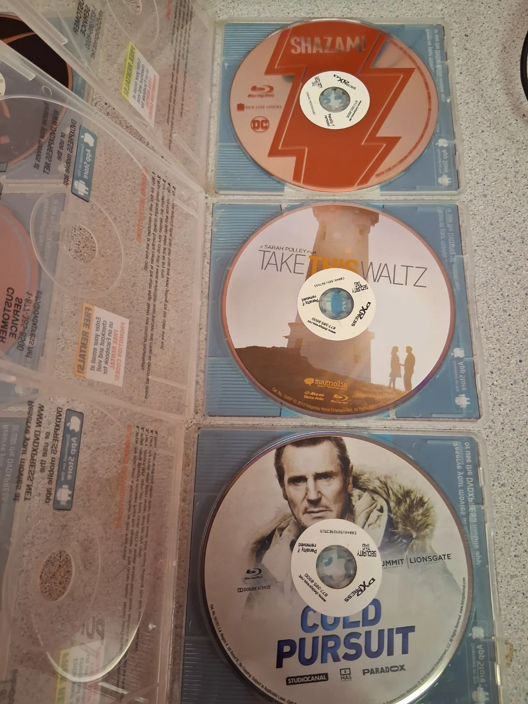 Selling a collection of Blu-ray movies. Titles include Shazam!, The House With A Clock In Its Walls, Backdraft 2, Cold Pursuit, Take This Waltz, and more! Great for a movie night!