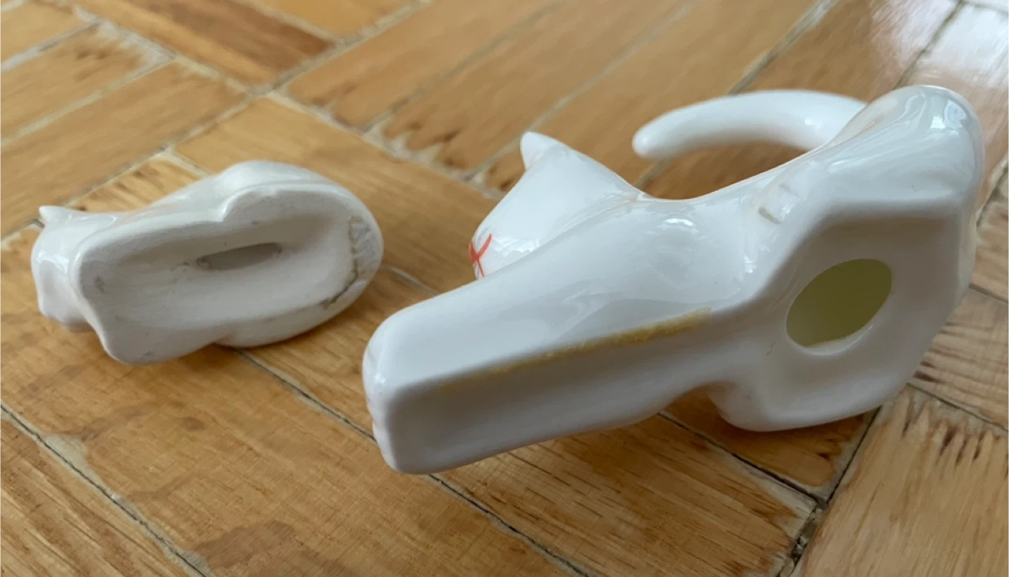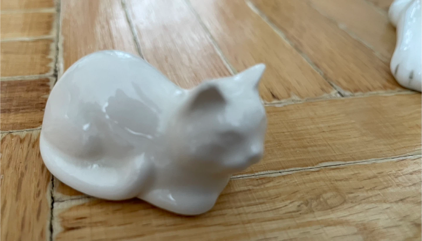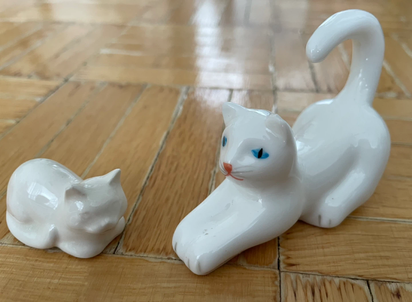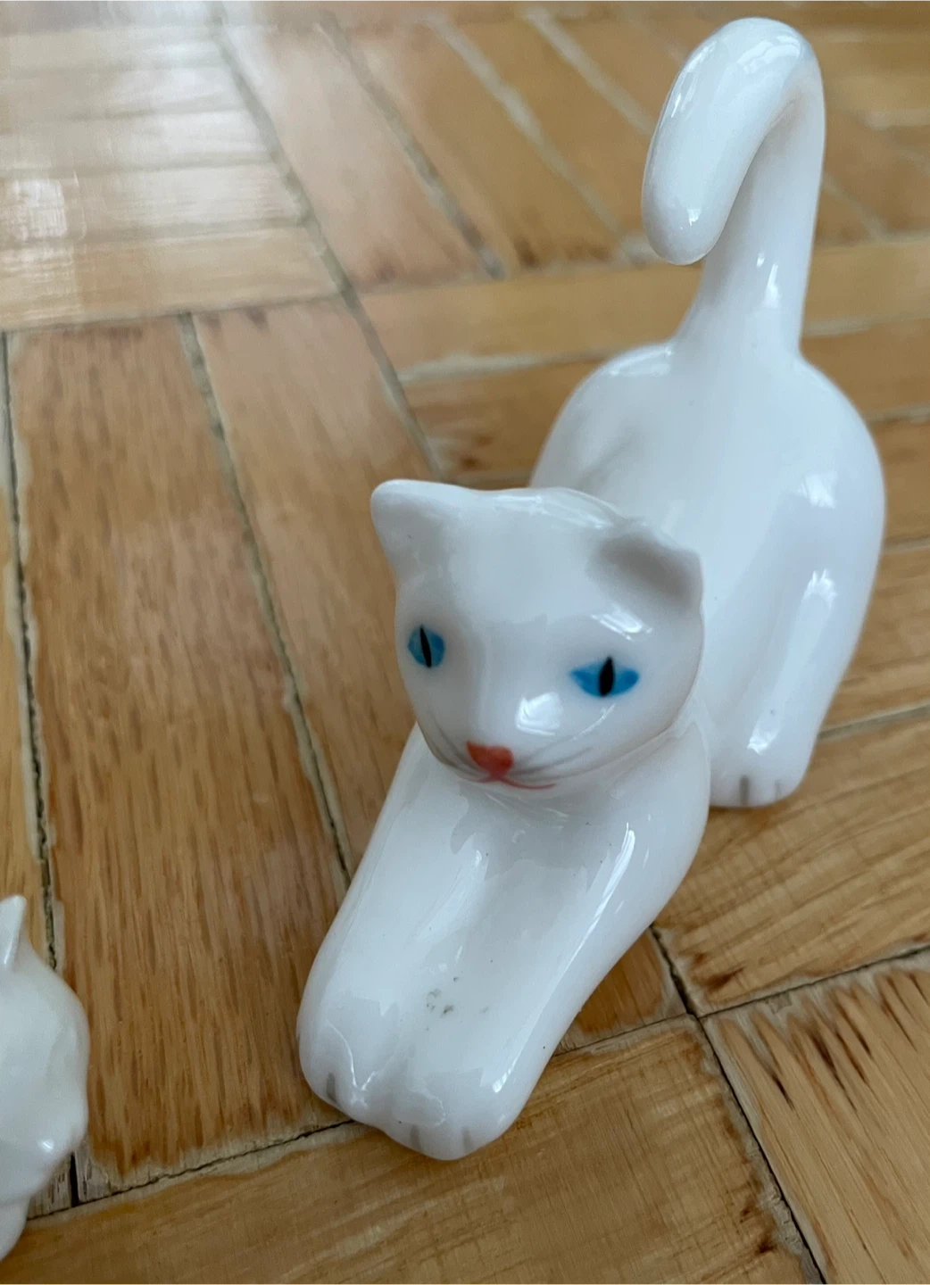 Selling a cute set of two ceramic cat figurines. They are white with blue eyes and a little red nose. Antique, English. Mother and Kitten.