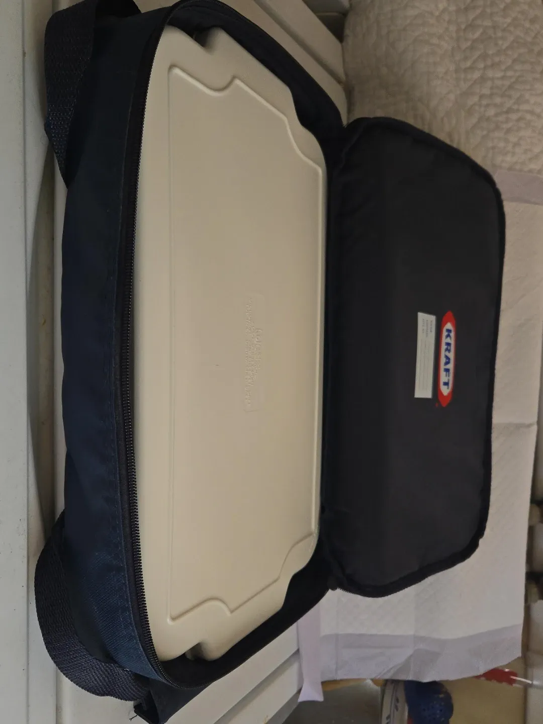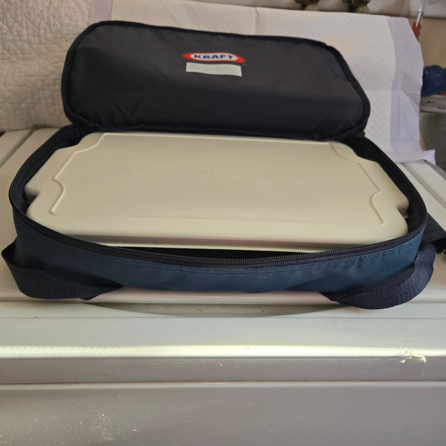 Selling a Kraft casserole dish with a convenient carrier! It's perfect for potlucks, picnics, or keeping your dish warm on the go. The carrier is a nice navy blue colour.
