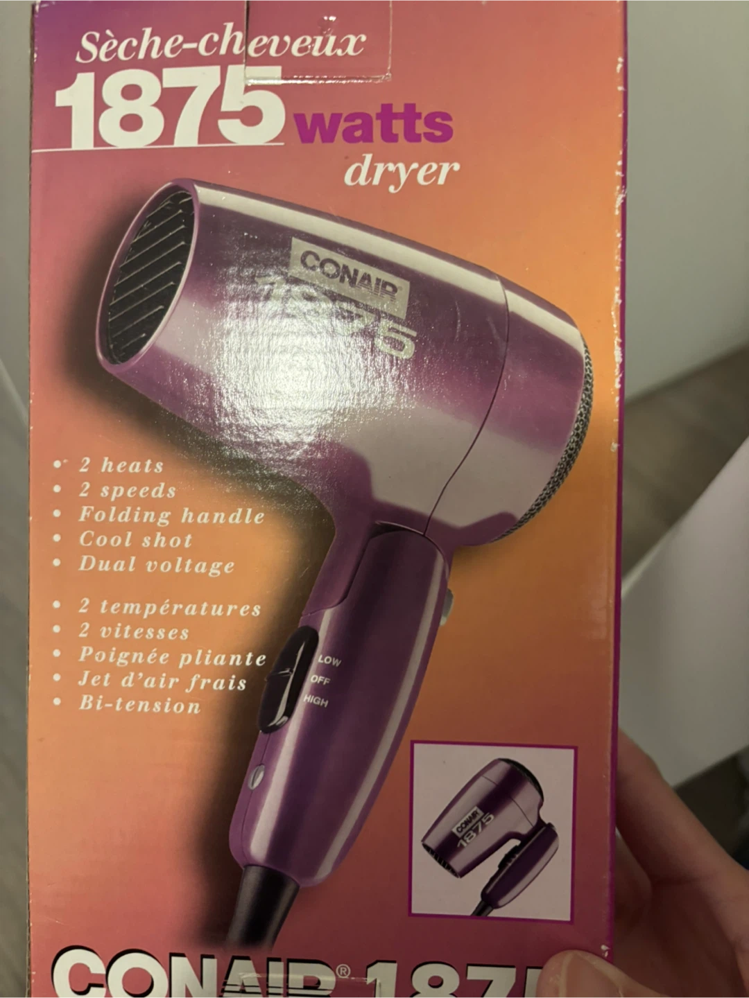 Selling used Conair 1875 watts hair dryer! It features 2 heat and speed settings, a folding handle, and a cool shot function. It also has dual voltage and bi-tension capabilities, making it perfect for travel