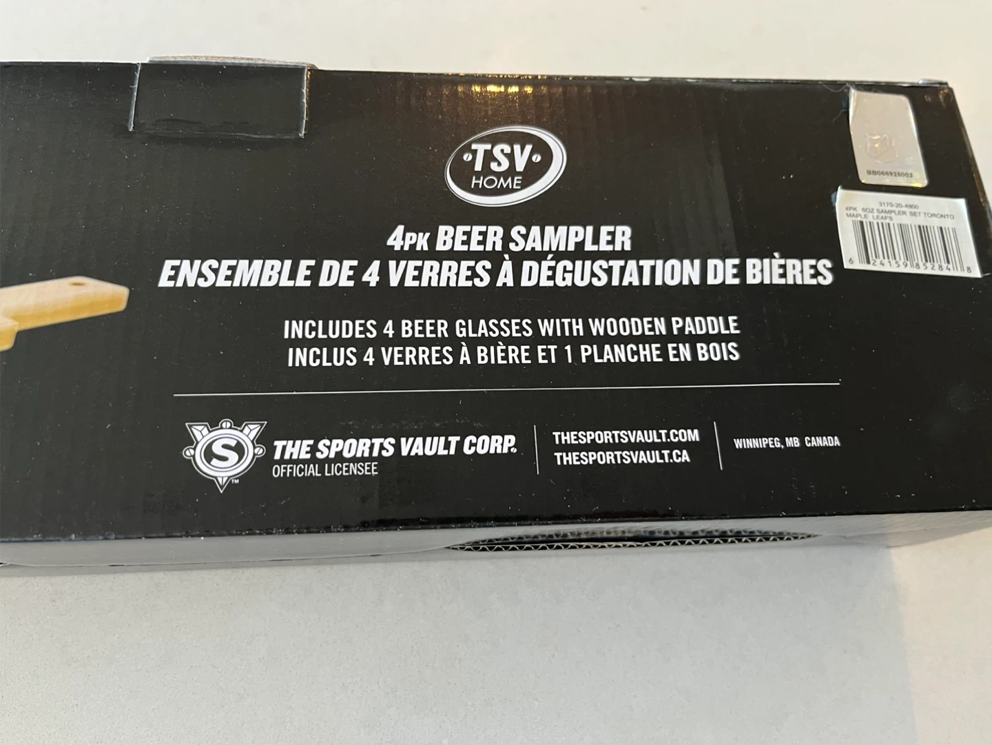 Selling a Toronto Maple Leafs beer sampler set. It includes 4 beer glasses with a wooden paddle. Perfect for trying out new brews! Brand new, never used. Box is good condition. Perfect for Christmas!