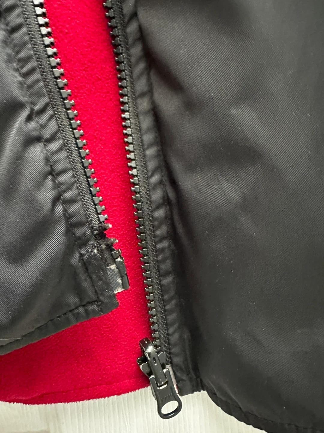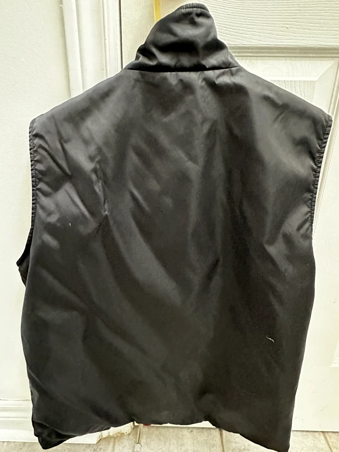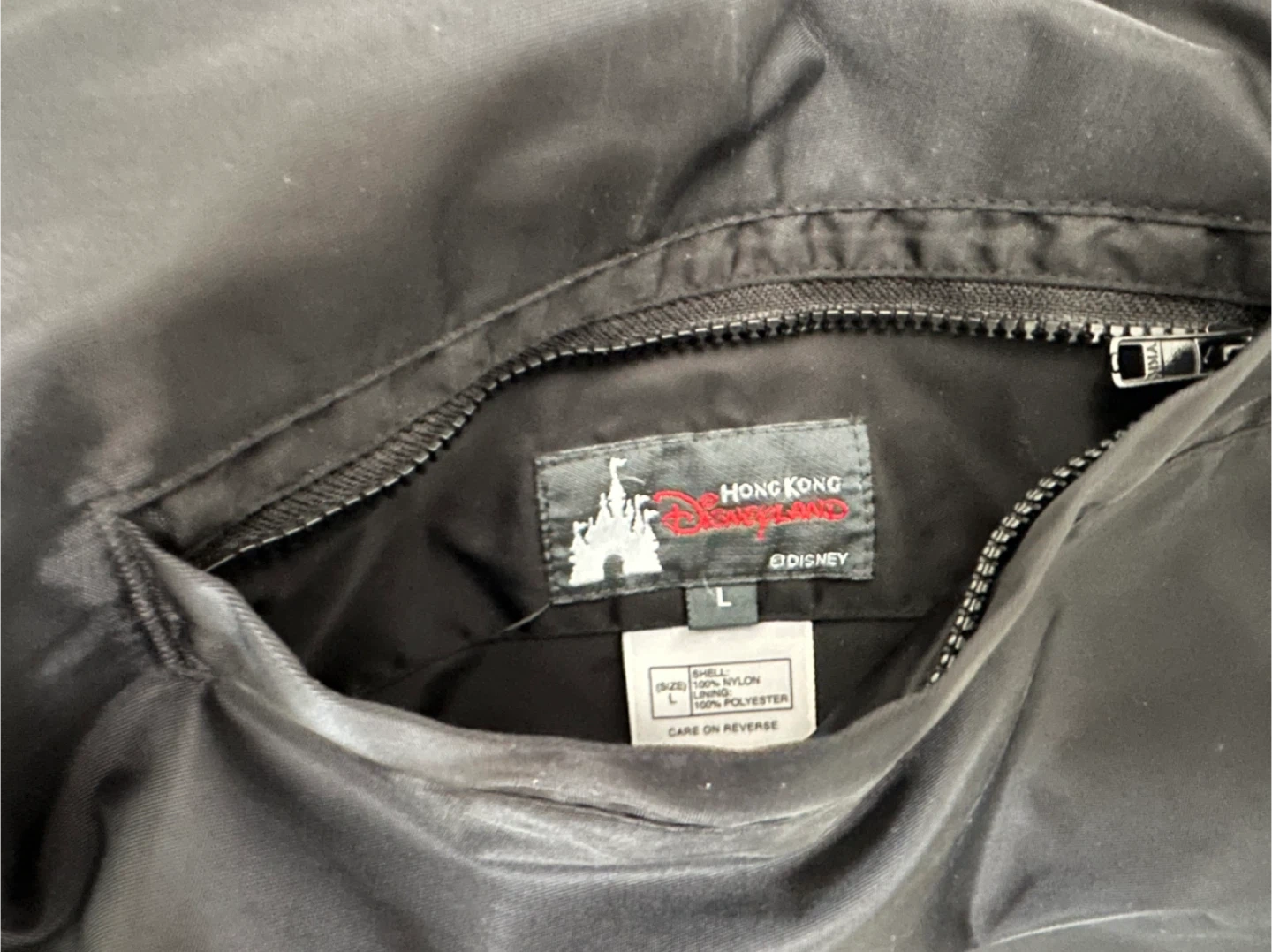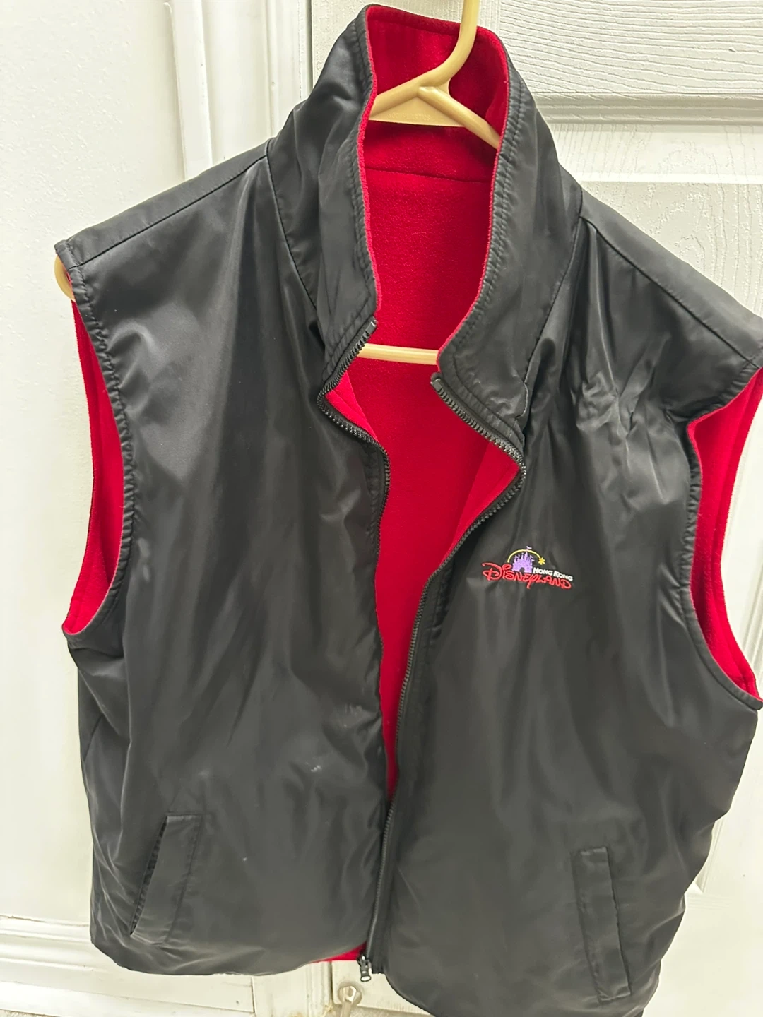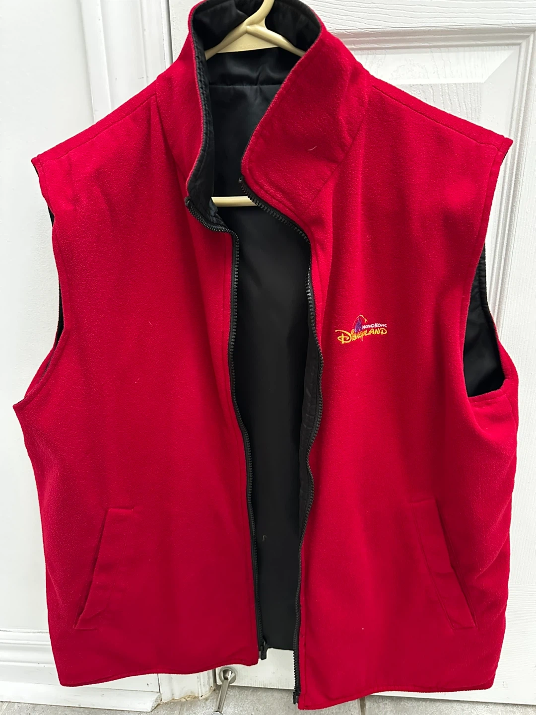 Reversible Hong Kong Disneyland vest in great condition! It's size L and features a black nylon shell on one side and a red fleece on the other. The shell is 100% nylon, while the fleece is 100% polyester. Zippered side pockets .!