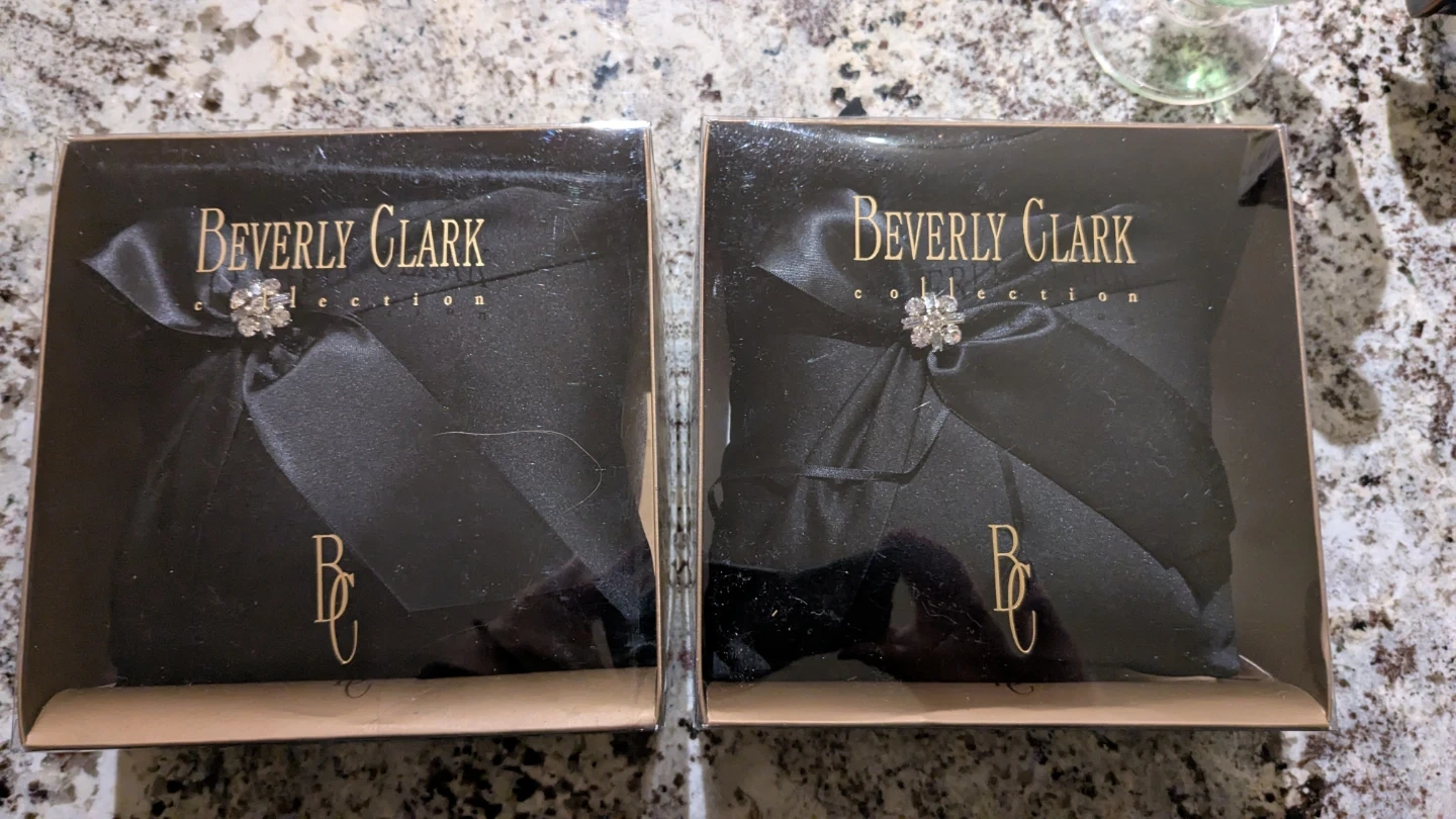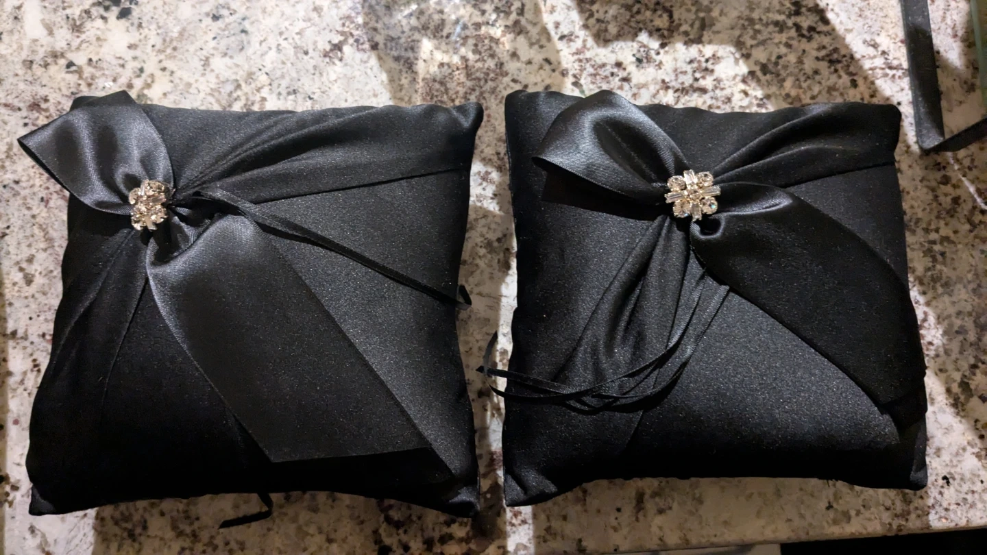 Selling a set of two ring pillows from the Beverly Clark Collection! These elegant black satin pillows are perfect for a wedding ceremony. They come in their original boxes and are in great condition. A beautiful addition to any wedding!