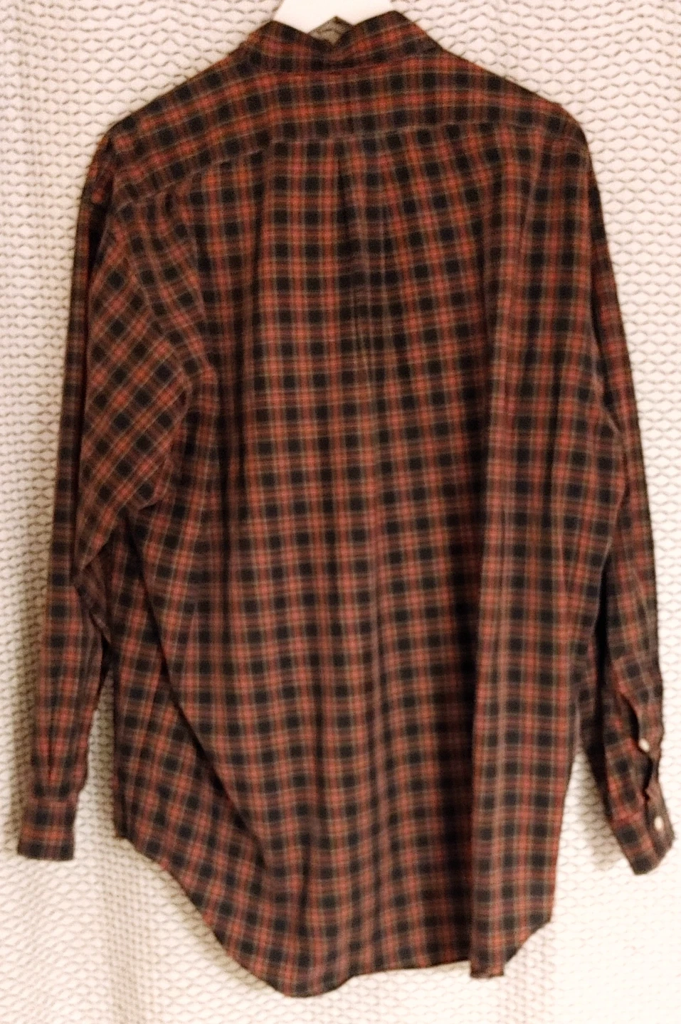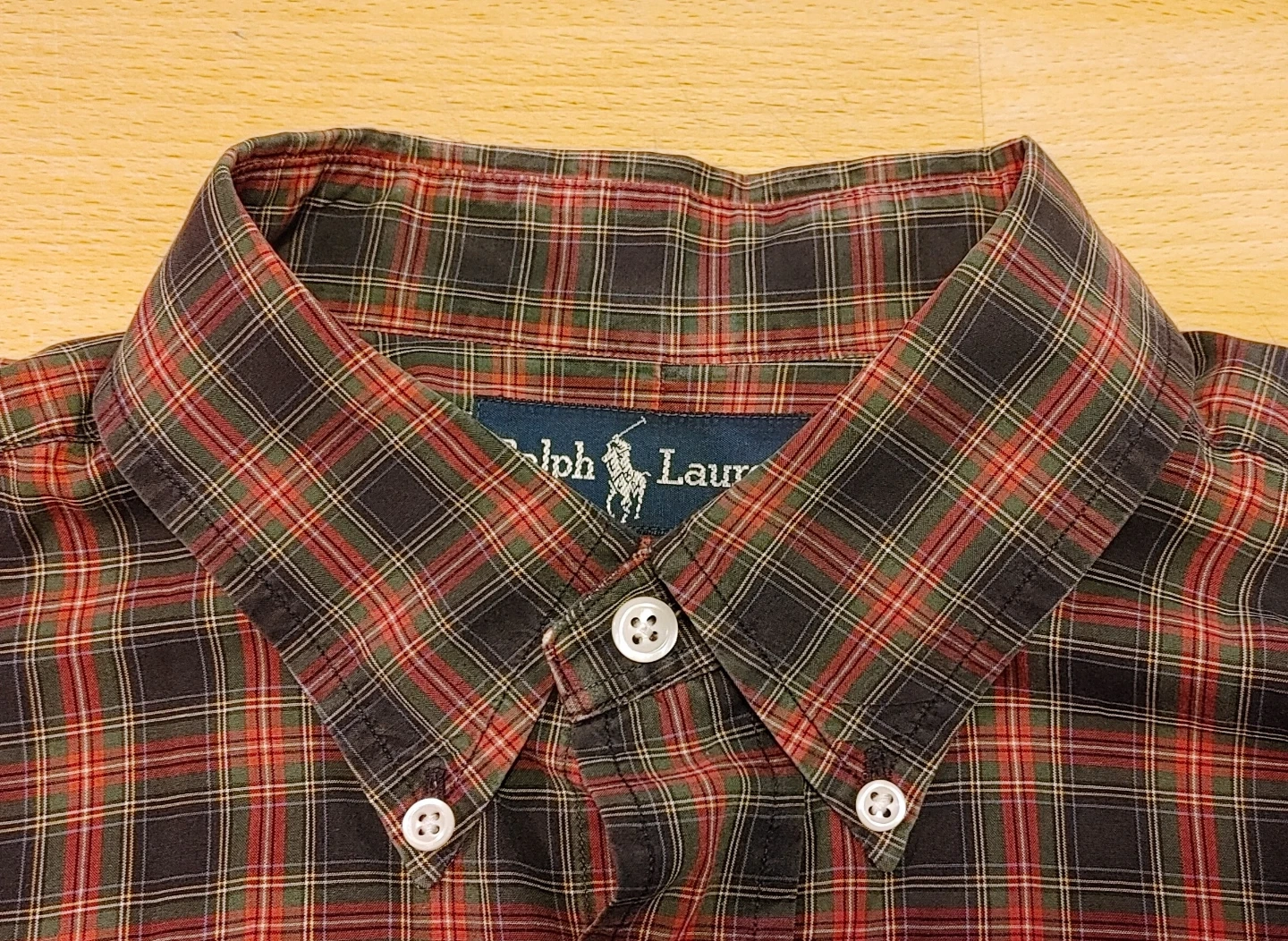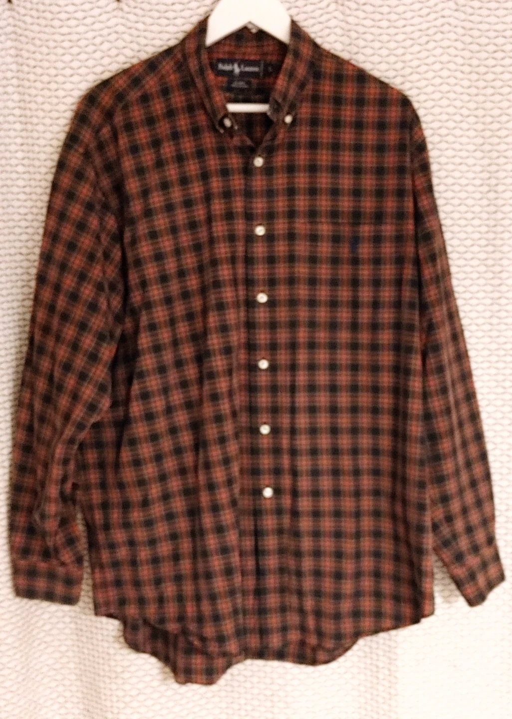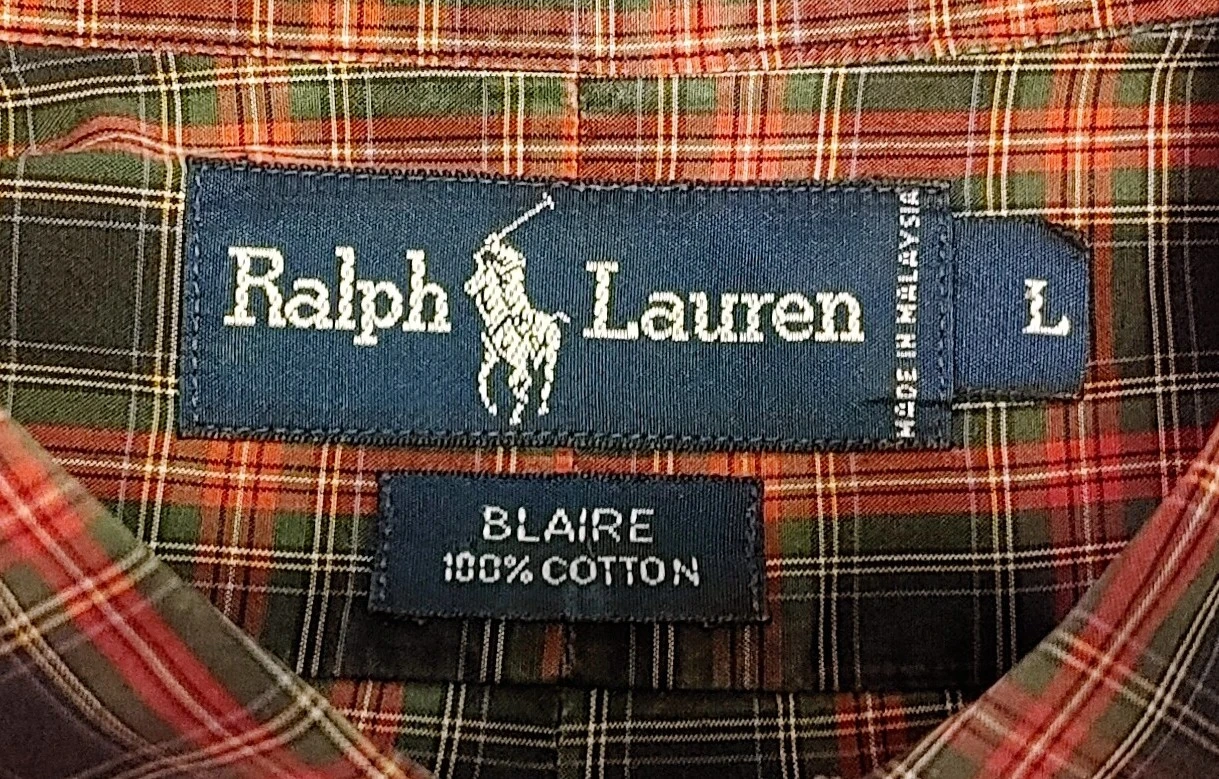 Mens size L Ralph Lauren plaid button-down Oxford shirt. Features a classic plaid pattern in shades of red, green, and black. The shirt has a button-down collar and a chest pocket with the signature Ralph Lauren logo. Excellent condition, like new. No rips, stains or fraying. All buttons present. Smoke free home pick up Mt Brydges cash only.