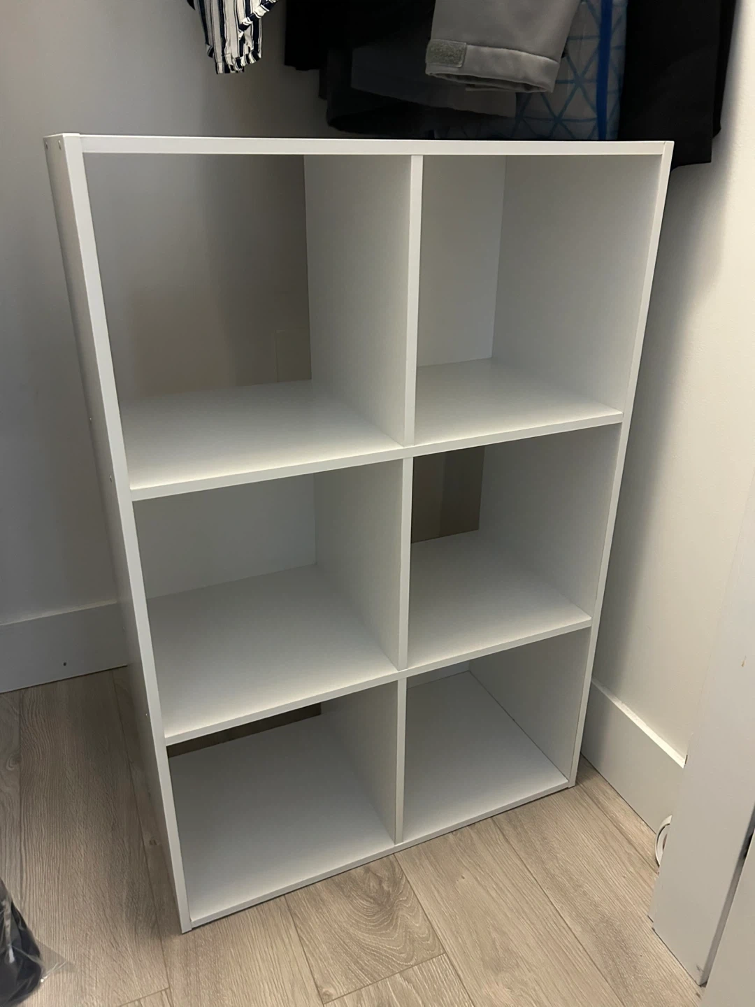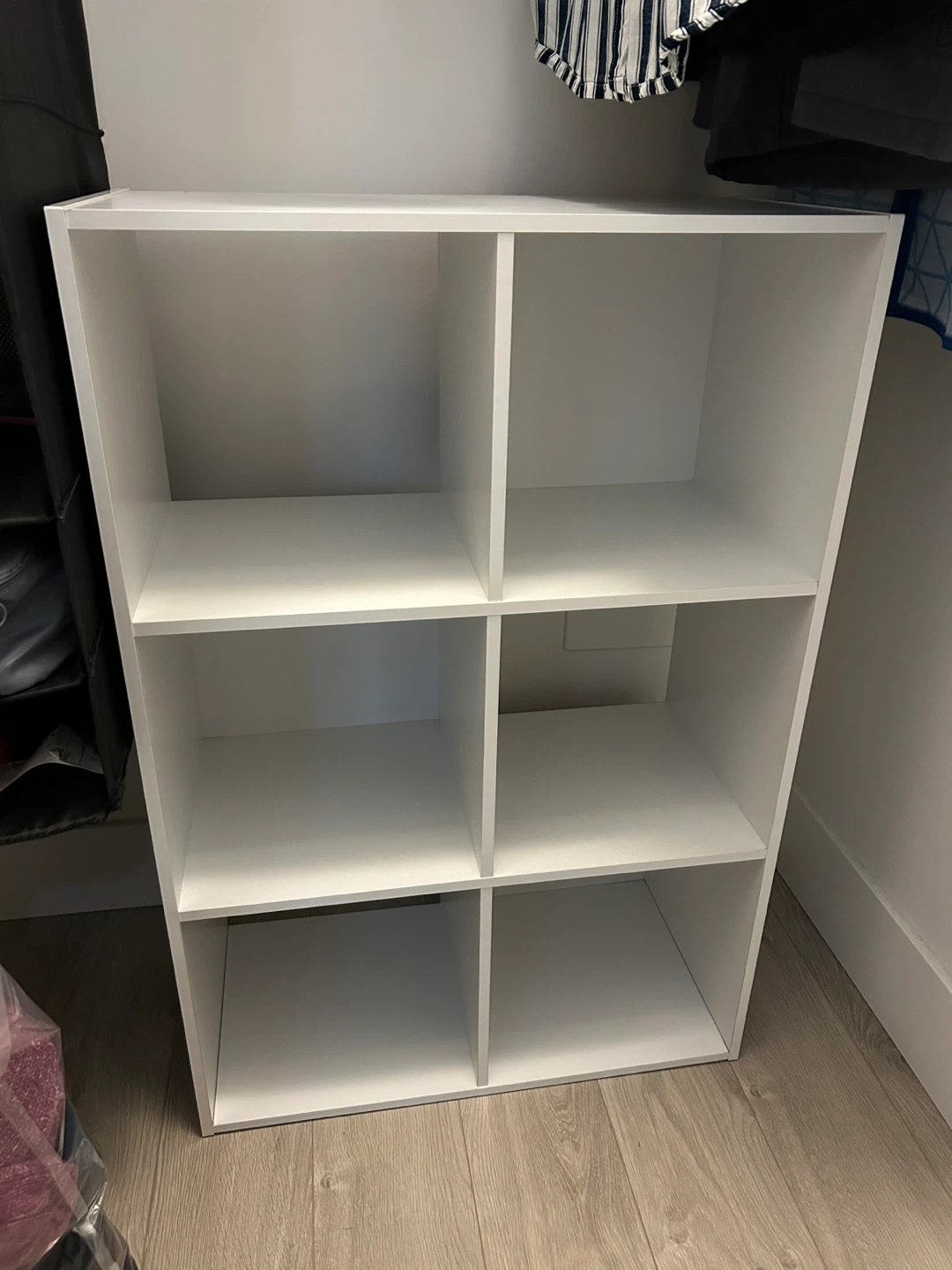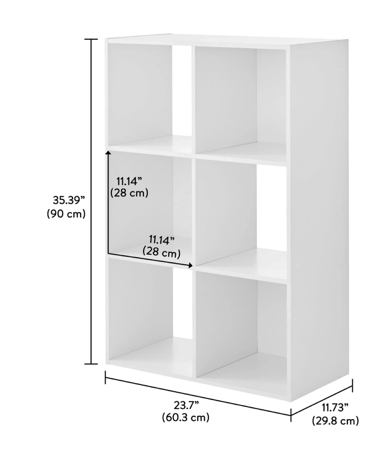 Selling a white 6-cube organizer shelf, perfect for adding storage to any room! It measures approximately 35.39 inches in height and 23.7 inches in width. Each cube is about 11.14 inches wide.