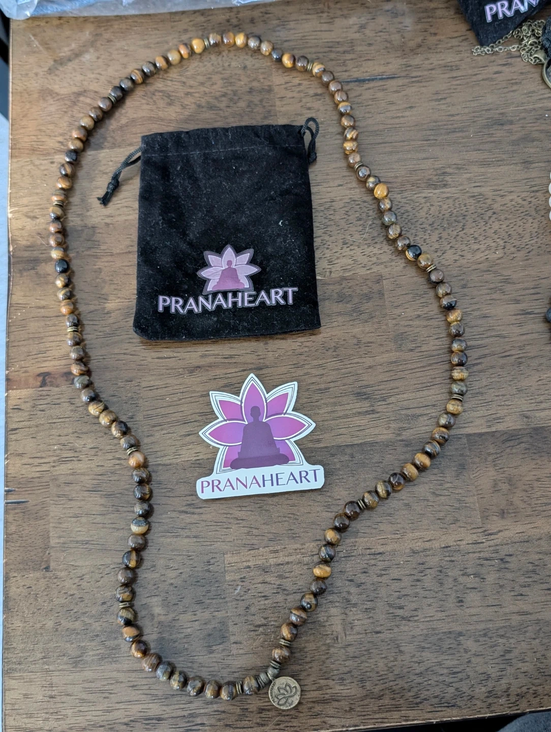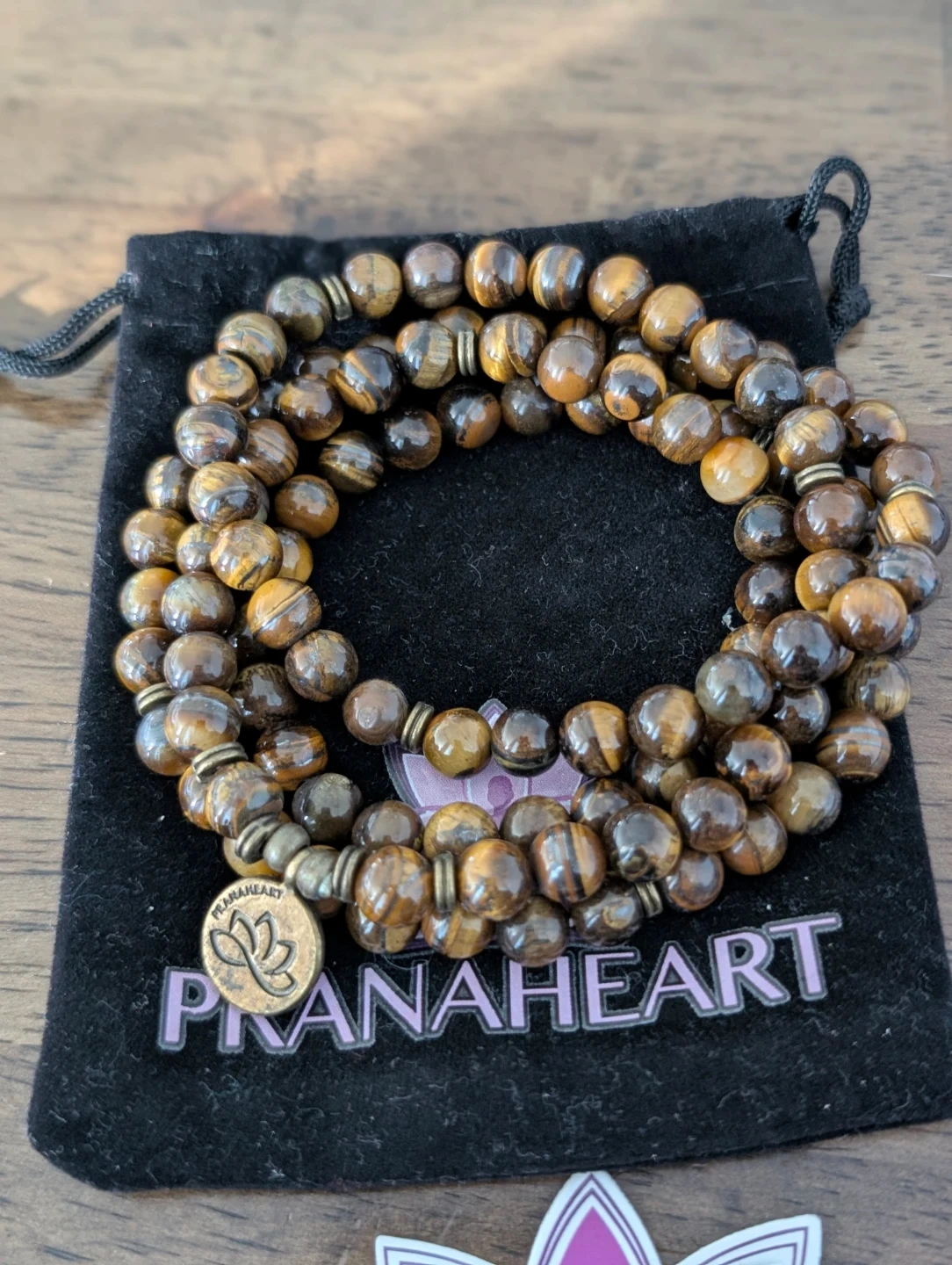 This is a beautiful Mala bead necklace from Prana Heart! It's in great condition and comes with its original pouch. The necklace features tiger's eye beads, known for their grounding and protective properties. Perfect for meditation or everyday wear!