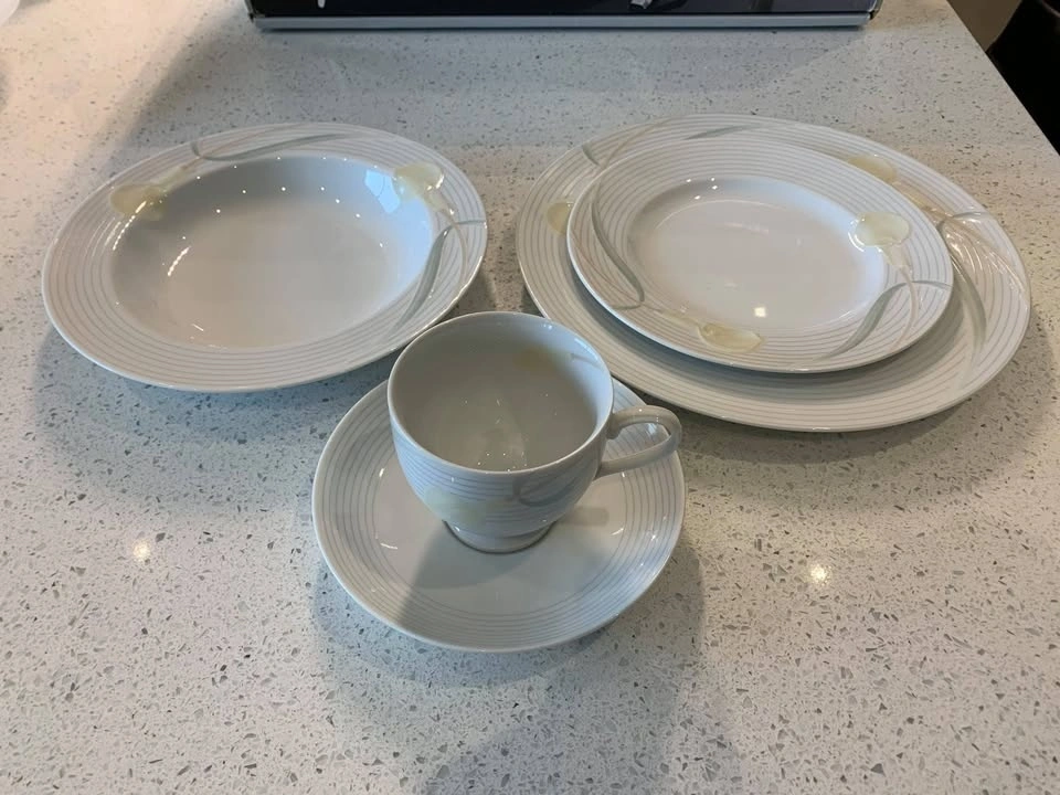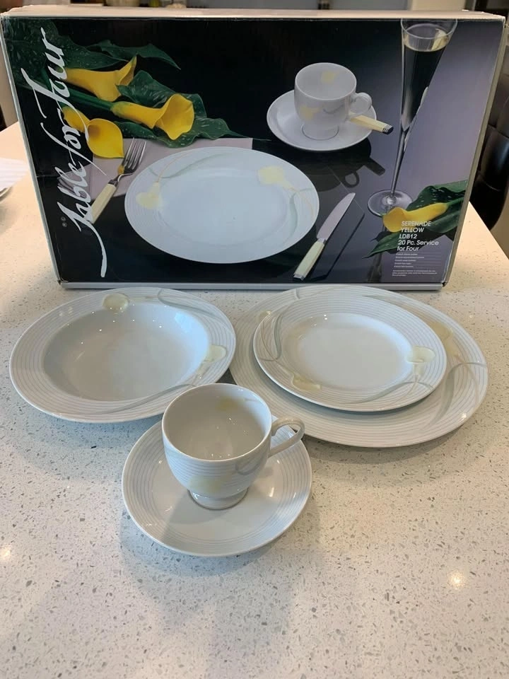 20 pieces: 4 dinner plates, 4 salad dessert plates, 4 soup cereals, 4 tea cups, 4 tea saucers