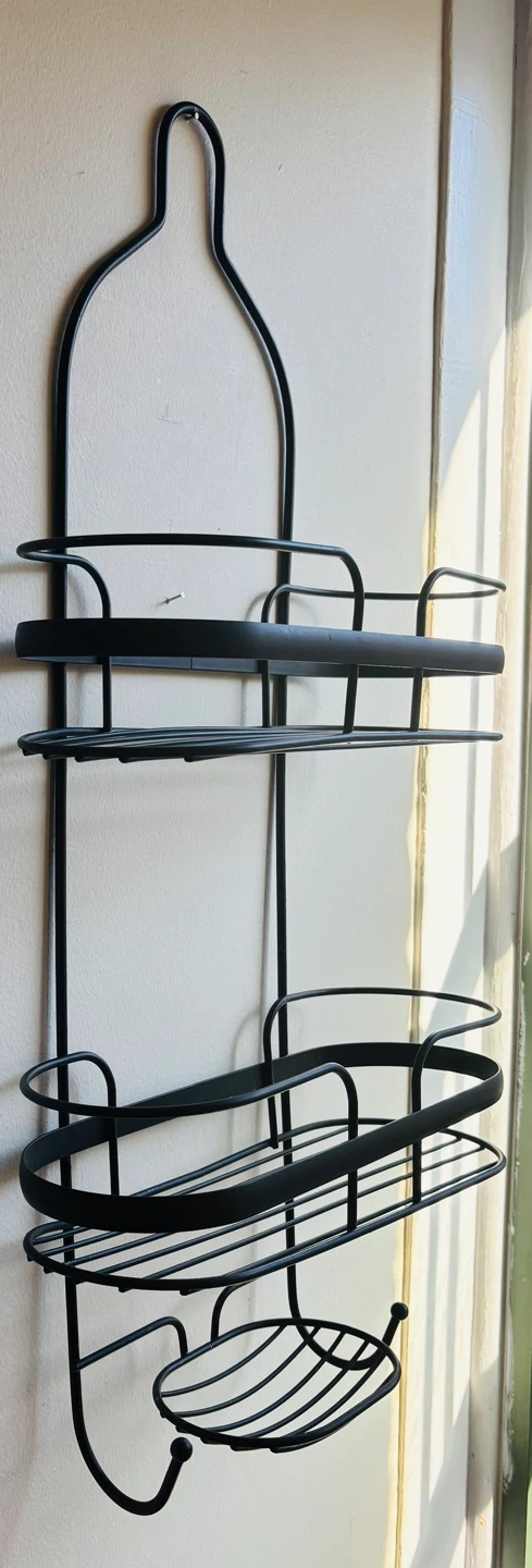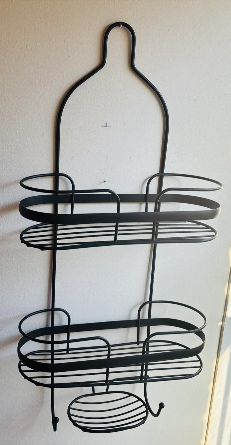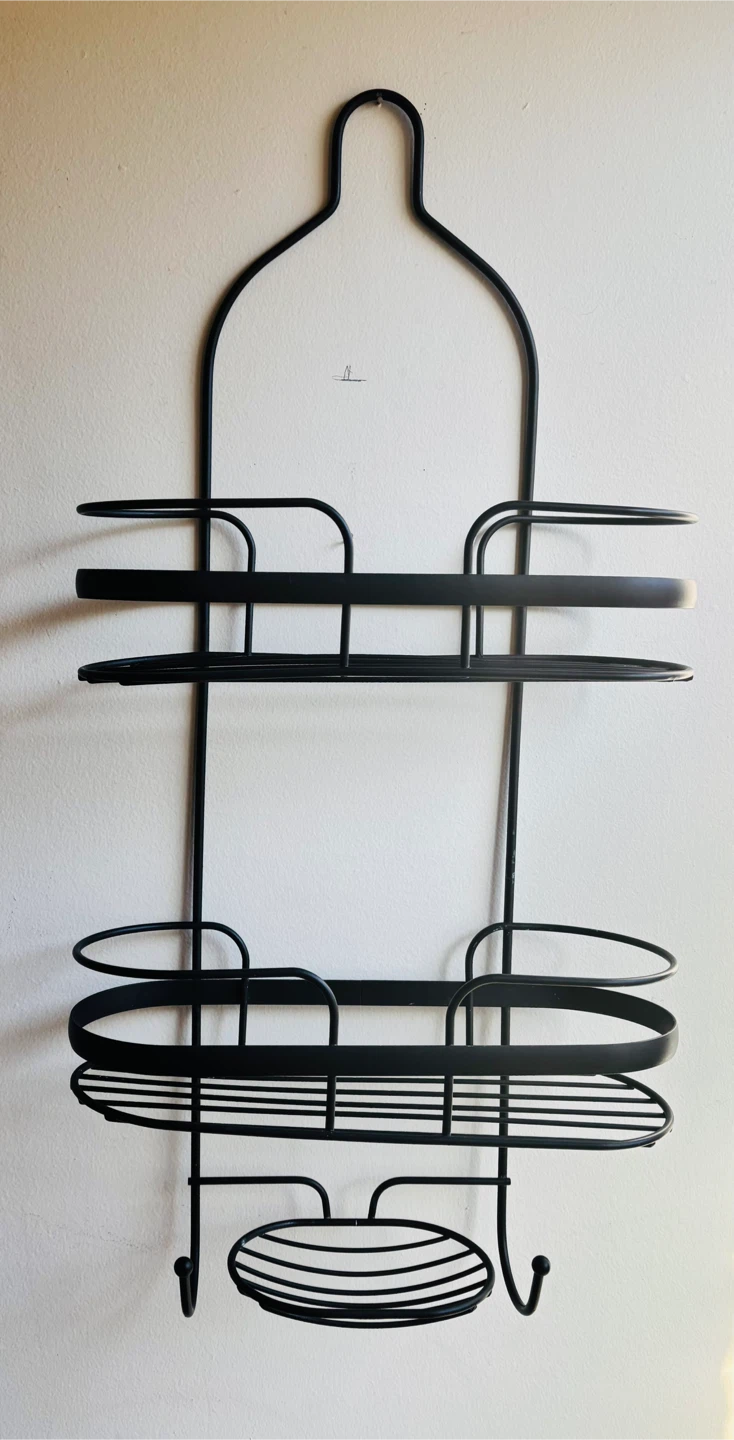 This black metal hanging shower caddy is perfect for organizing your bathroom essentials! It features multiple shelves and a hook for storing shampoo, conditioner, soap, and more. It's in great condition and ready to hang in your shower