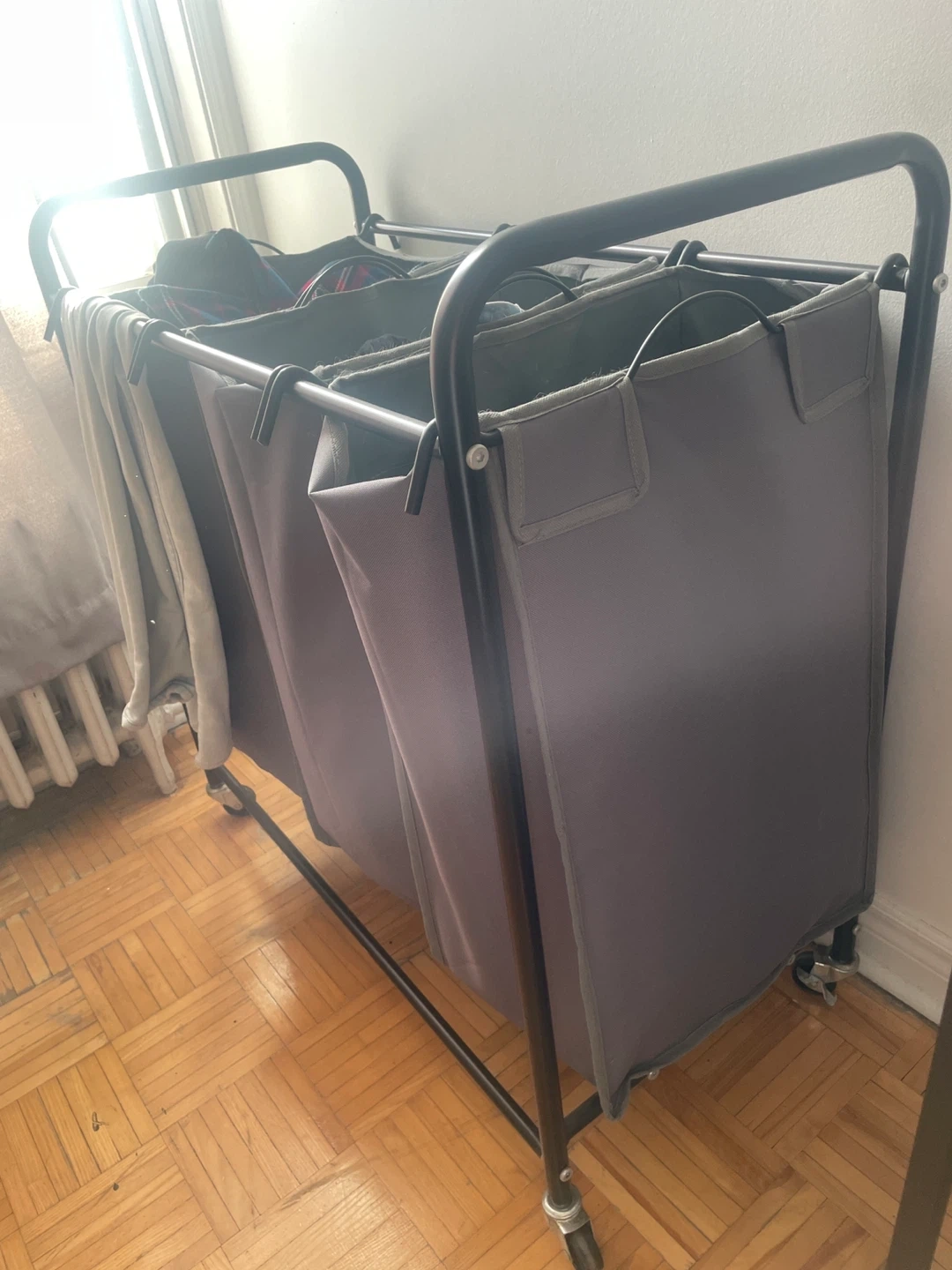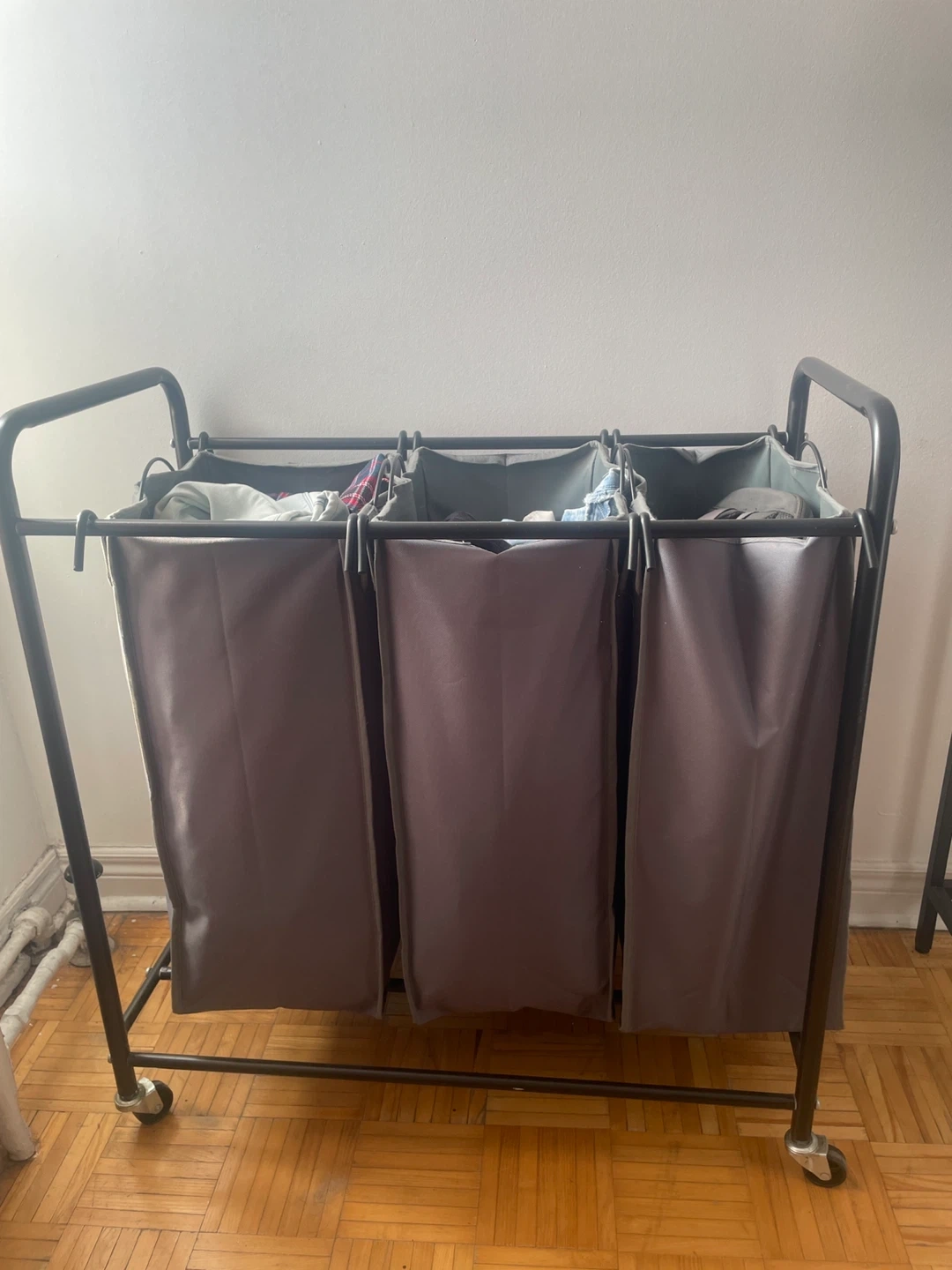 Here's a handy triple laundry sorter cart! It's great for keeping your lights, darks, and colours separate. It has wheels so it's easy to move around your laundry room or closet. It's in good condition and ready to help you stay organized!