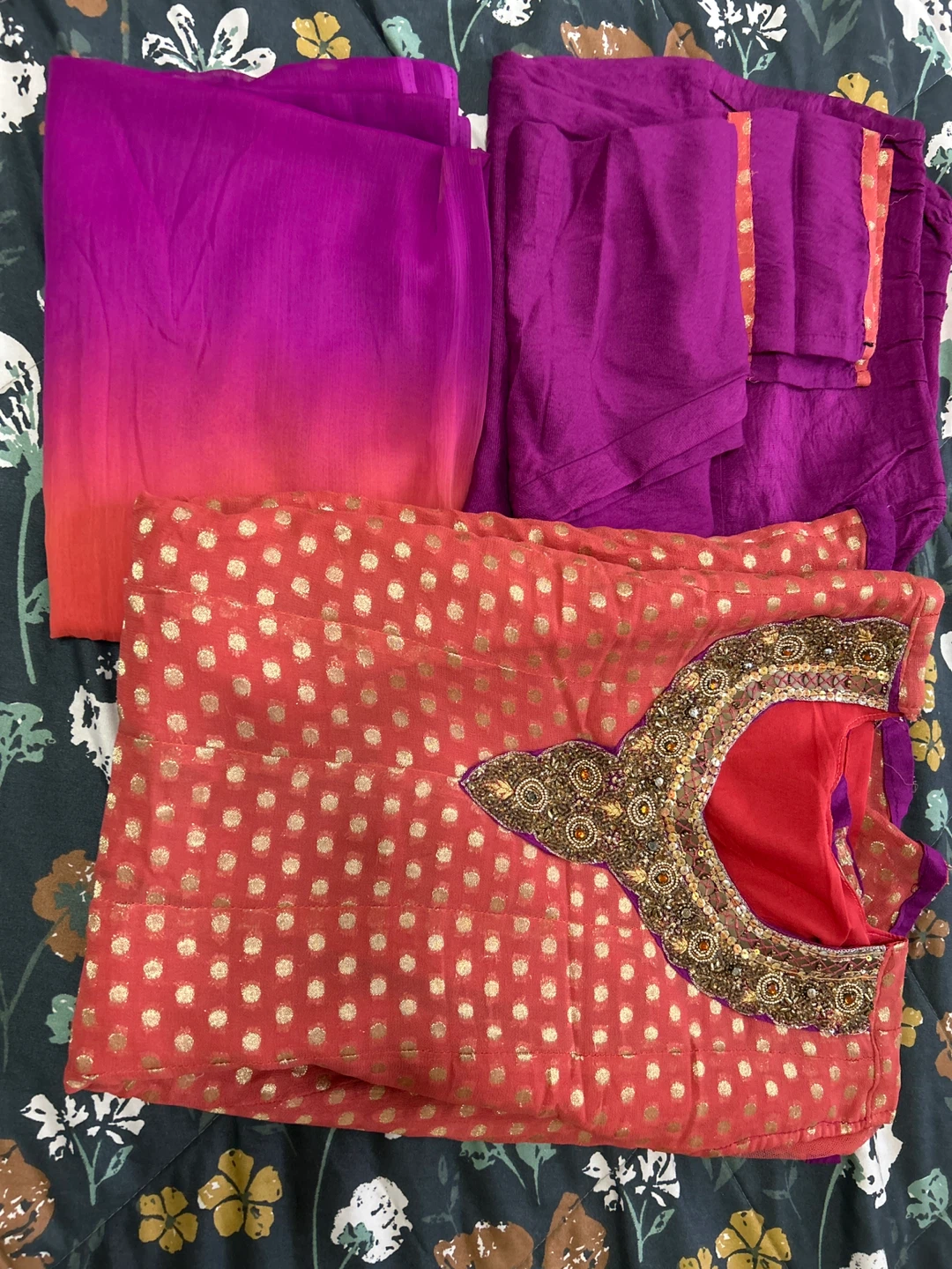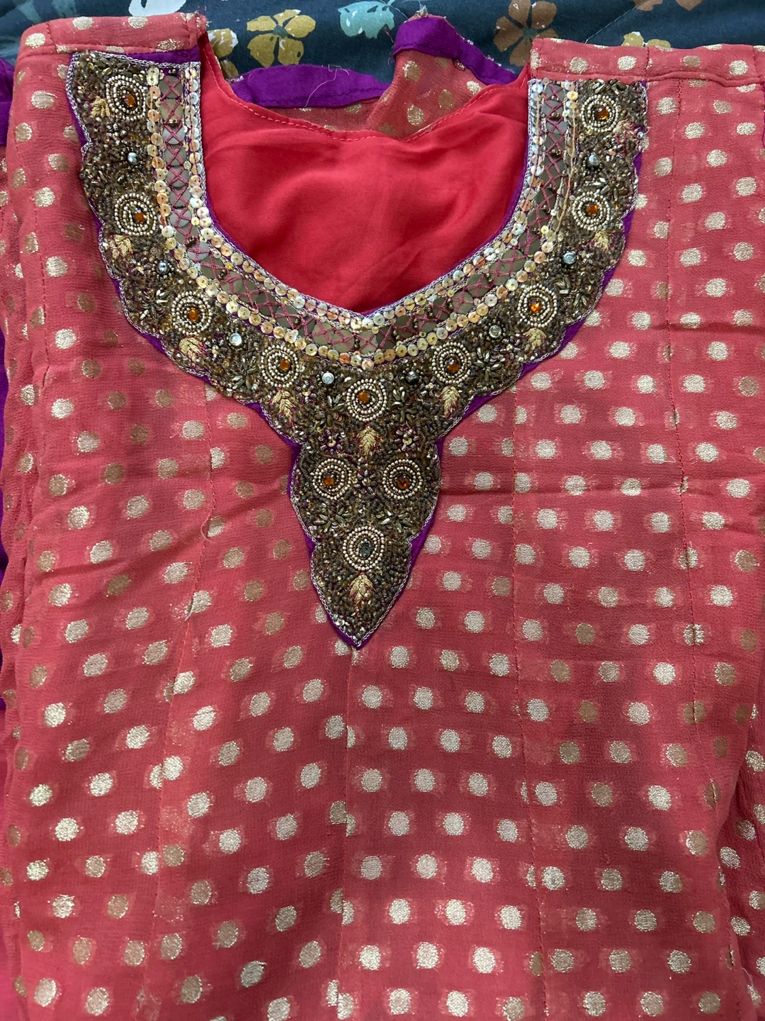 Selling a beautiful Indian salwar kameez suit. It's a vibrant coral colour with gold polka dots and intricate beading around the neckline. Includes the top, pants, and matching dupatta.