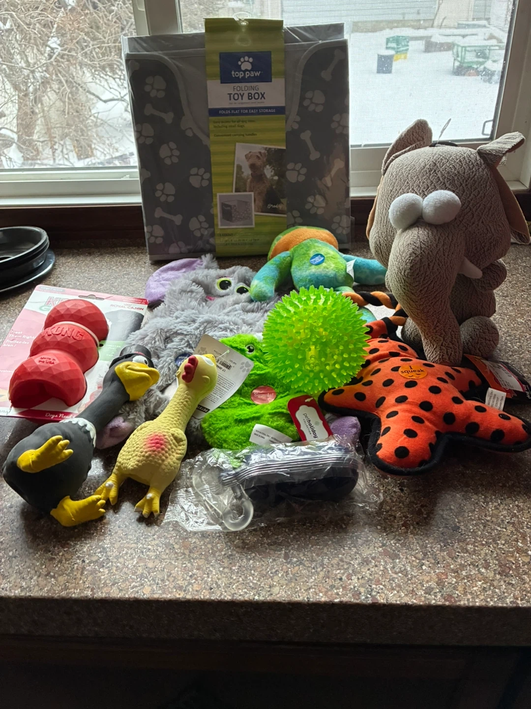Also included are a variety of dog toys, including Kongs, squeaky toys, and plush toys and poop bag holderYour dog will love them! All brand new