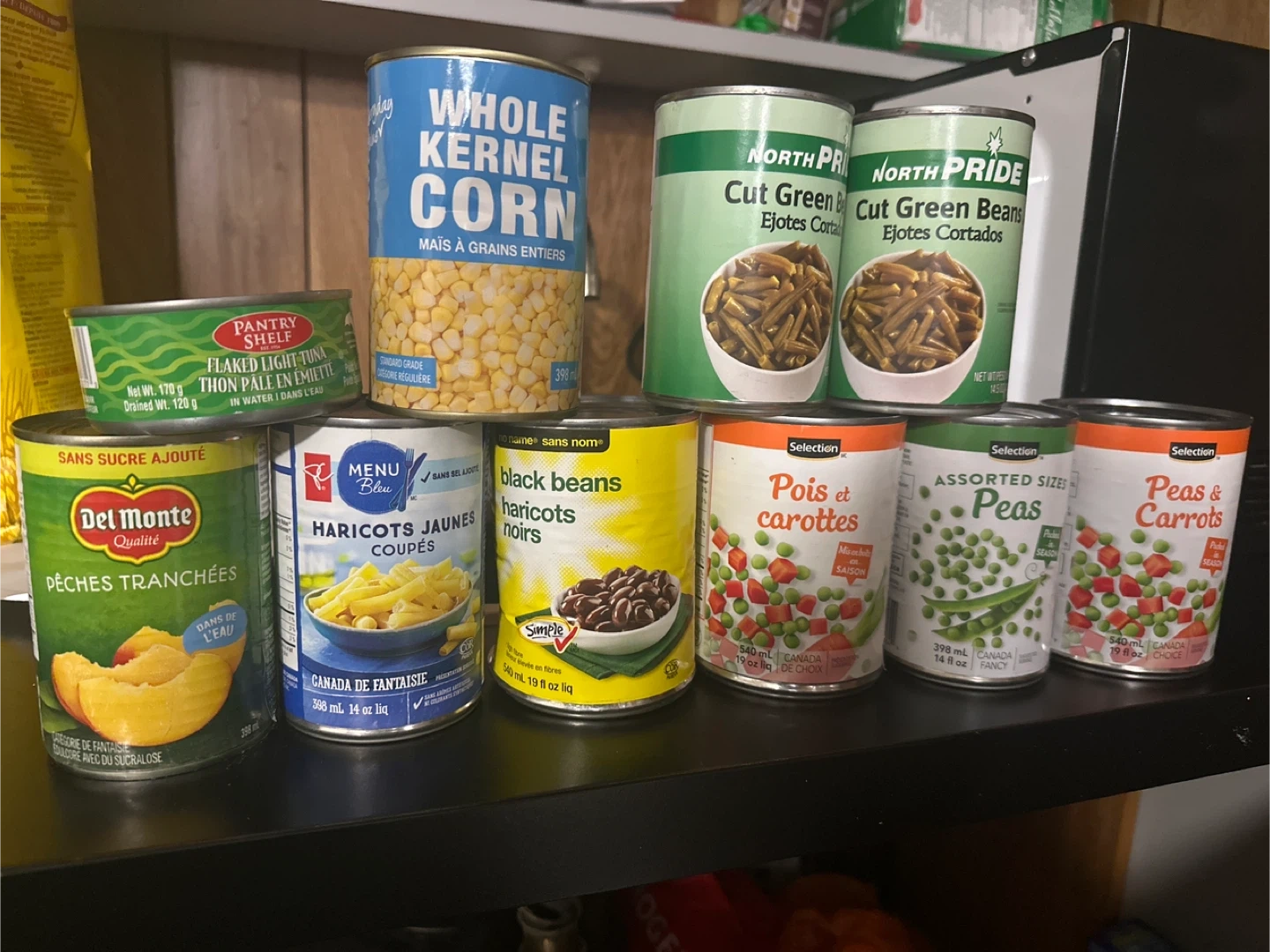 Got a variety of canned goods available! Includes whole kernel corn, cut green beans, flaked light tuna, sliced peaches, yellow beans, black beans, peas and carrots, and assorted peas.