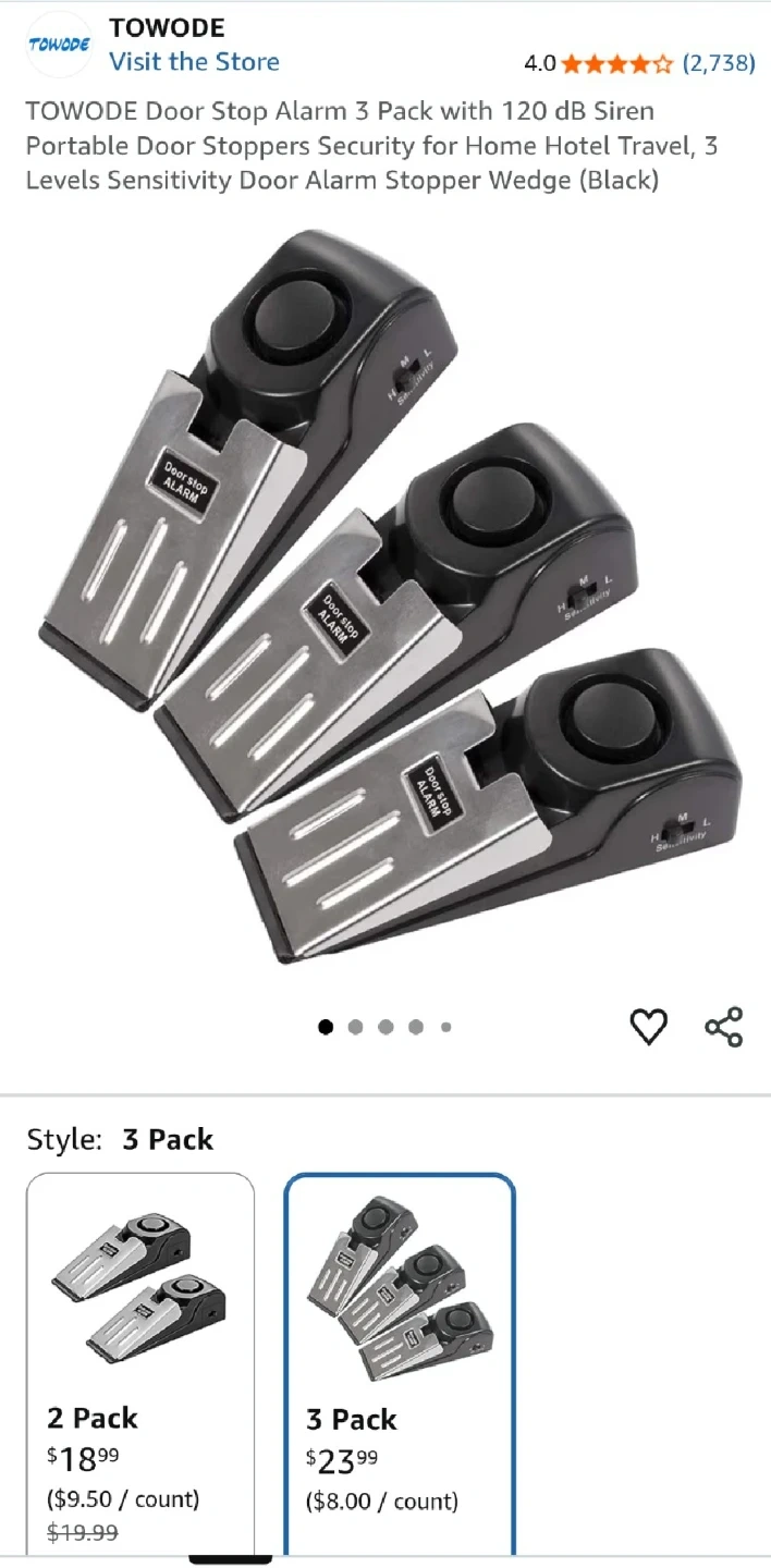 Selling a TOWODE Door Stop Alarm with 120 dB Siren. This portable door stoppers are perfect for security at home or when travelling. They feature 3 levels of sensitivity and function as a door alarm stopper wedge in black. Originally bought for $9