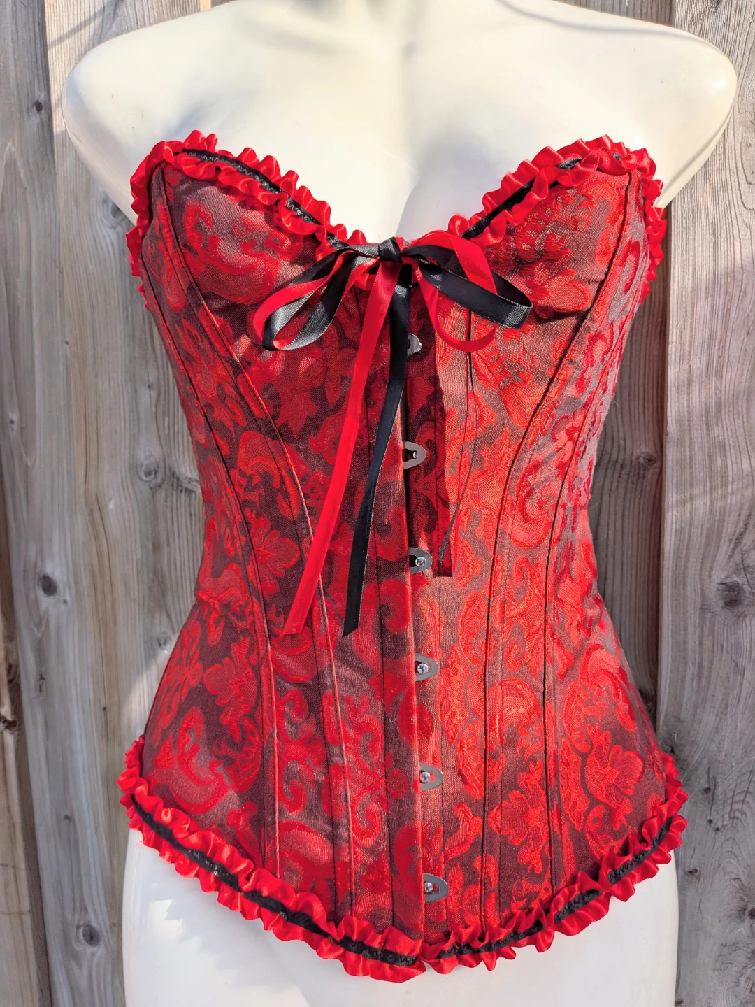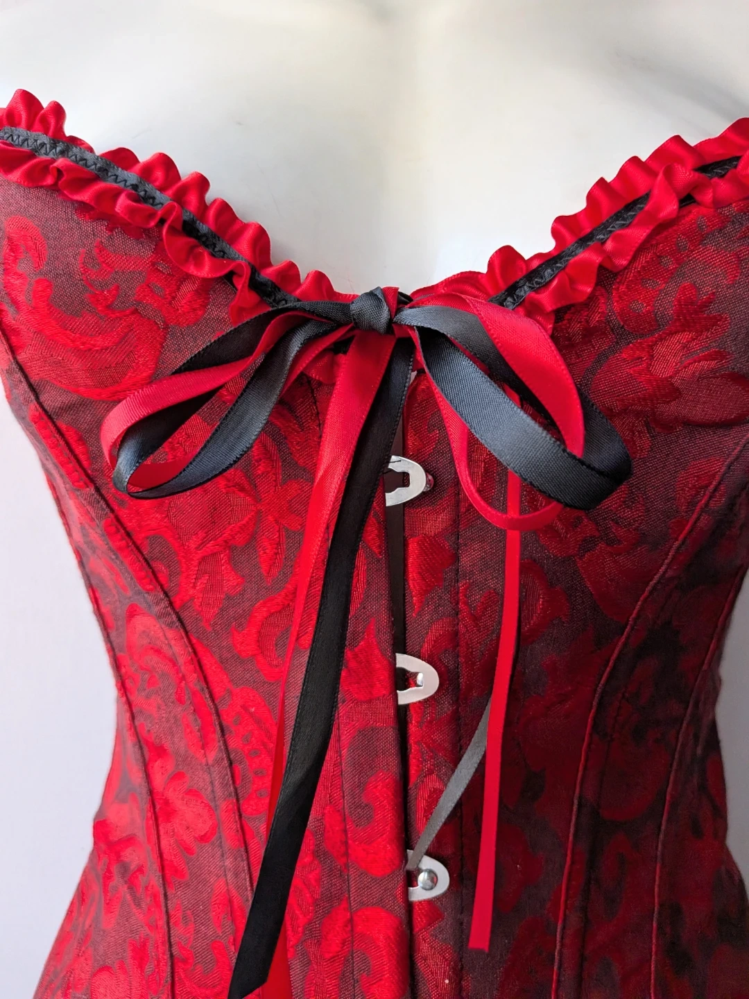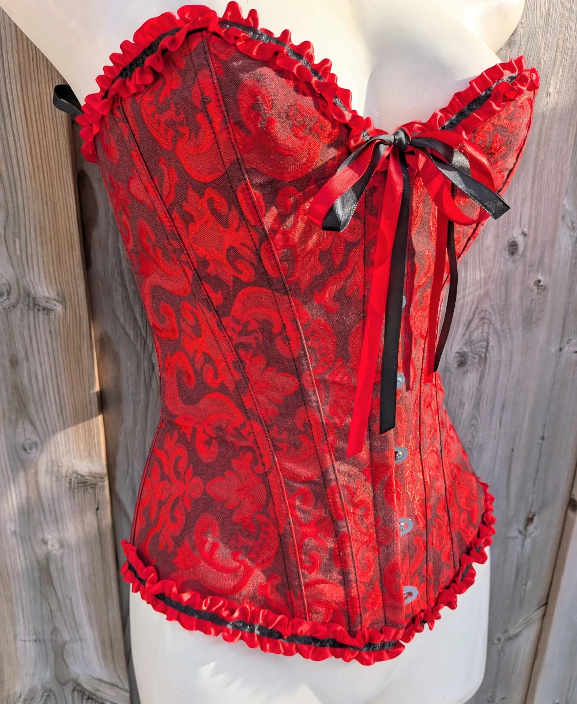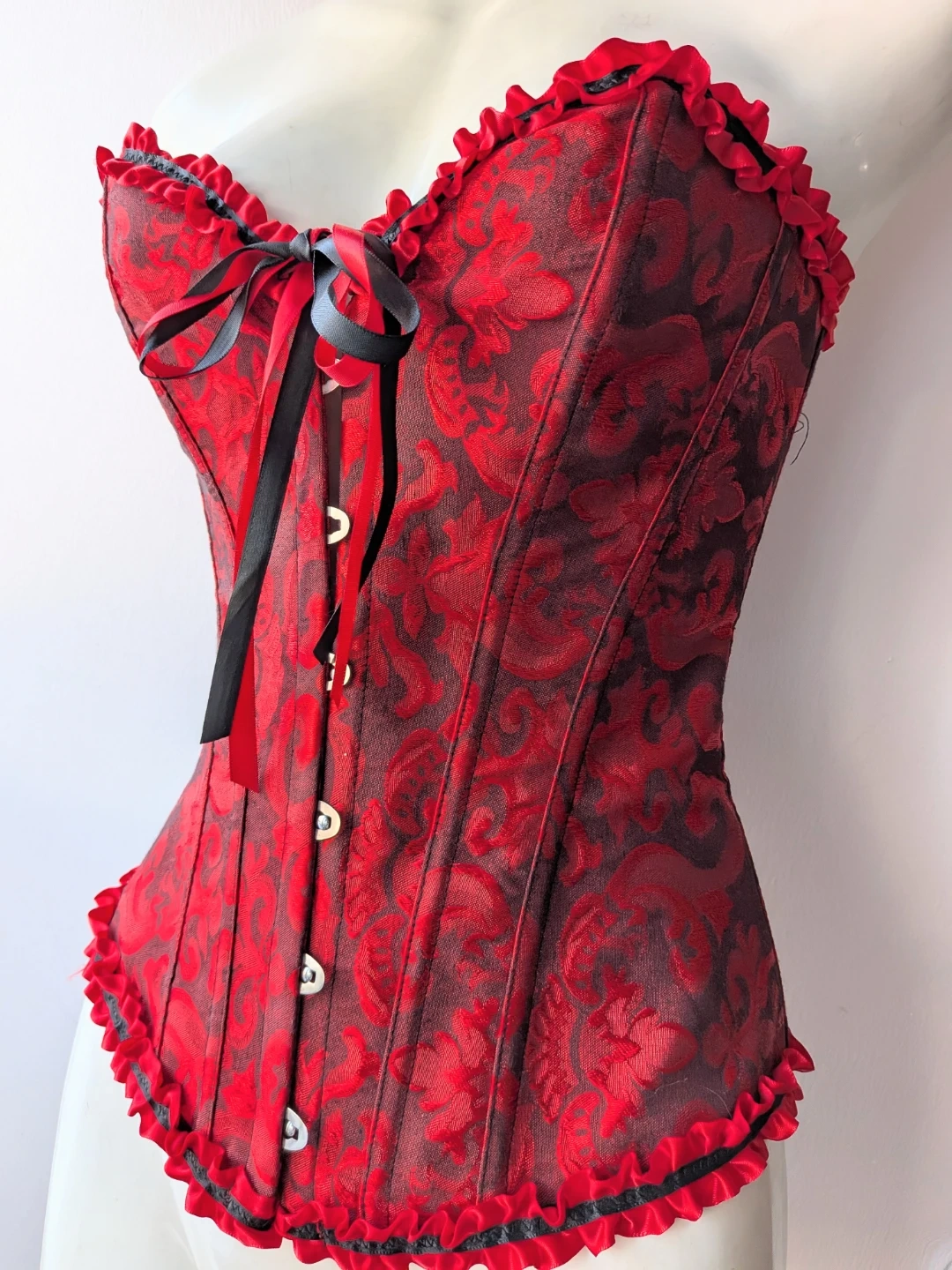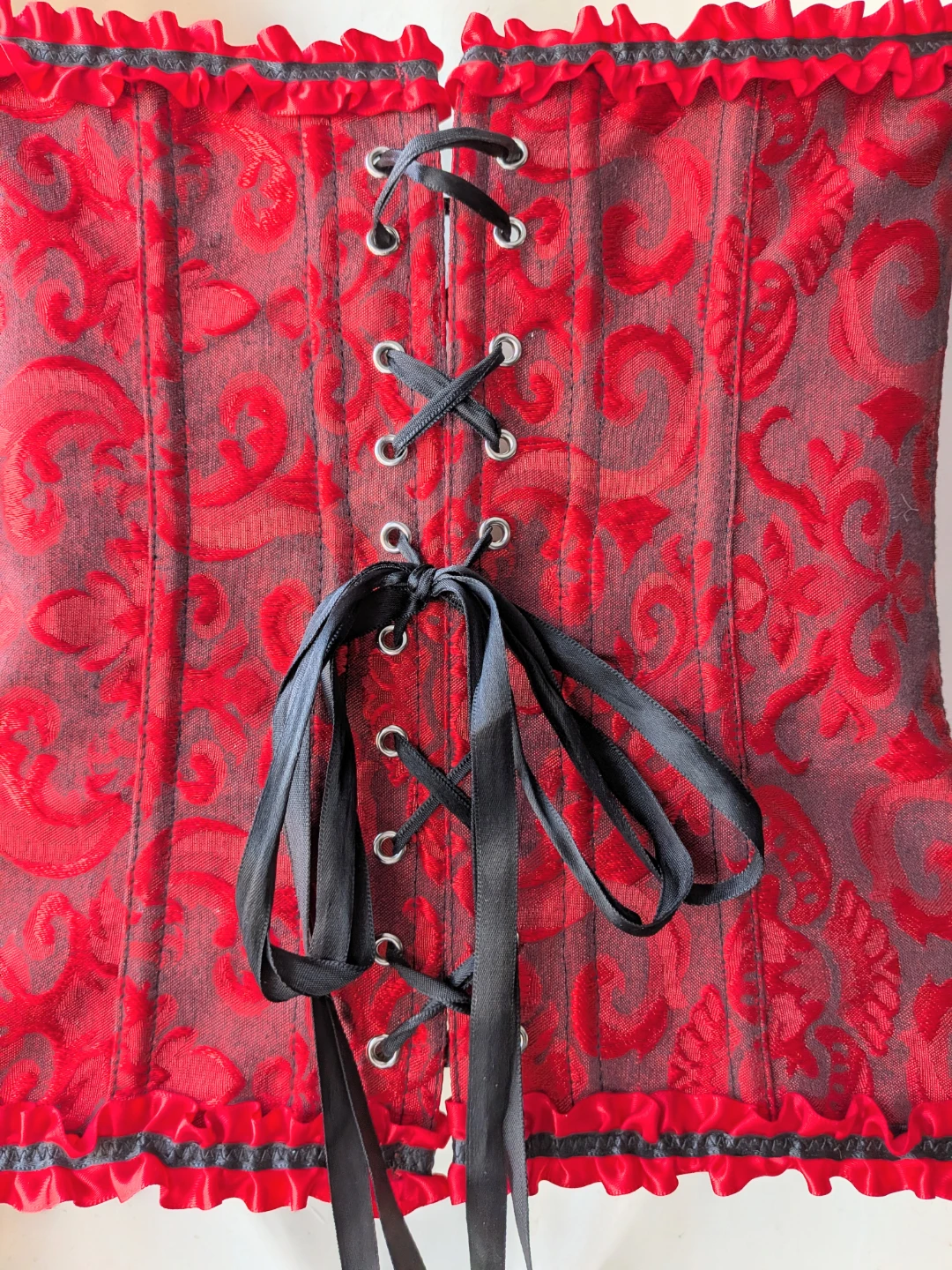 Here's a beautiful red and black corset! It features a lovely floral pattern and ribbon detailing. Perfect for adding a touch of elegance to any outfit