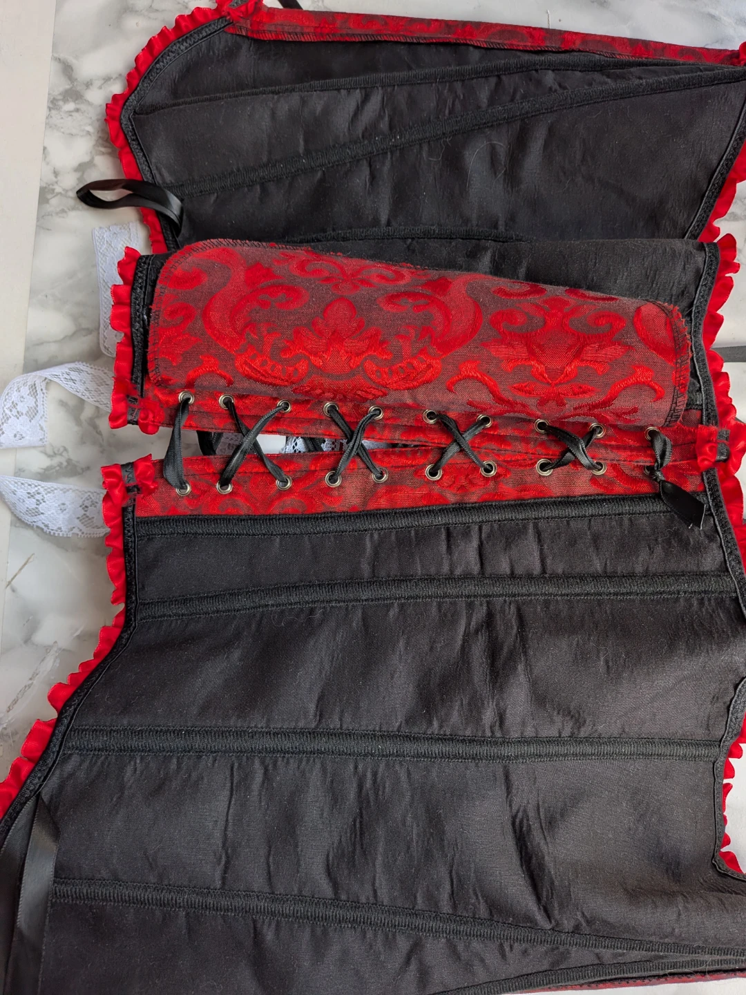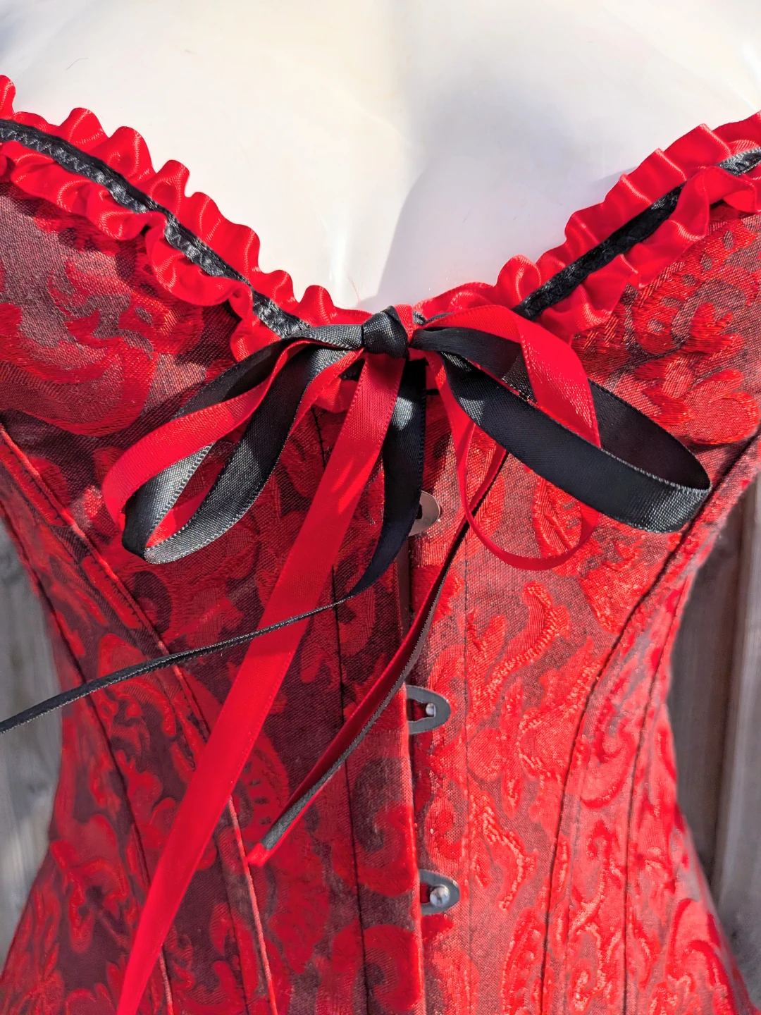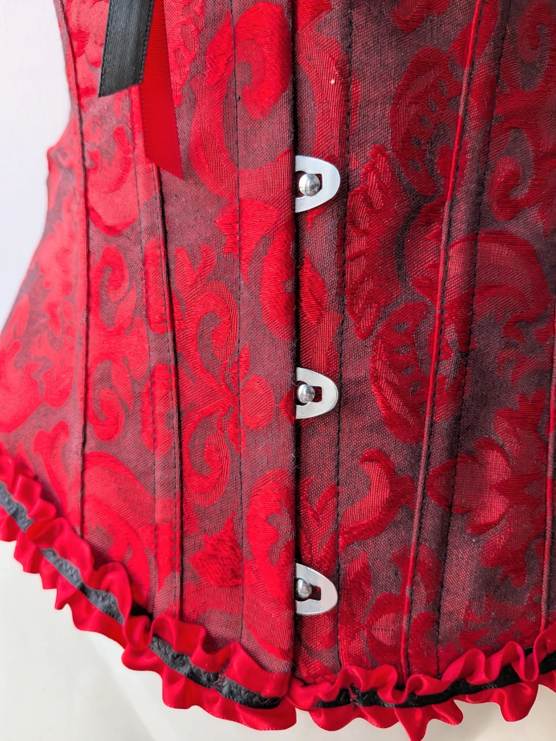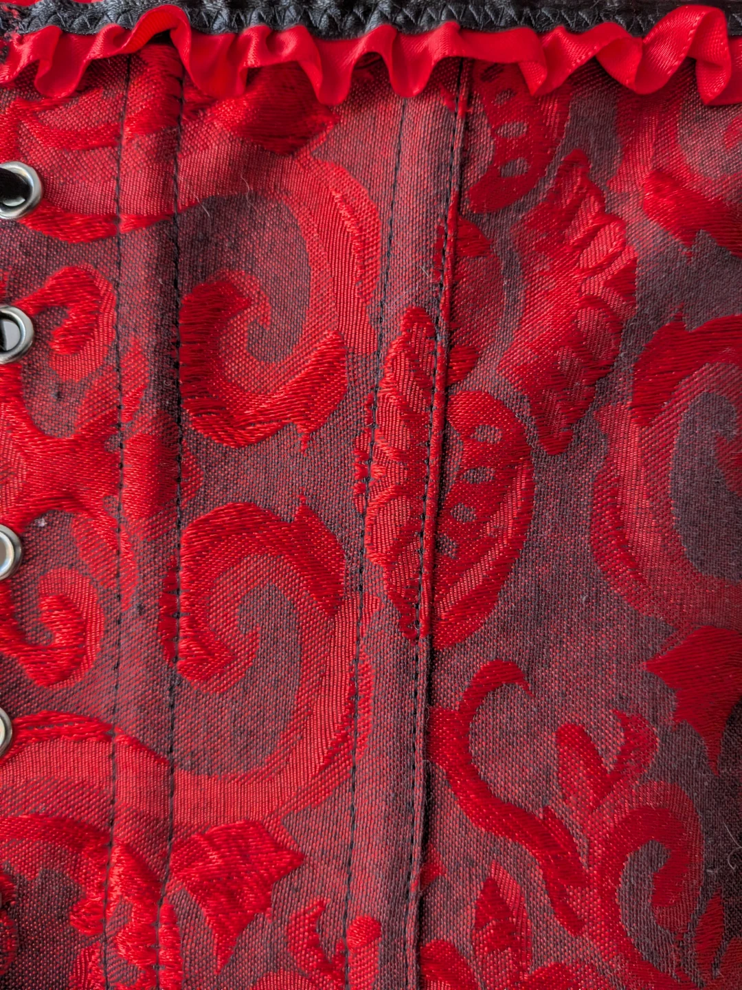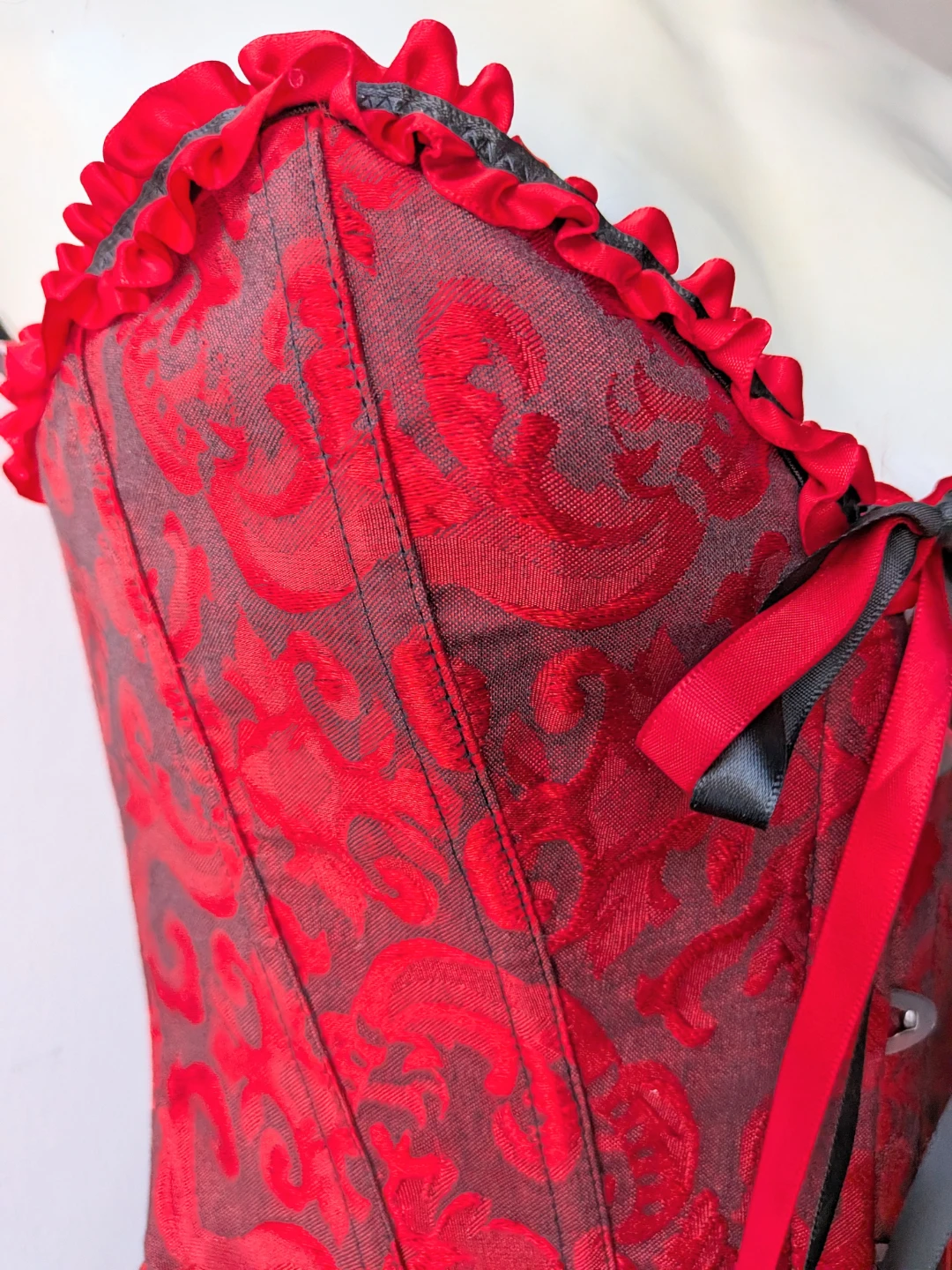 Here's a beautiful red and black corset! It features a lovely floral pattern and ribbon detailing. Perfect for adding a touch of elegance to any outfit