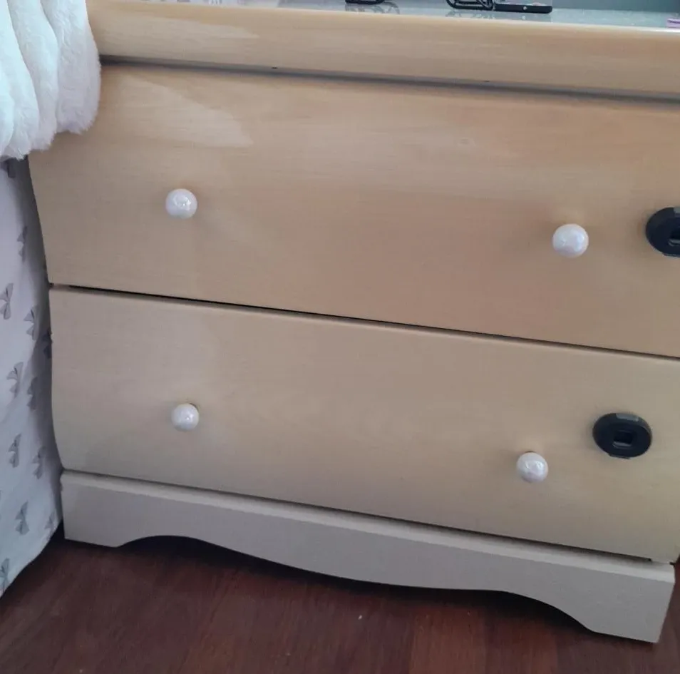 Here's simple wooden nightstands with two drawers. It's perfect for a kid's room or as extra storage in any space. These have a light wood finish and cute round knobs.