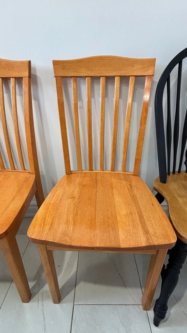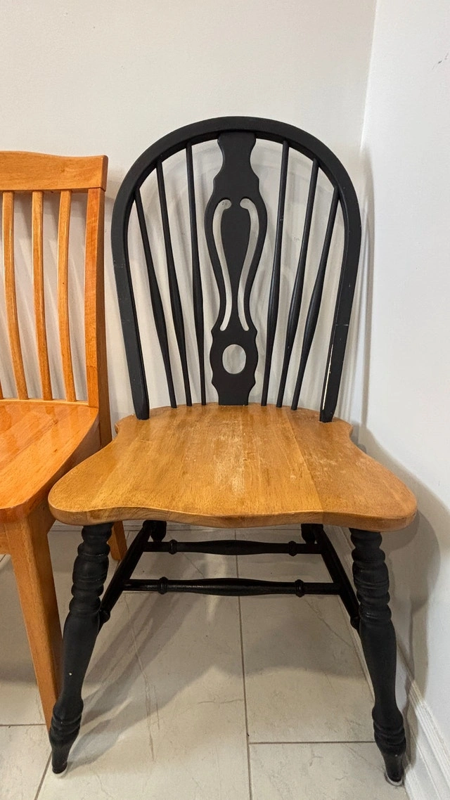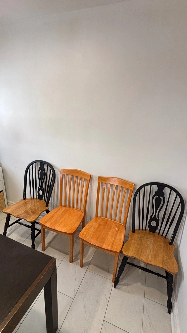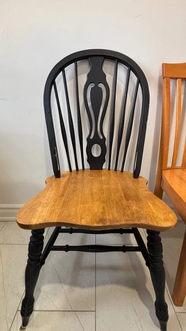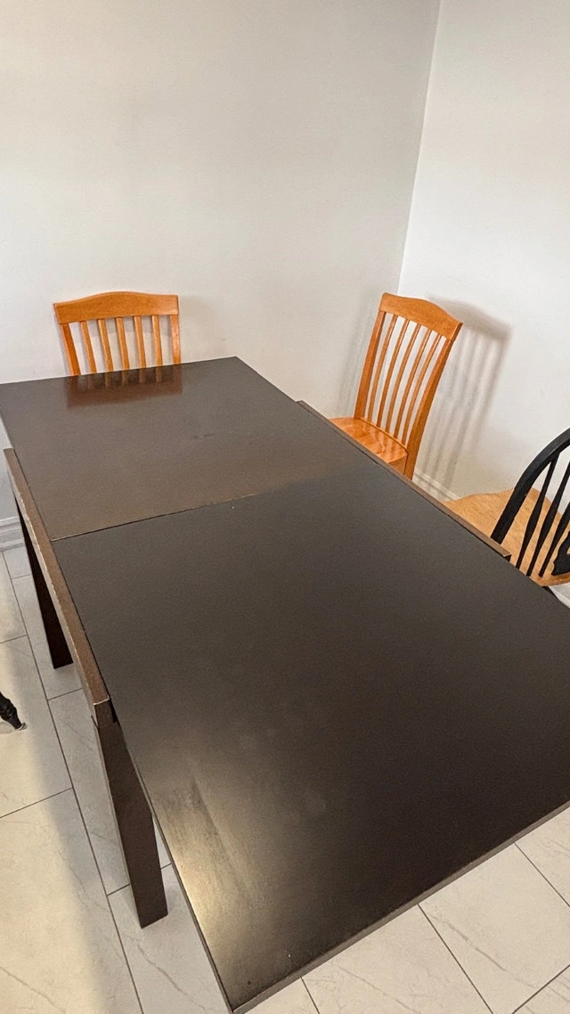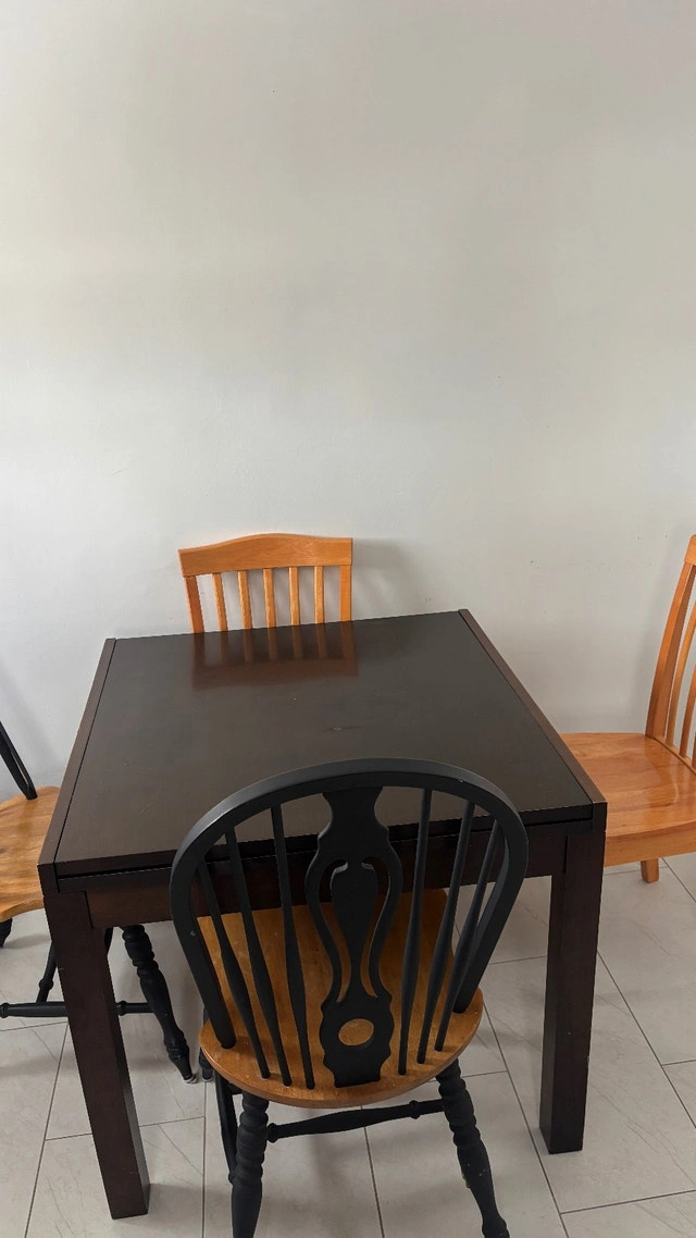 Selling a solid wood extendable dining table with 4 chairs (2 black + 2 natural wood). Great for everyday use. Details: